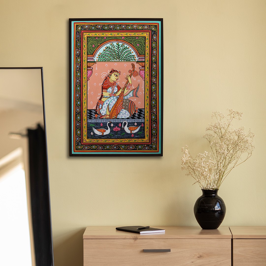 The painting beautifully captures Mirabai's serene devotion while playing the veena, a stringed instrument often associated with spiritual expression. The presence of swans, often considered sacred in Hindu mythology, adds another layer of symbolic meaning. Swans are frequently associated with purity, grace, and spiritual enlightenment. The lotus flowers at the base of the painting reinforce these themes, symbolizing beauty, purity, and spiritual awakening. The calm, peaceful demeanor of Mirabai as she is immersed in her music reflects her deep connection with the divine, emphasizing the core message of Bhakti - the path of devotion. The artistic choices in this piece seamlessly combine aesthetic appeal with deep spiritual significance, making it a work of art that is both beautiful and thought-provoking.