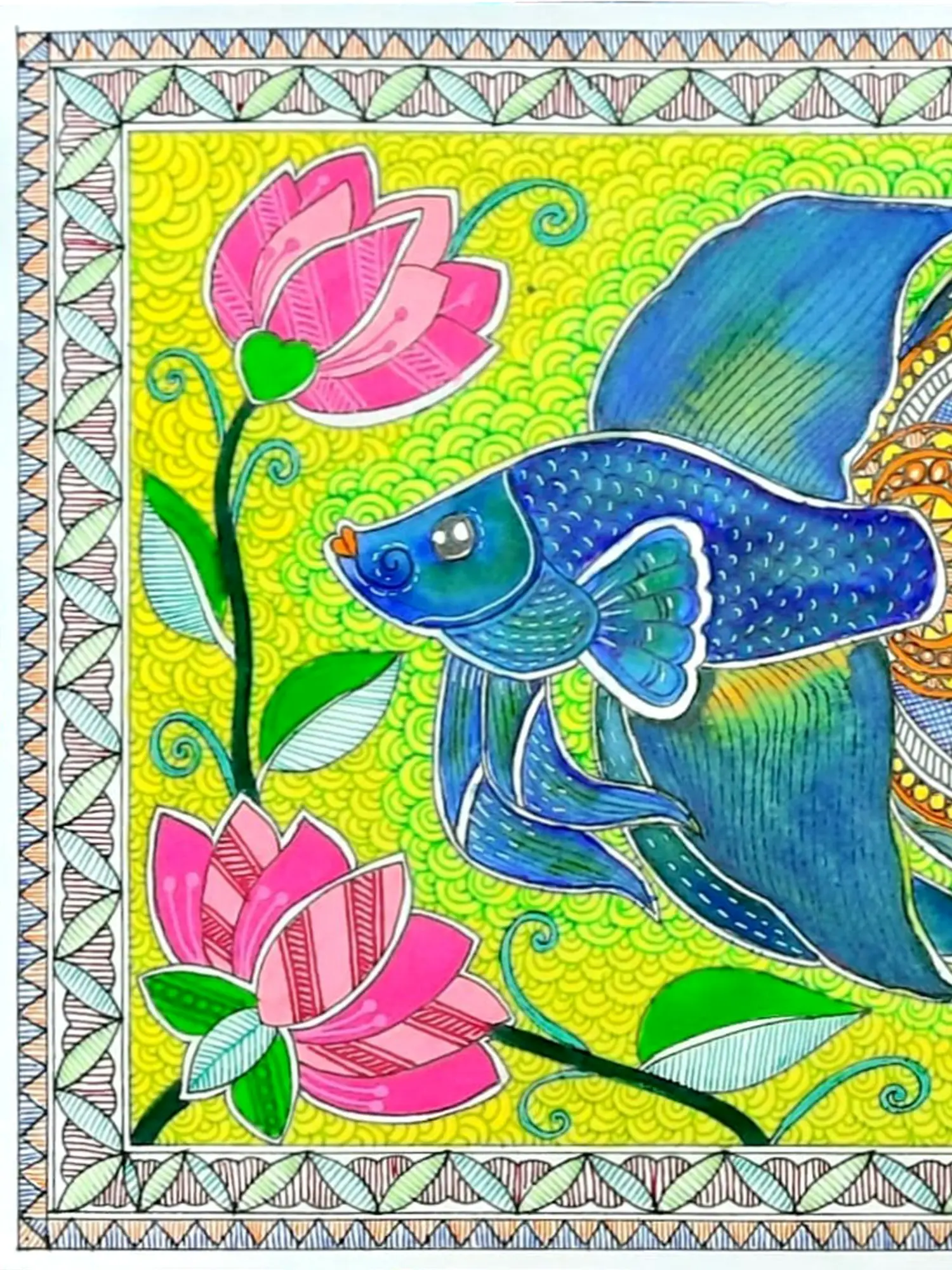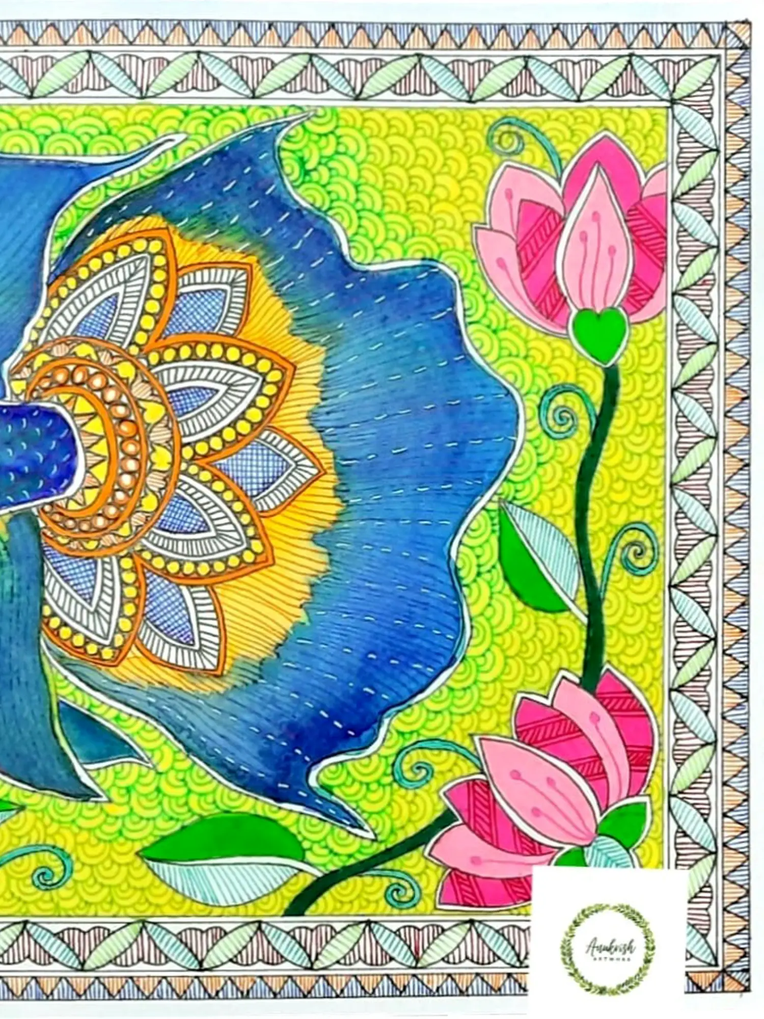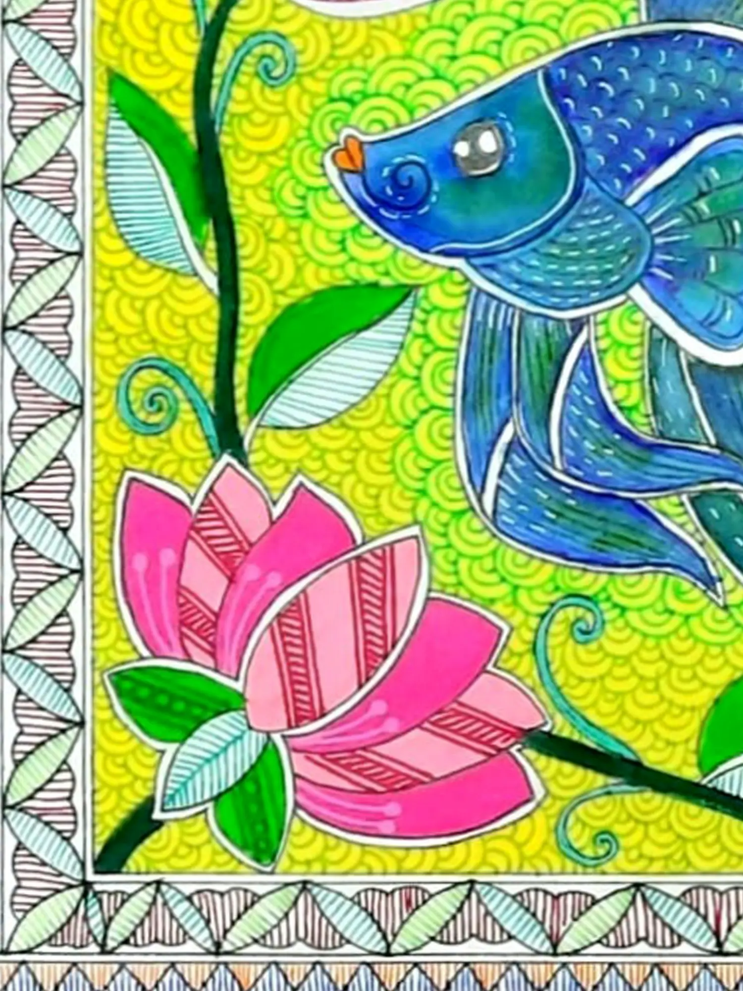 Lotuses emerging from the frame's side introduce a touch of symbolism and cultural richness. Chetansi's skillful use of color and detailing transforms this artwork into a visual celebration of aquatic beauty, reflecting both artistic finesse and cultural depth.