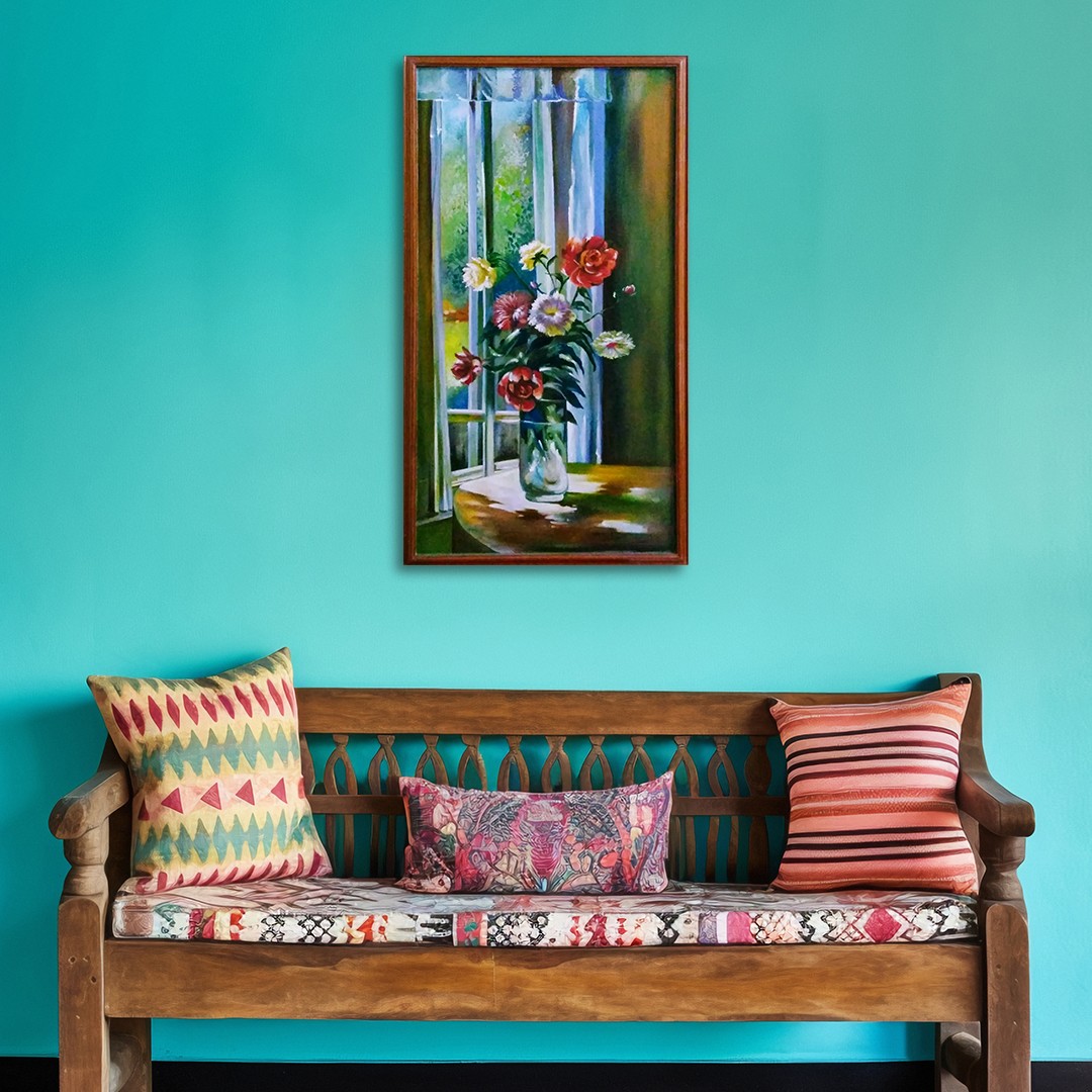 This vibrant acrylic on canvas painting, "Morning Vibes - Still Life," by the talented Yogita Makadia, captures the essence of tranquility and the beauty of nature's simplest gifts. The artwork depicts a lush bouquet of flowers, their colors bursting with life, nestled in a clear glass vase. Sunlight streams in from a nearby window, illuminating the scene with a gentle warmth that invites contemplation. The soft hues of the curtains and the rich tones of the wooden table create a harmonious composition that is both captivating and calming. The artist's skill in capturing light and shadow adds depth and realism, transforming the simple act of arranging flowers into a visual poem. The 24-inch height and 20-inch width of the framed piece makes it a perfect statement for any room, instantly enhancing its ambiance.