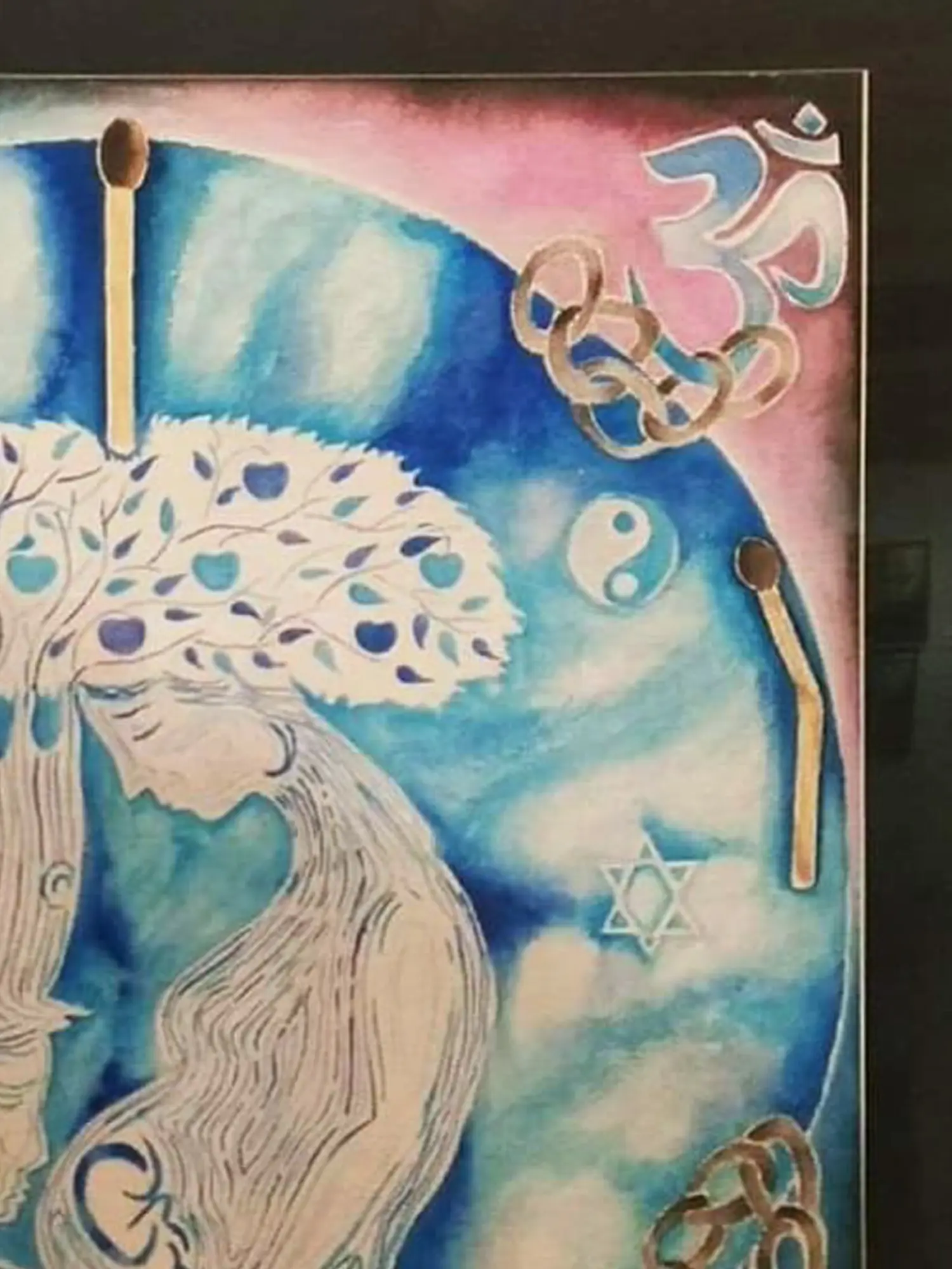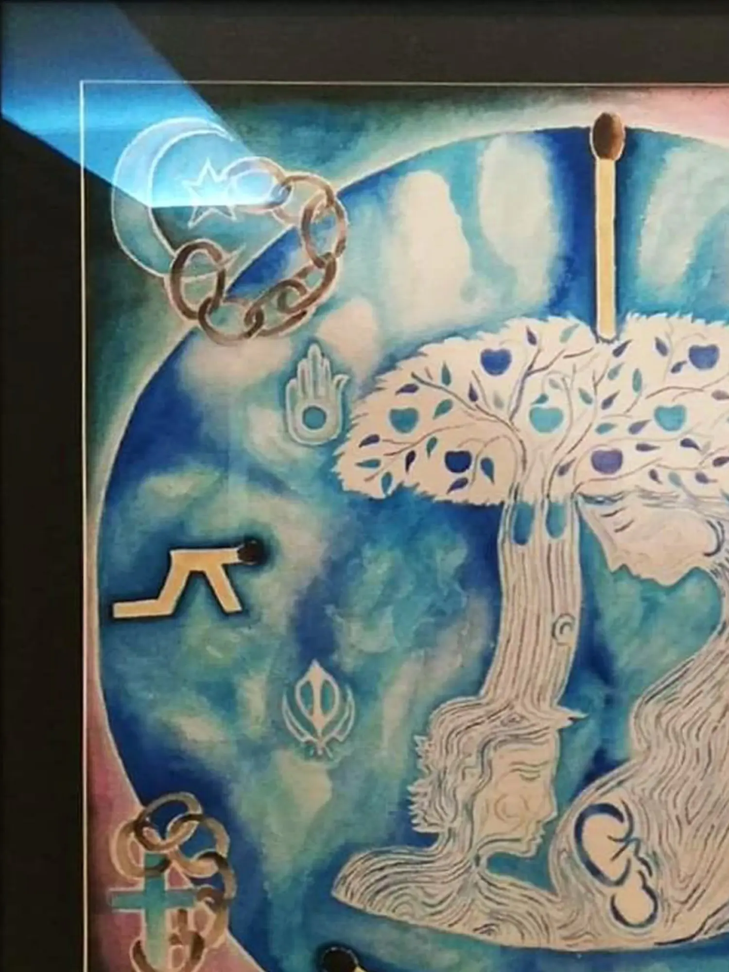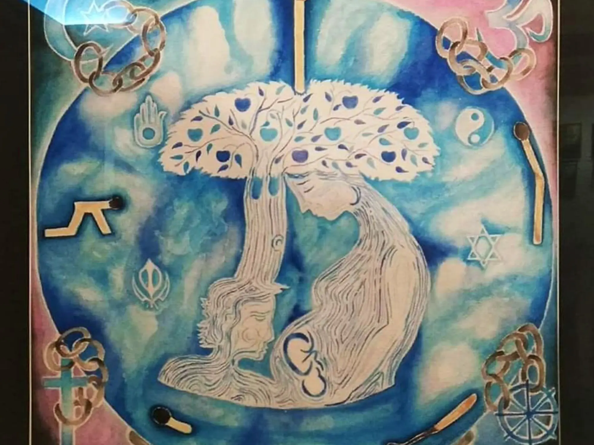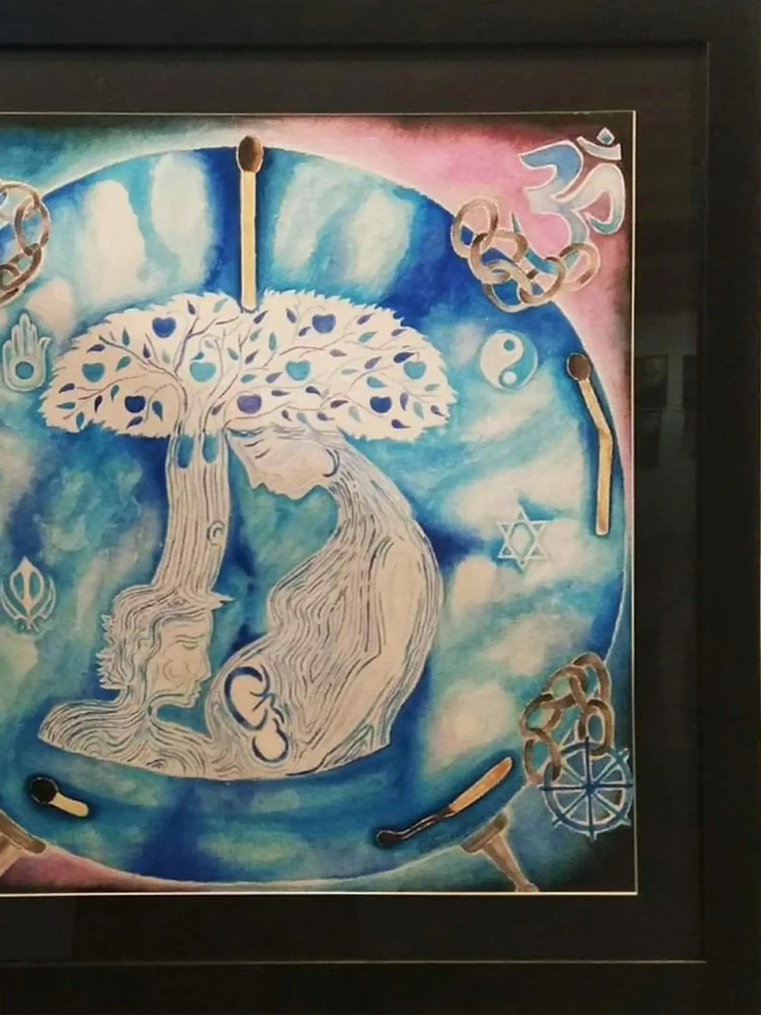The artwork presents a compelling visual metaphor, depicting a pregnant mother cradling her unborn child, framed by symbols of diverse faiths and interconnectedness. Notice the Tree of Life, its branches adorned with delicate blue hearts, symbolizing love and growth, emanating from a central, nurturing form. Encircling this core are representations like the Om, Crescent Moon and Star, Star of David, and the Khanda, suggesting a universal reverence for life and spiritual harmony. The yin and yang symbol further underscores the balance inherent in creation. The composition itself, with its circular motif, hints at the cyclical nature of existence and the cosmic dance of life.