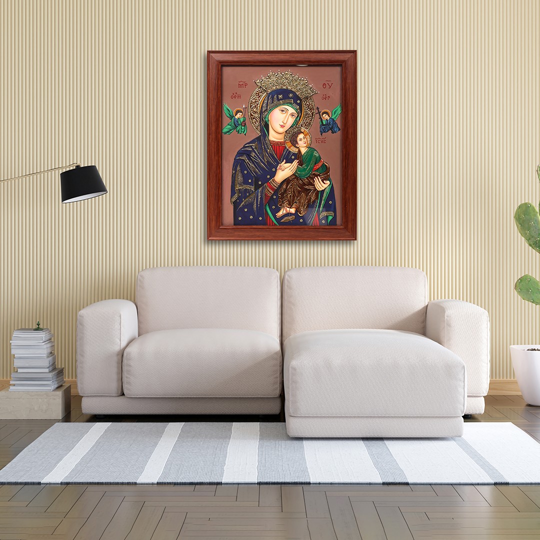 Encompassed within the protective frame, the canvas reveals a tender tableau of Mother Mary cradling Baby Jesus in her arms. Their ethereal connection transcends the earthly realm, radiating love, compassion, and divine protection. This Tanjore piece makes you delve into the depths of devotion, spirituality, and the eternal bond between a mother and her child.