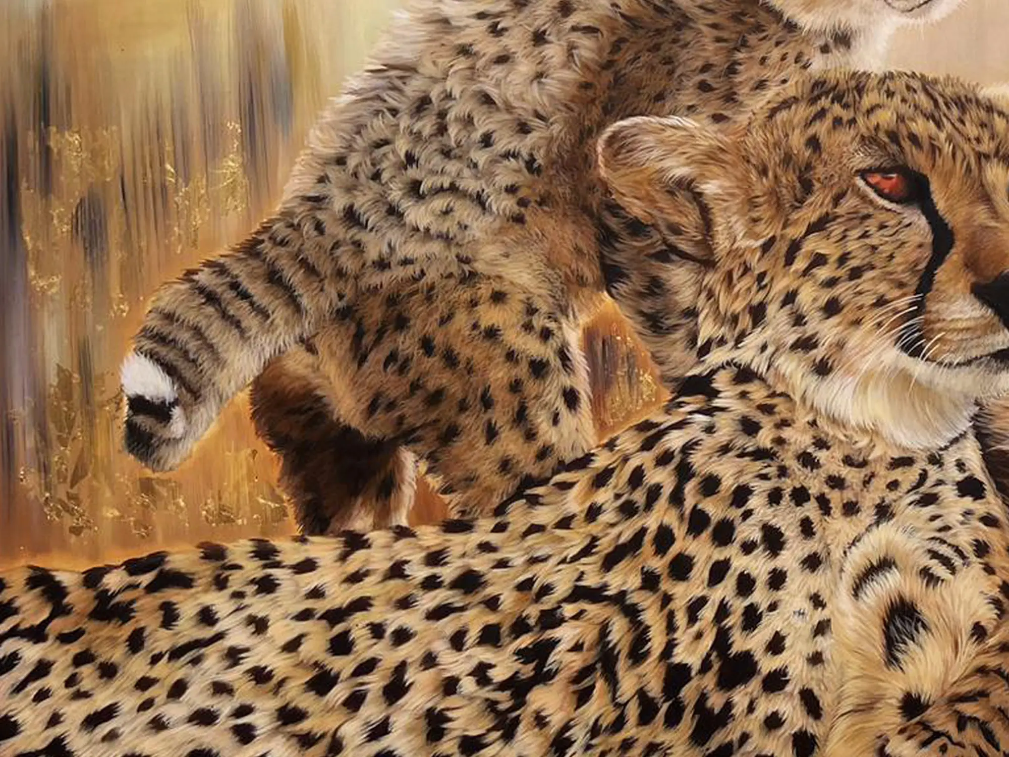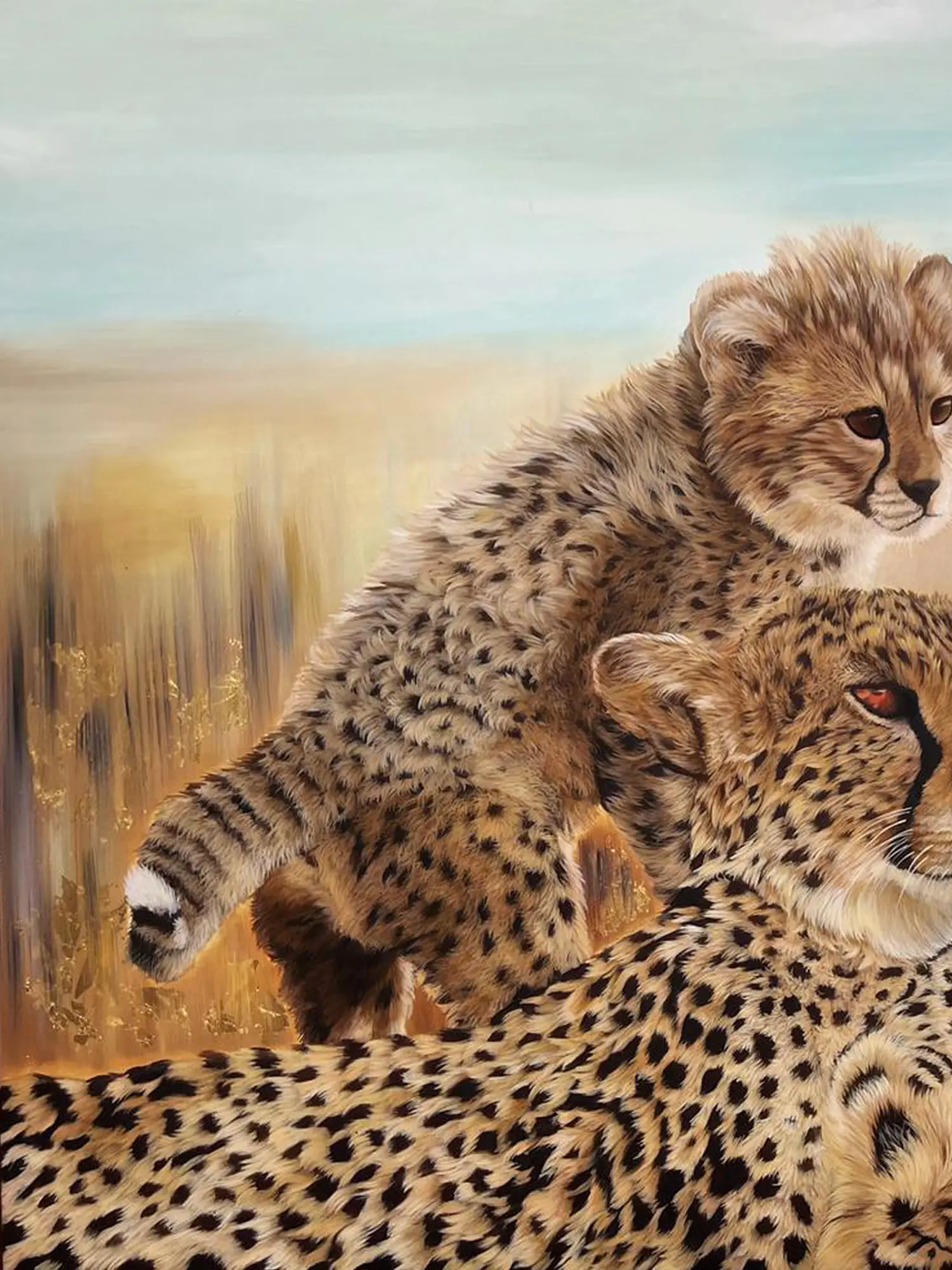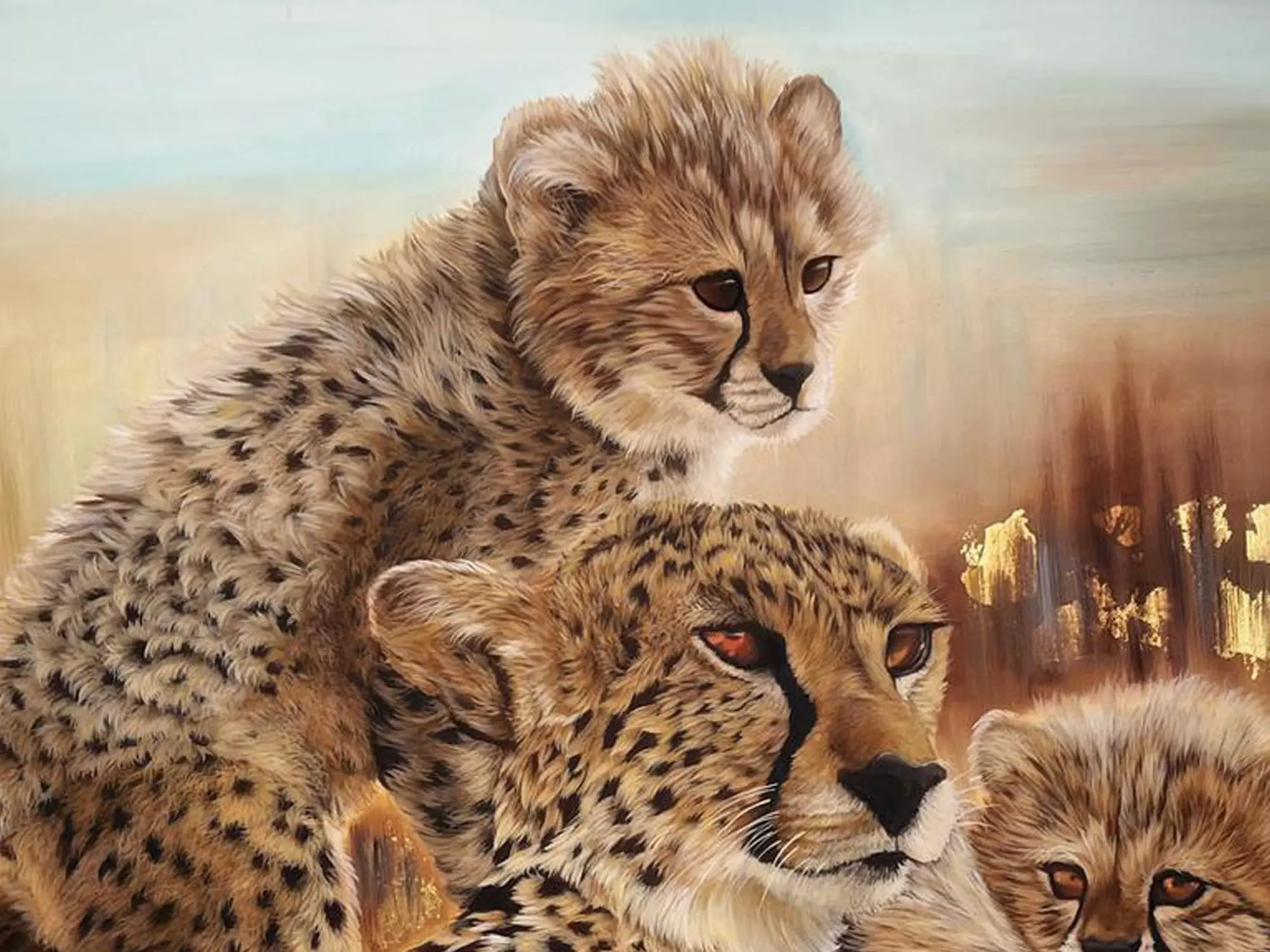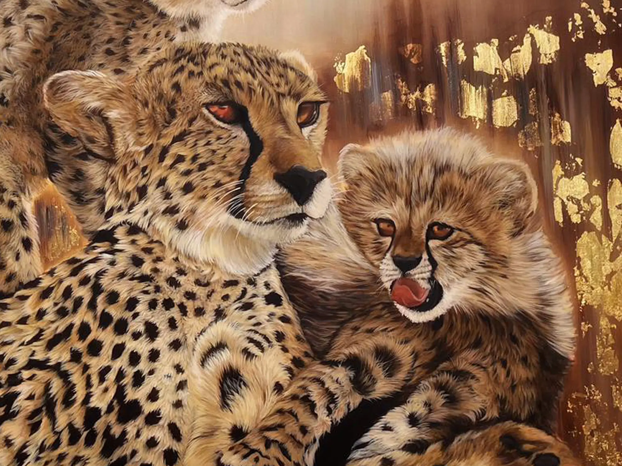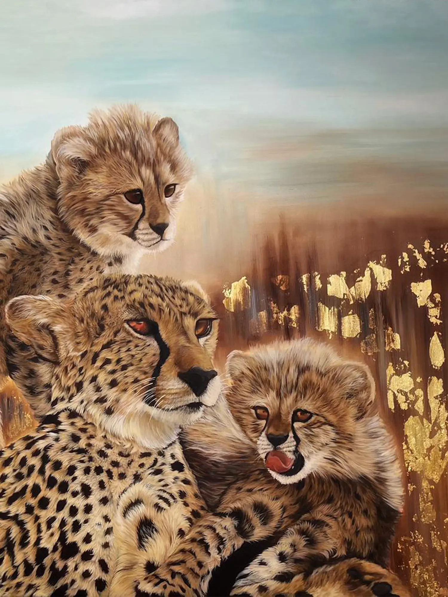 Observe the intricate details that elevate this work to a level of unparalleled sophistication. The mother leopard's piercing gaze, filled with vigilant affection, draws you into the scene, while the curious expressions of her cubs evoke a sense of wonder and innocence. The expansive canvas, measuring 45 by 45 inches, provides ample space for these magnificent creatures to command attention, their forms rendered with a lifelike luminescence against a subtly textured background, accented with shimmering gold leaf that hints at the preciousness of this moment.