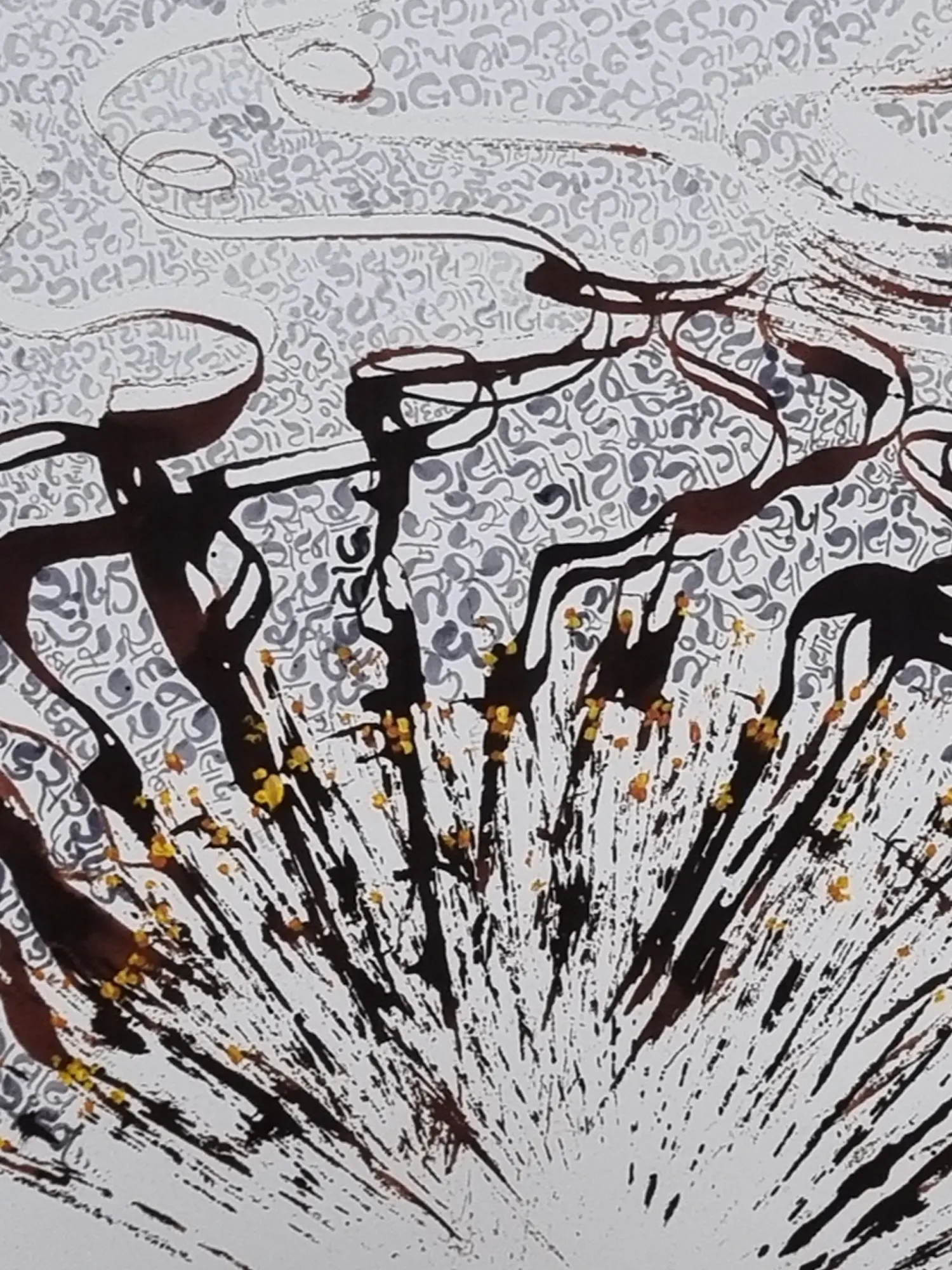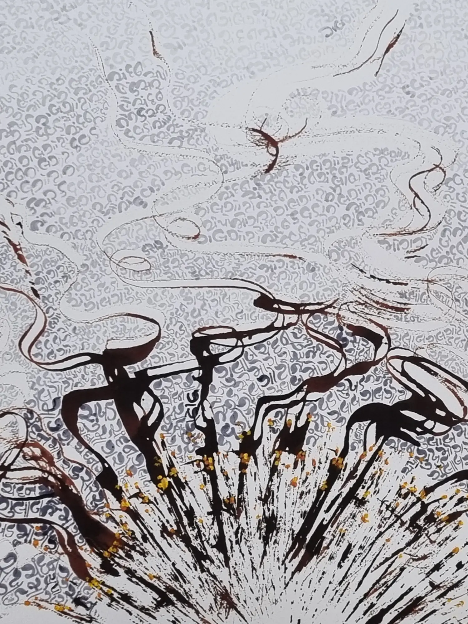 This piece draws inspiration from the rich tradition of Indian calligraphy and script, transforming abstract forms into a visual poem. The background, a tapestry of repeating characters, evokes a sense of ancient wisdom and layered meaning. It speaks to a lineage of artists who have used script not just for communication, but as a profound visual art form.