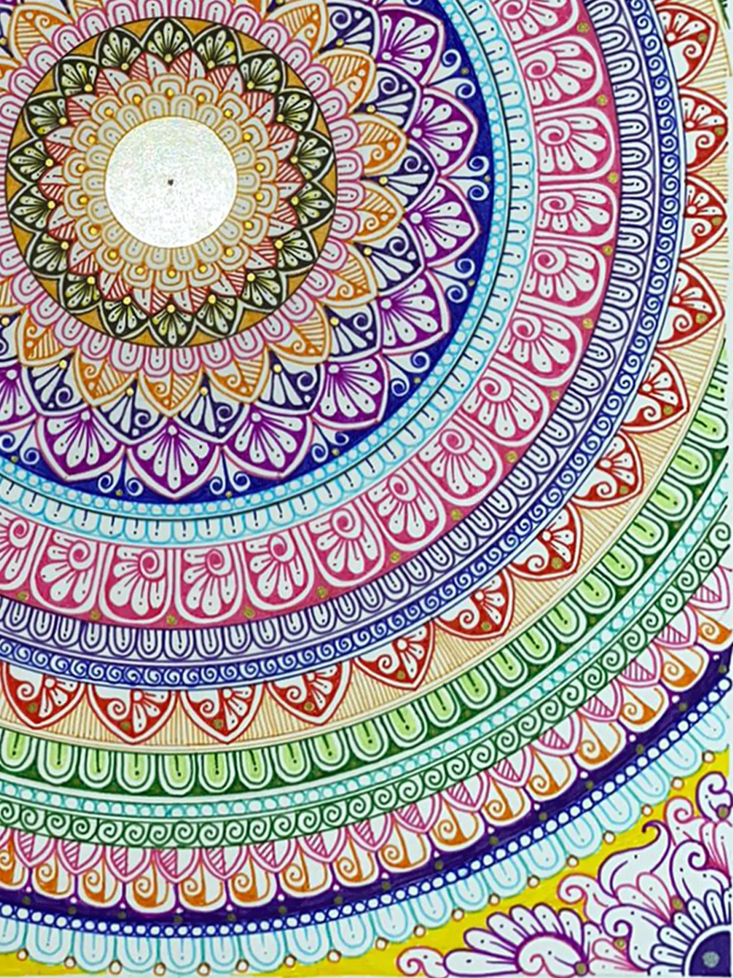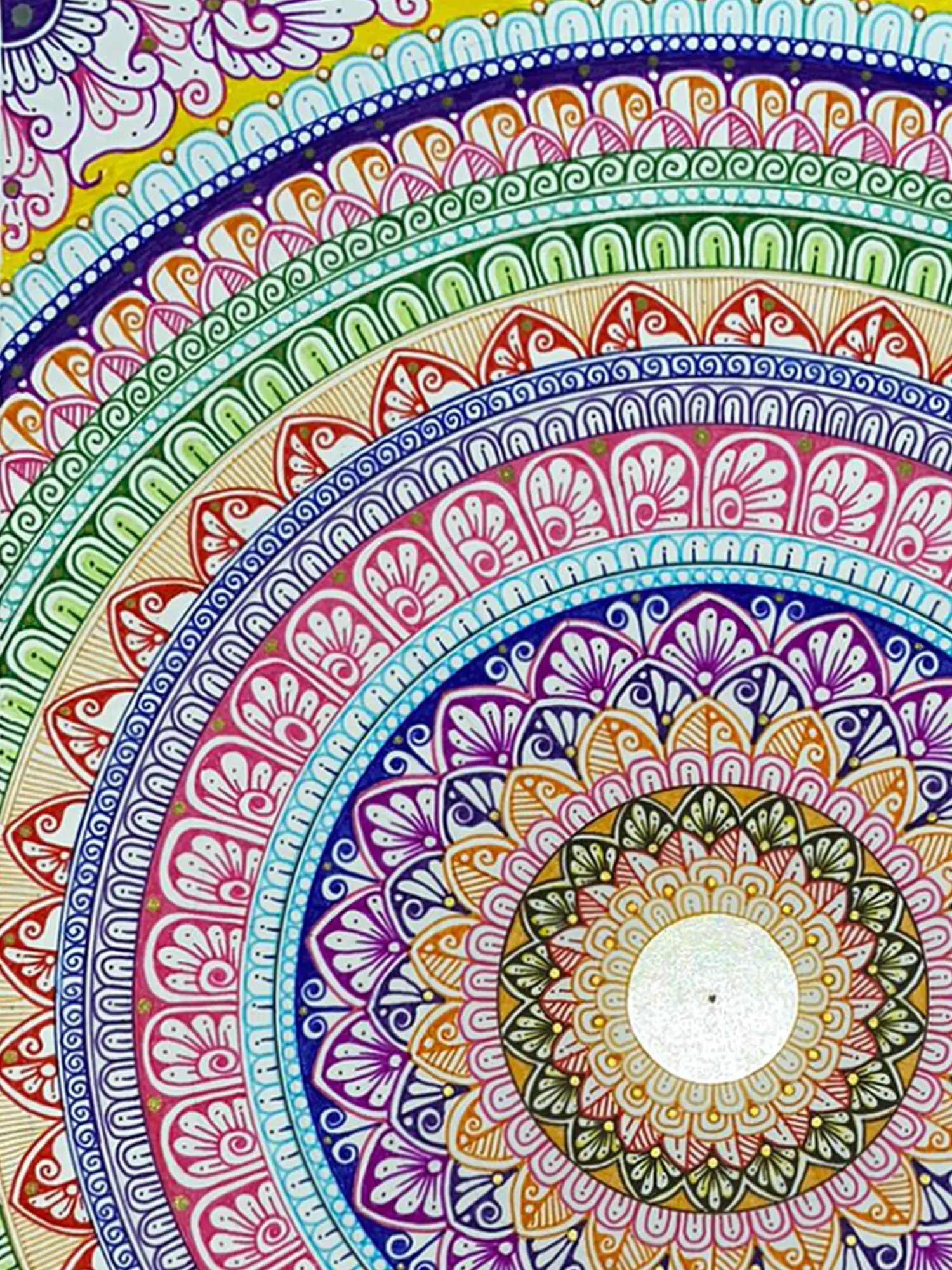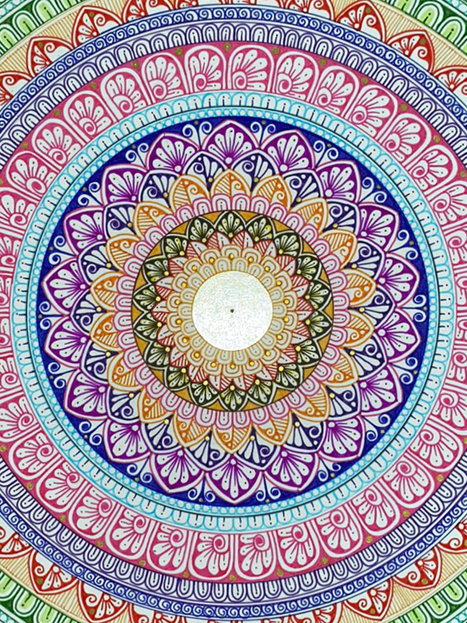 Dive into the kaleidoscopic world of this multi coloured Mandala where hues and shades converge in stun of visual delight. Each circle, adorned with a myriad of vibrant tones, represents a unique facet of the spectrum, inviting you to explore the endless possibilities of chromatic expression. As you trace the intricate patterns of the mandala, you may find yourself drawn into a state of deep contemplation and introspection. Each line and curve becomes a pathway to inner peace and harmony, guiding you through a labyrinth of beauty and wonder.