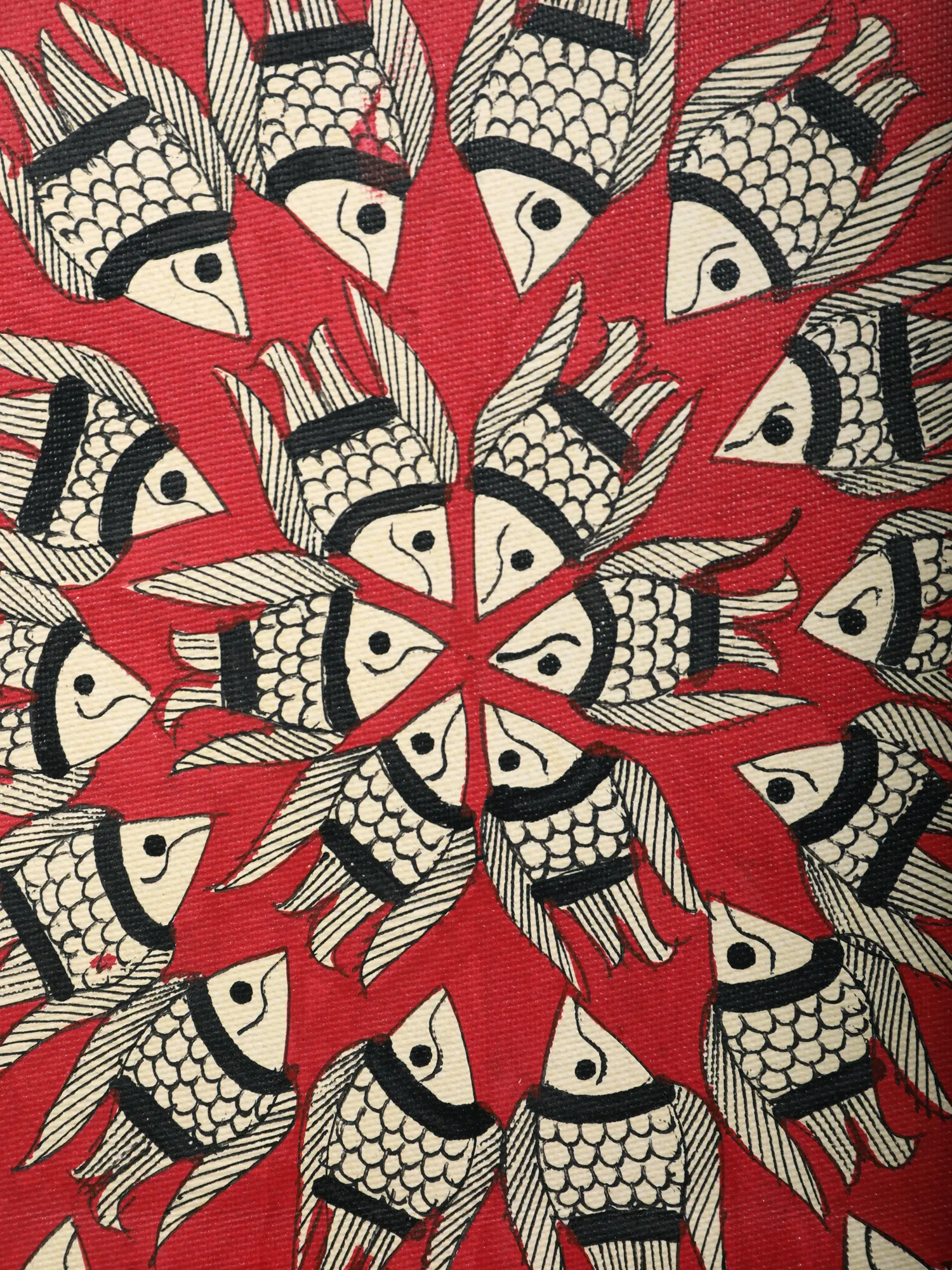 Dive into a vibrant world with this handmade paper artwork featuring multiple fish rendered in the captivating style of Mandla art. Mandala, meaning "circle" in Sanskrit, is a symbolic representation of the cosmos. This artwork uses concentric circles and intricate patterns to depict a school of fish, symbolising abundance, community, and the ever-flowing rhythm of life.