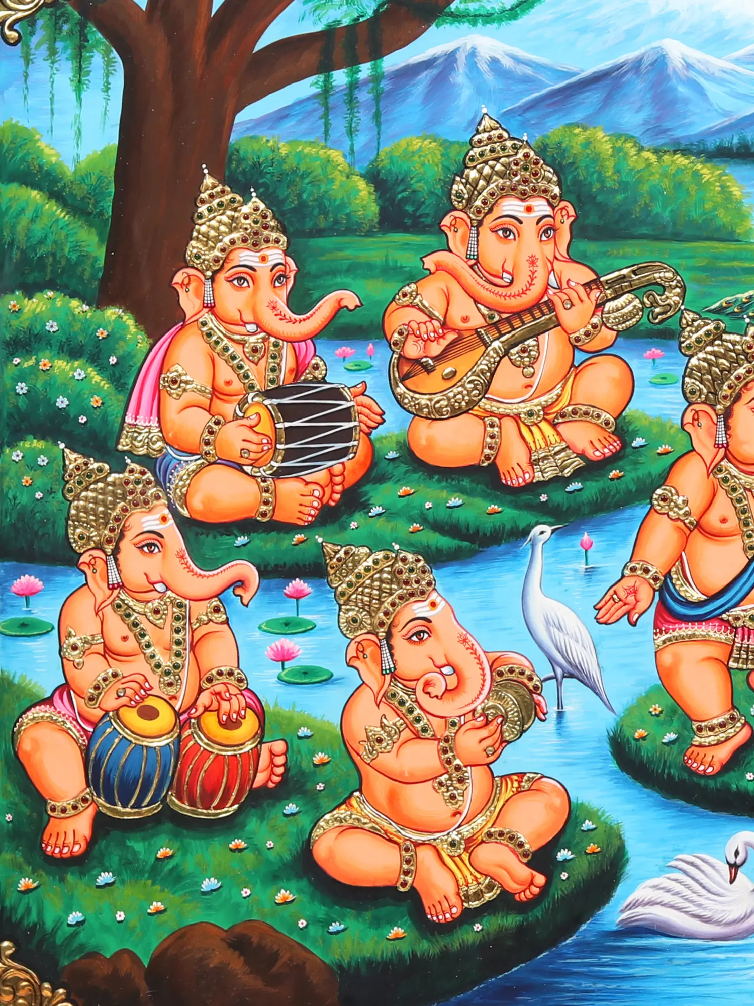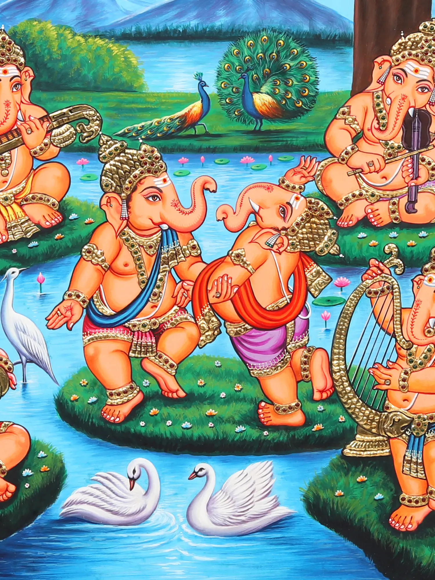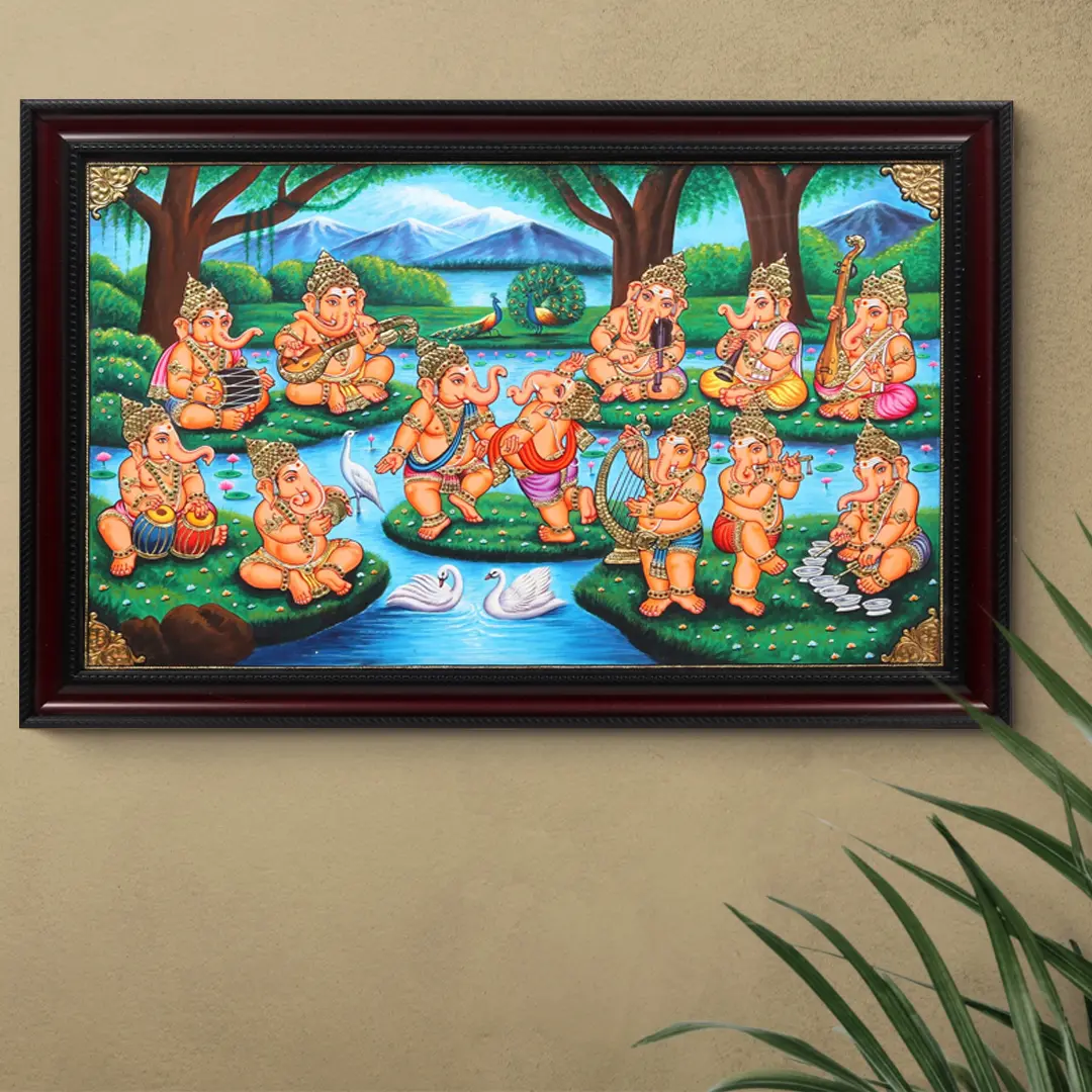 Whether adorning the walls of your sacred abode, gracing places of worship, or bestowed as a cherished gift, this framed Tanjore painting is a timeless artwork. It transcends mere artistic expression, becoming a source of inspiration and a reminder of the enduring joy and divine grace of Lord Ganeshas. The canvas reveals the enchanting spectacle of ten Lord Ganeshas, each passionately playing a unique musical instrument, while two exuberantly dance in celestial ecstasy. The divine ensemble symbolises the rhythm of life, the joy of existence, and the blessings of the benevolent Lord.