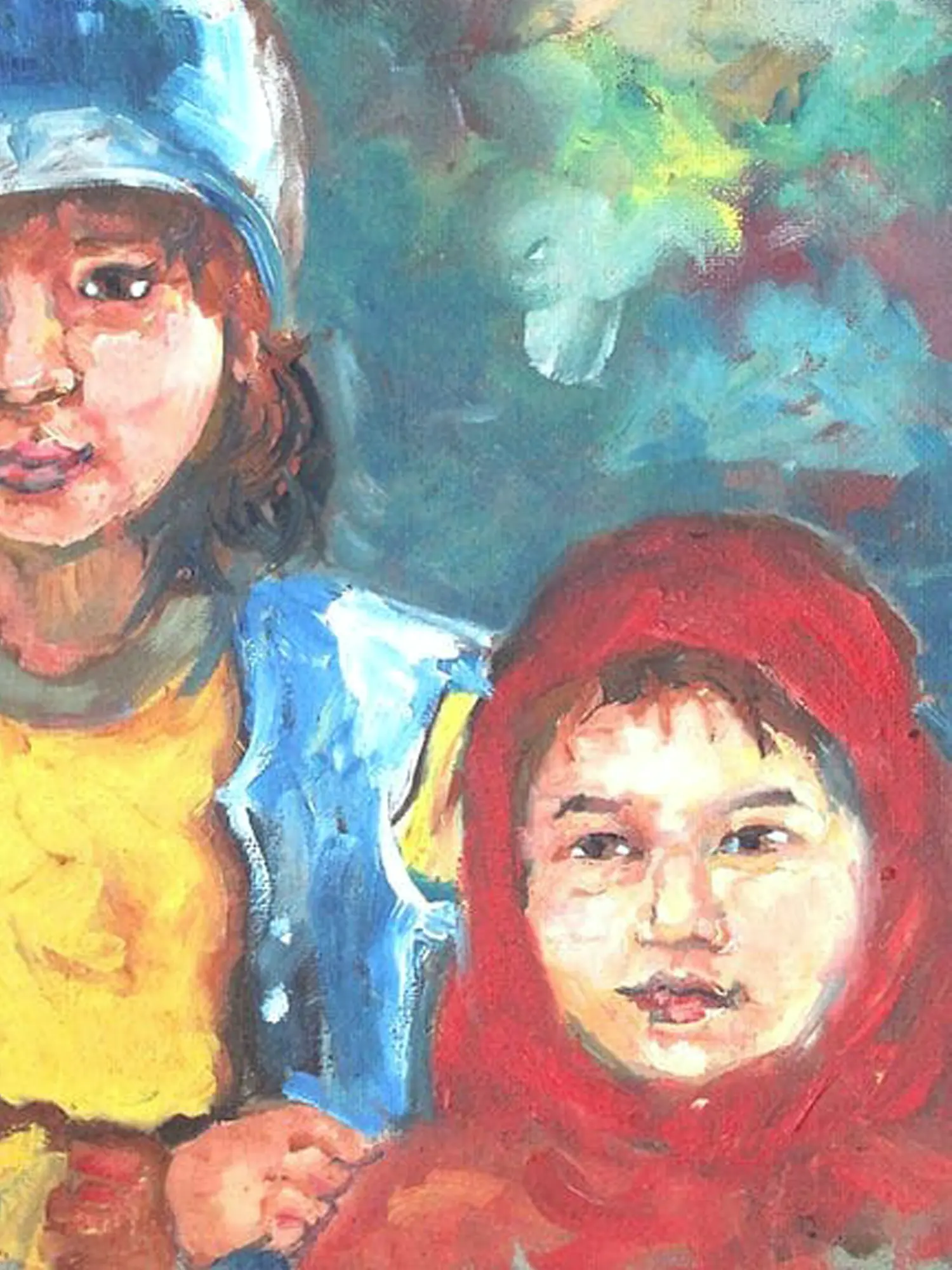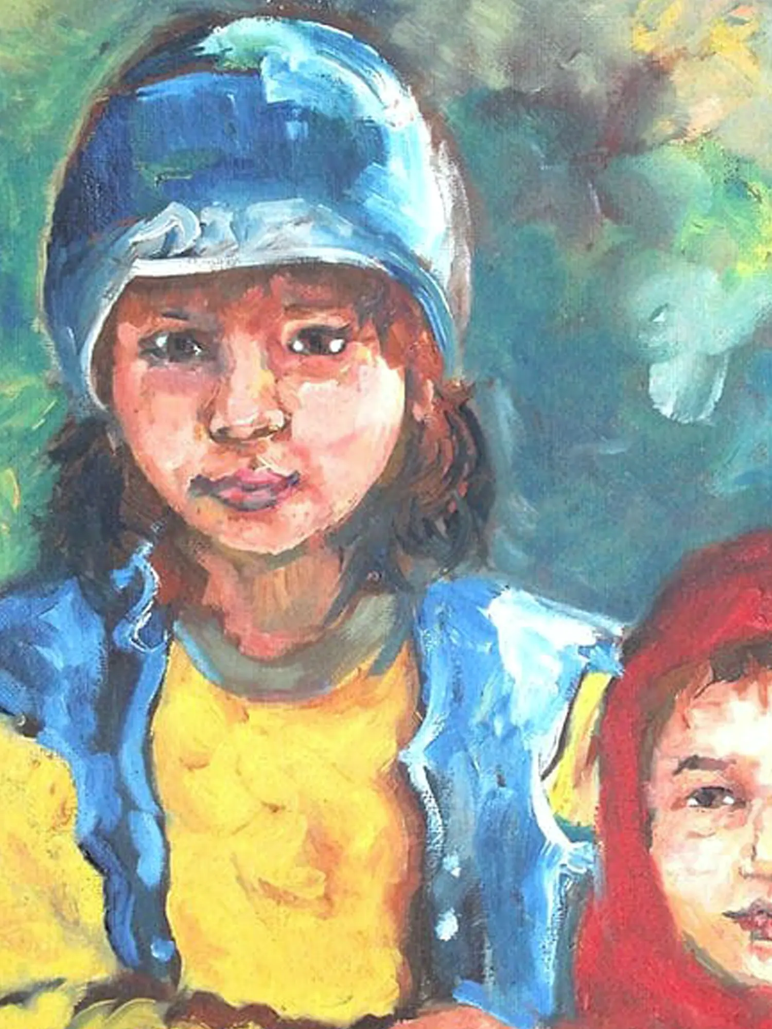 The composition, measuring 18 inches in height by 12 inches in width, is a study in contrasting yet harmonious elements. The elder sibling, in her protective blue helmet and vibrant yellow top, gazes outward with an air of gentle guardianship, while the younger, swathed in a comforting red hood, offers a more introspective presence. The impressionistic background, a blend of greens and blues, evokes a sense of place and atmosphere without overpowering the central figures.