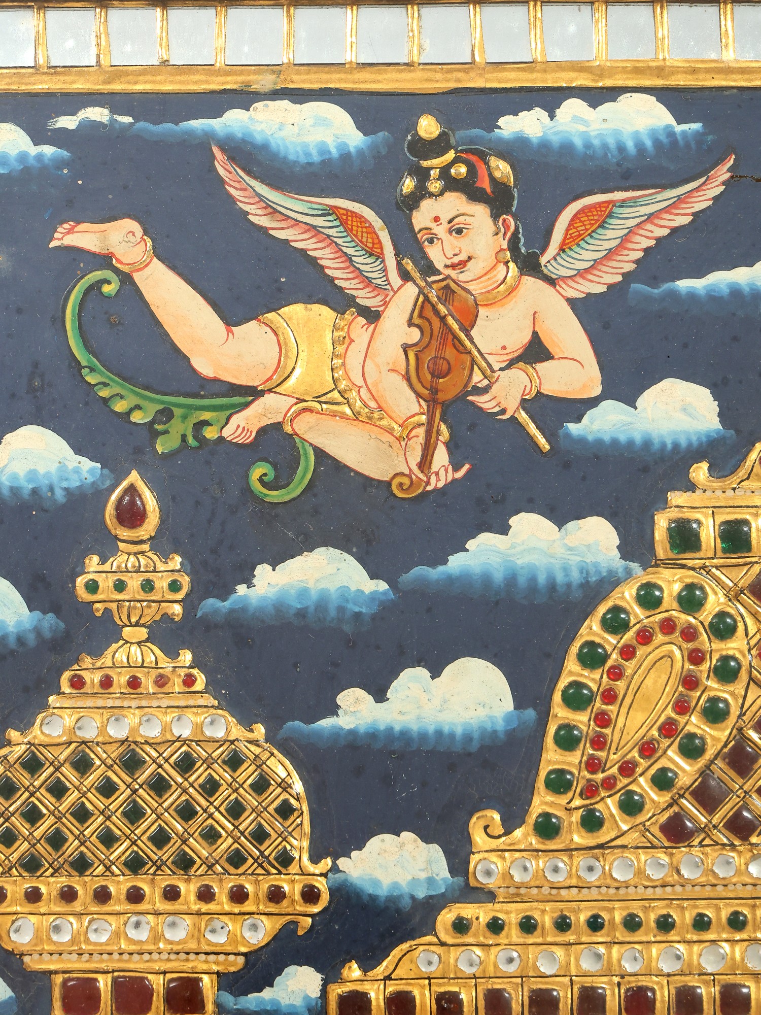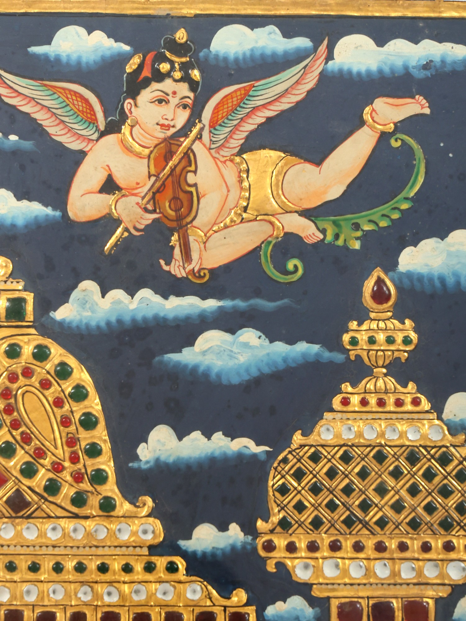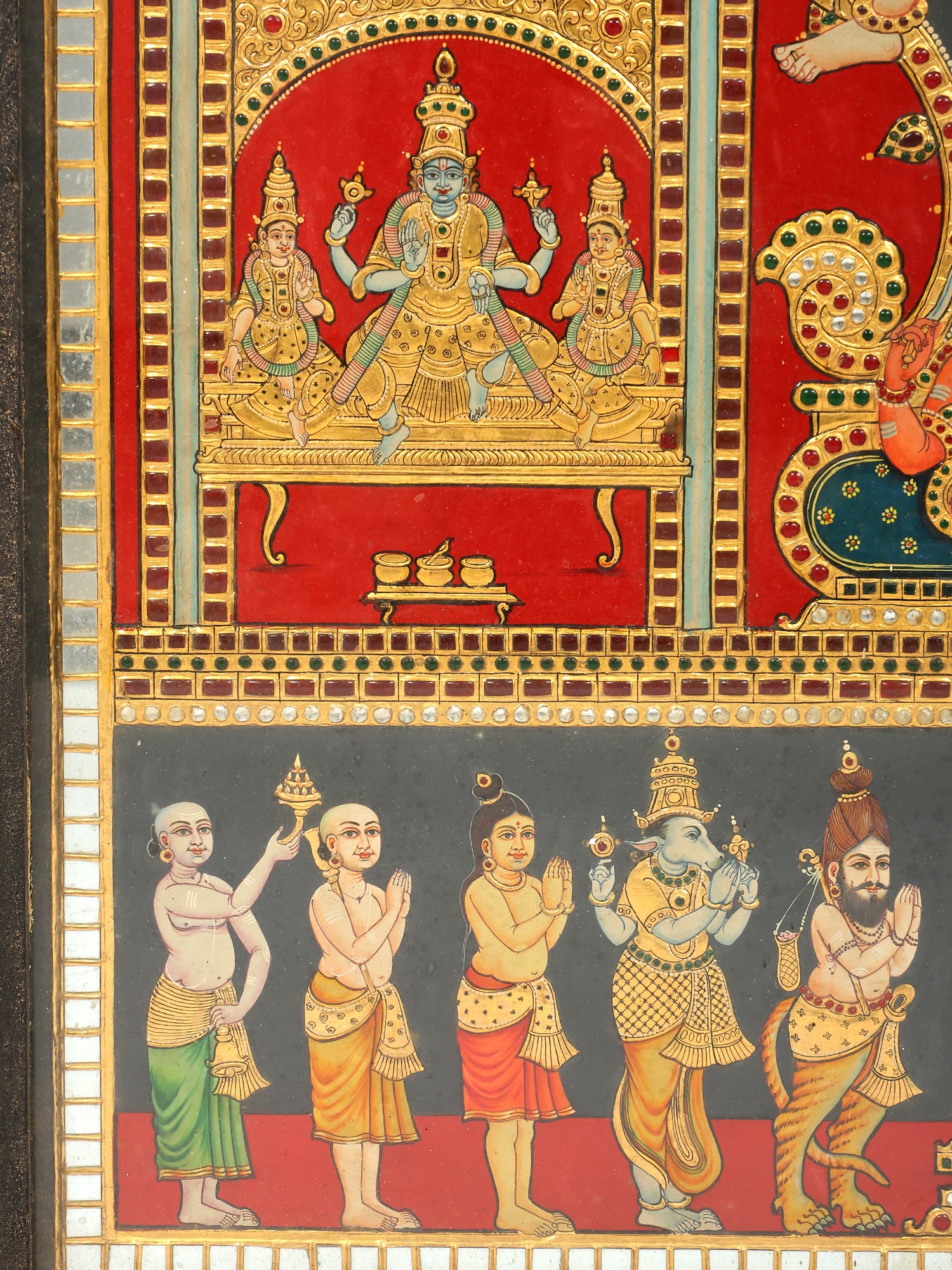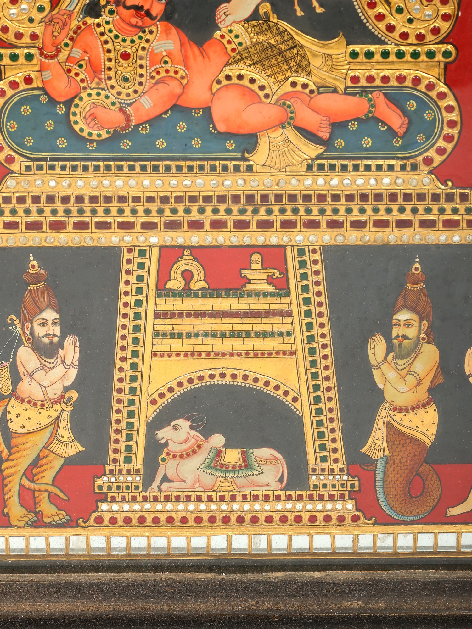 Tanjore paintings, originating from the ancient city of Thanjavur in Tamil Nadu, India, are renowned for their richness, opulence, and devotional fervor. This art form, passed down through generations of artisans, is characterized by its use of vibrant natural pigments and the liberal application of pure 24-karat gold leaf. The raised stucco work, adorned with precious and semi-precious stones, adds a tangible dimensionality that makes these paintings almost three-dimensional. This particular rendition of Nataraja is a prime example of the meticulous skill and dedication involved. From the serene yet powerful countenance of Shiva to the detailed architectural elements and the celestial beings gracing the upper register, every brushstroke and application of gold is imbued with reverence. The surrounding figures, including depictions of devotees and celestial attendants, further enrich the narrative, offering a glimpse into the reverence with which Shiva is worshipped.