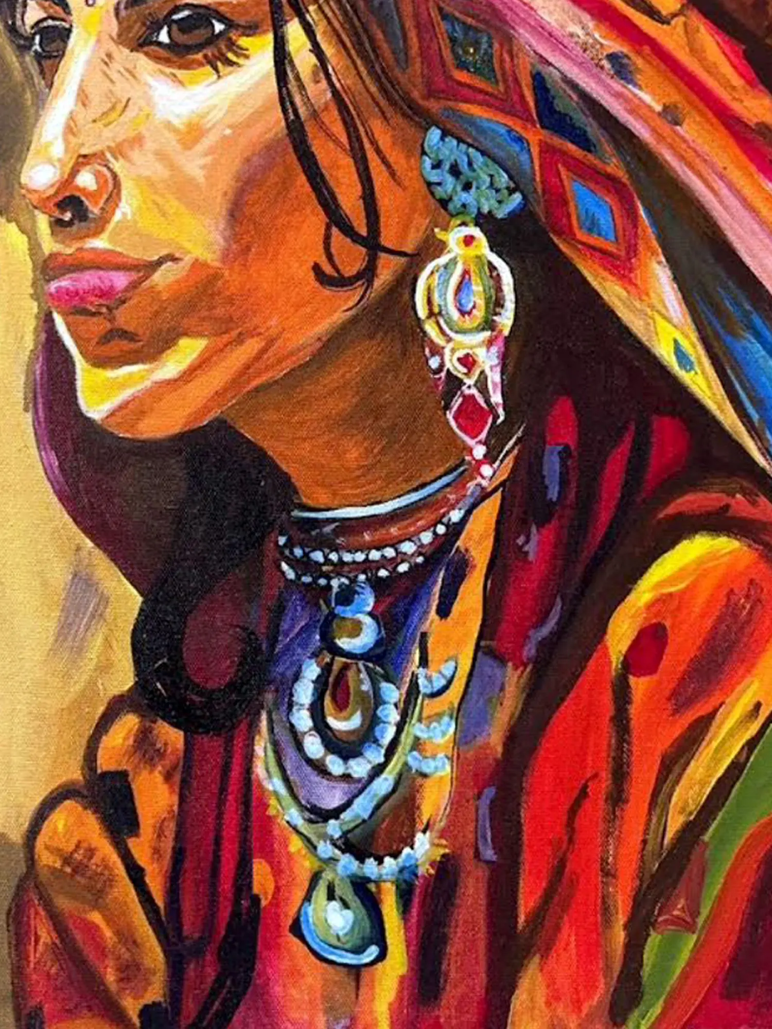 The intricate details of the woman's attire are not merely decorative; they speak volumes about the cultural context of the painting. The vibrant colors and intricate patterns on her clothing and jewelry are reminiscent of traditional attire found in various South Asian cultures. The style evokes a sense of richness and history, hinting at age-old traditions and stories passed down through generations. The ornaments themselves, the elaborate necklaces, earrings, and the bindi on her forehead, are significant symbols of adornment and identity, signifying status, marriage, or spiritual devotion in various traditions—connecting the image to countless myths and tales of women who held significant roles within their respective cultures. Her clothing could represent the rich tapestry of cultural influences throughout history, creating a dialogue between past and present.