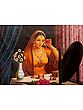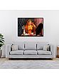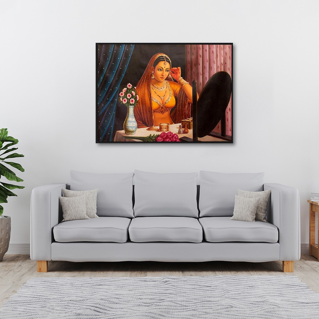 Lady adorning herself in Indian culture is “Vasaksajja Nayika”- one who has received the news of her lover’s arrival and is filled with blissful anticipation and prepares for the moment. Dressed in yellow, the youthful woman in this oil painting gazes at her beauty in the mirror, while trying on an earring. Articles such as scents and jewelry boxes are placed in front of her. The bouquet on the table is probably the gift that arrived along with the love letter. Capturing a delicate moment in the romantic journey of a lady, this painting fills the heart with ripples of love.