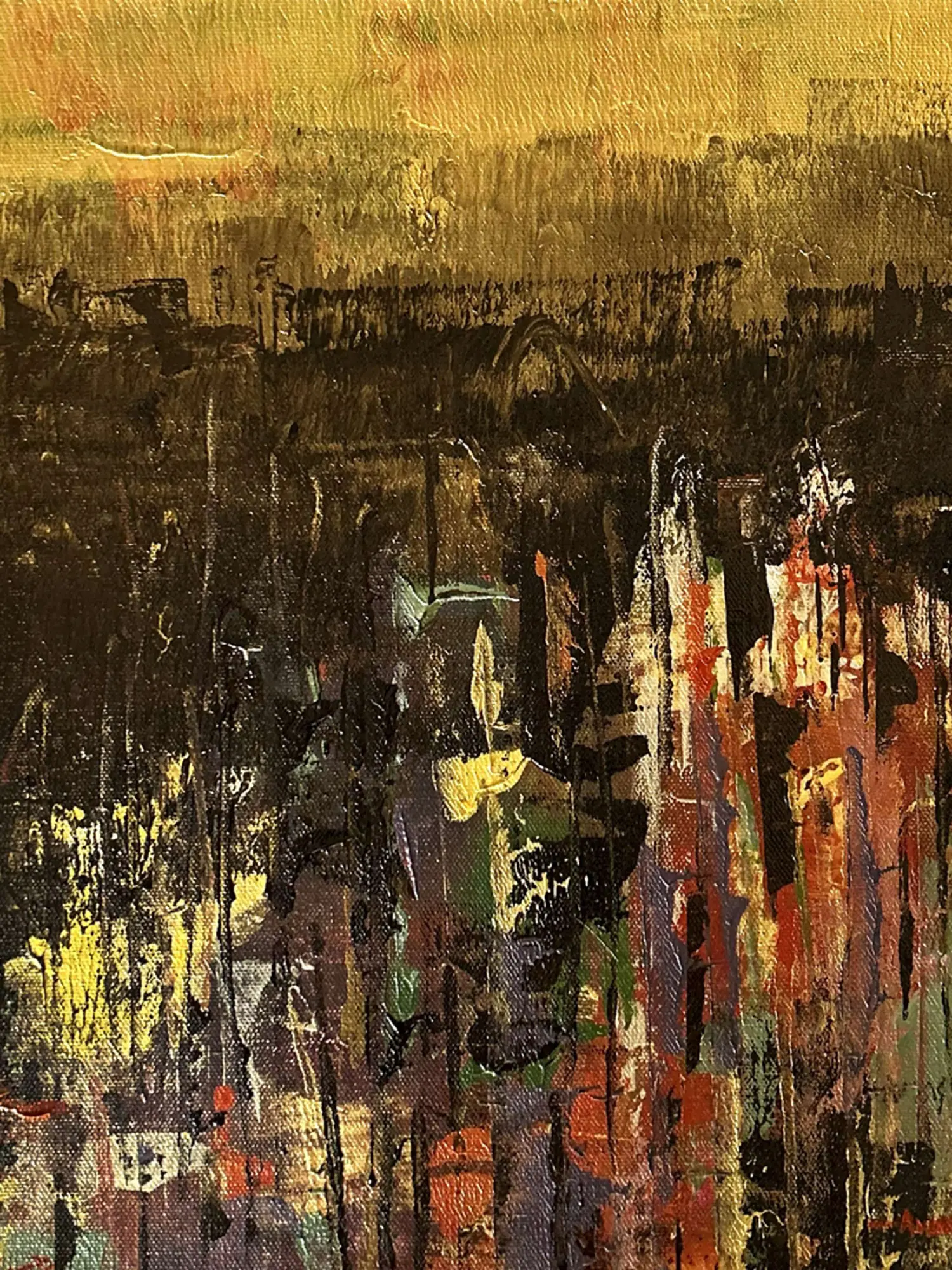 This artwork subtly evokes the feeling of a bustling urban landscape, hinting at the architectural forms and the lively dynamism of a city at twilight or dawn. It channels the spirit of abstract expressionism, inviting personal interpretation rather than dictating a singular narrative. The resulting atmosphere is one of vibrant energy and introspection, reminiscent of the complex tapestry of modern life.