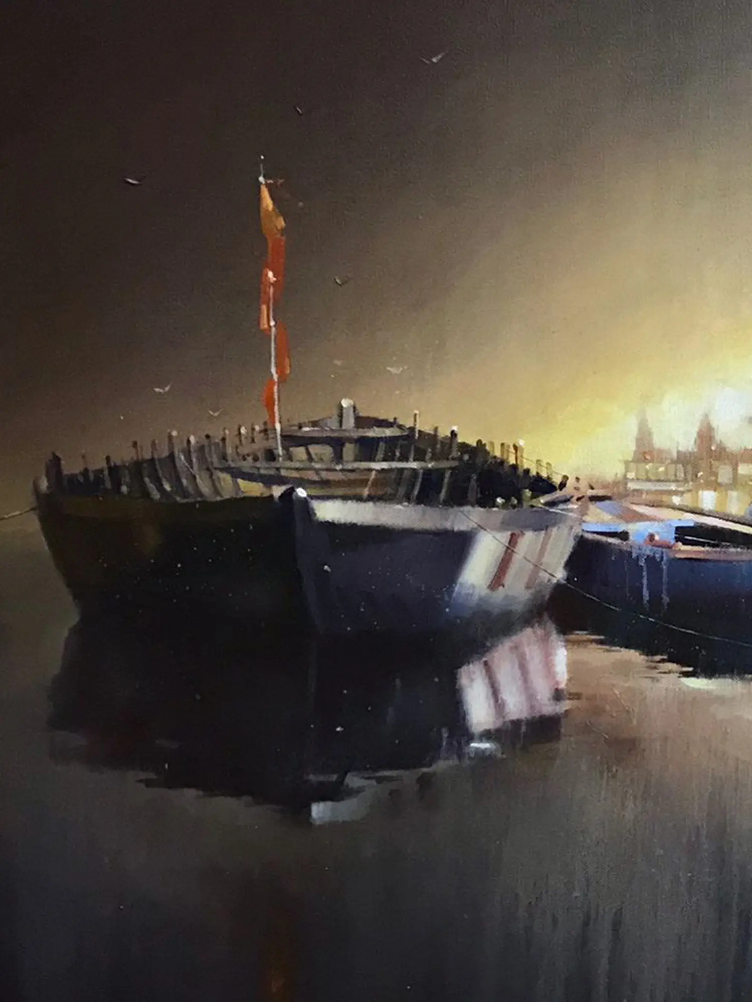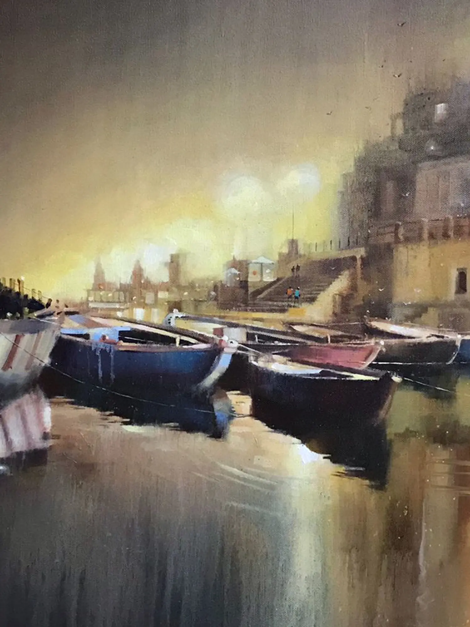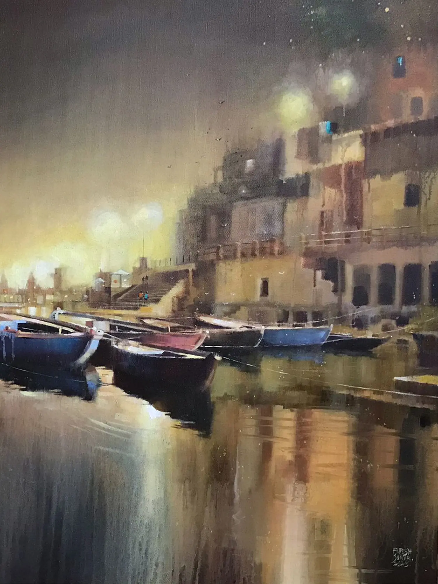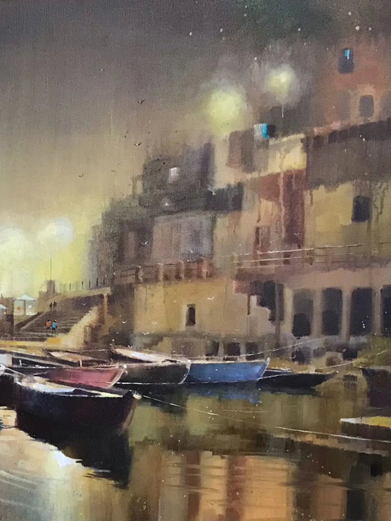 Beneath the starlit sky, 'Night View of Varanasi Ghat' emerges as an enchanting tale of shadows and dreams. Rupesh Sonar's acrylic brush dances with the cosmos, painting a mosaic of twilight whispers. Amidst the darkness, the ghats come alive, each step telling stories of lives lived by the river's embrace. A cosmic connection between humans and the universe unfurls, reminding us that we are stardust bound by our shared journey. This canvas whispers a celestial truth – in the darkest of nights, the stars within us shine their brightest.