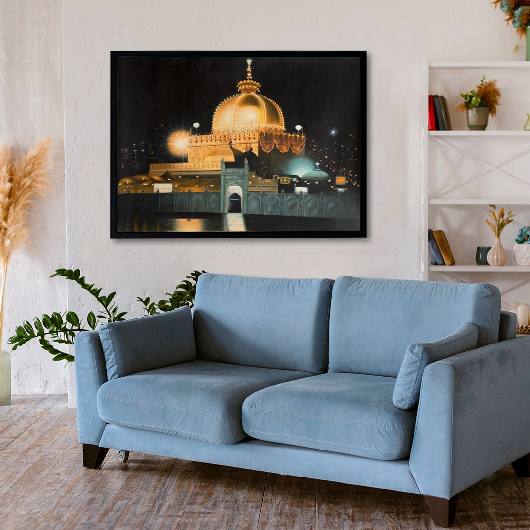 This oil painting of a Sufi dargah takes us to the celebrations, Qawaalis, and gatherings of the Murids of Sufi saints, which enliven these spaces open to all, embodying the unity in diversity of the Indian culture. The Dargah is covered in lights and lamps and its marble glows brilliantly at the night. In Sufism, the birth and the death anniversary of the saint are celebrated with great joy, one of which seems to be taking place on the canvas.