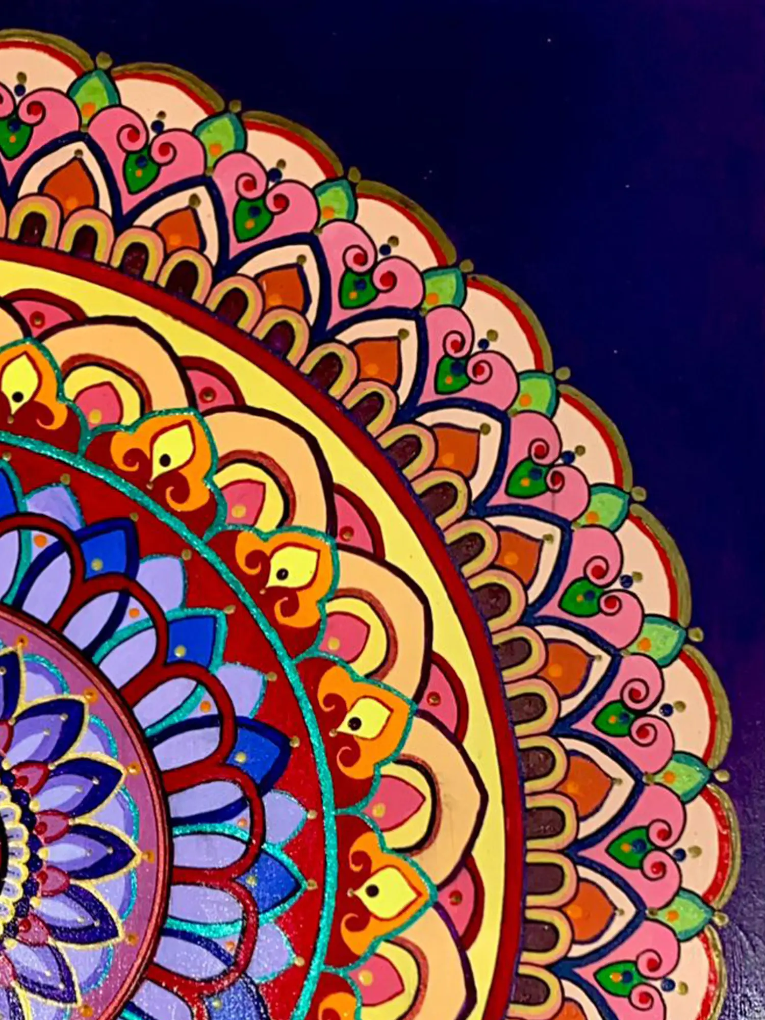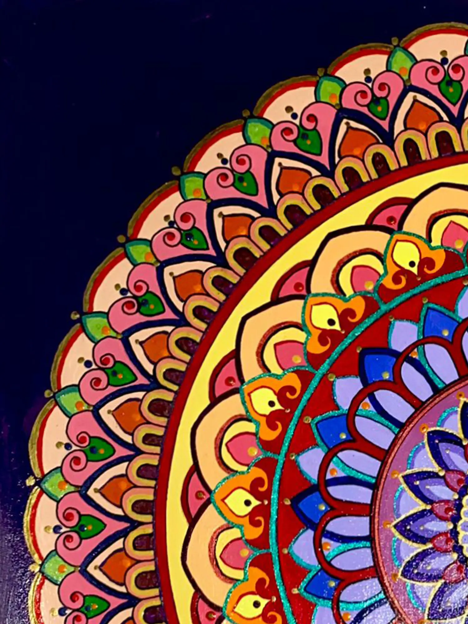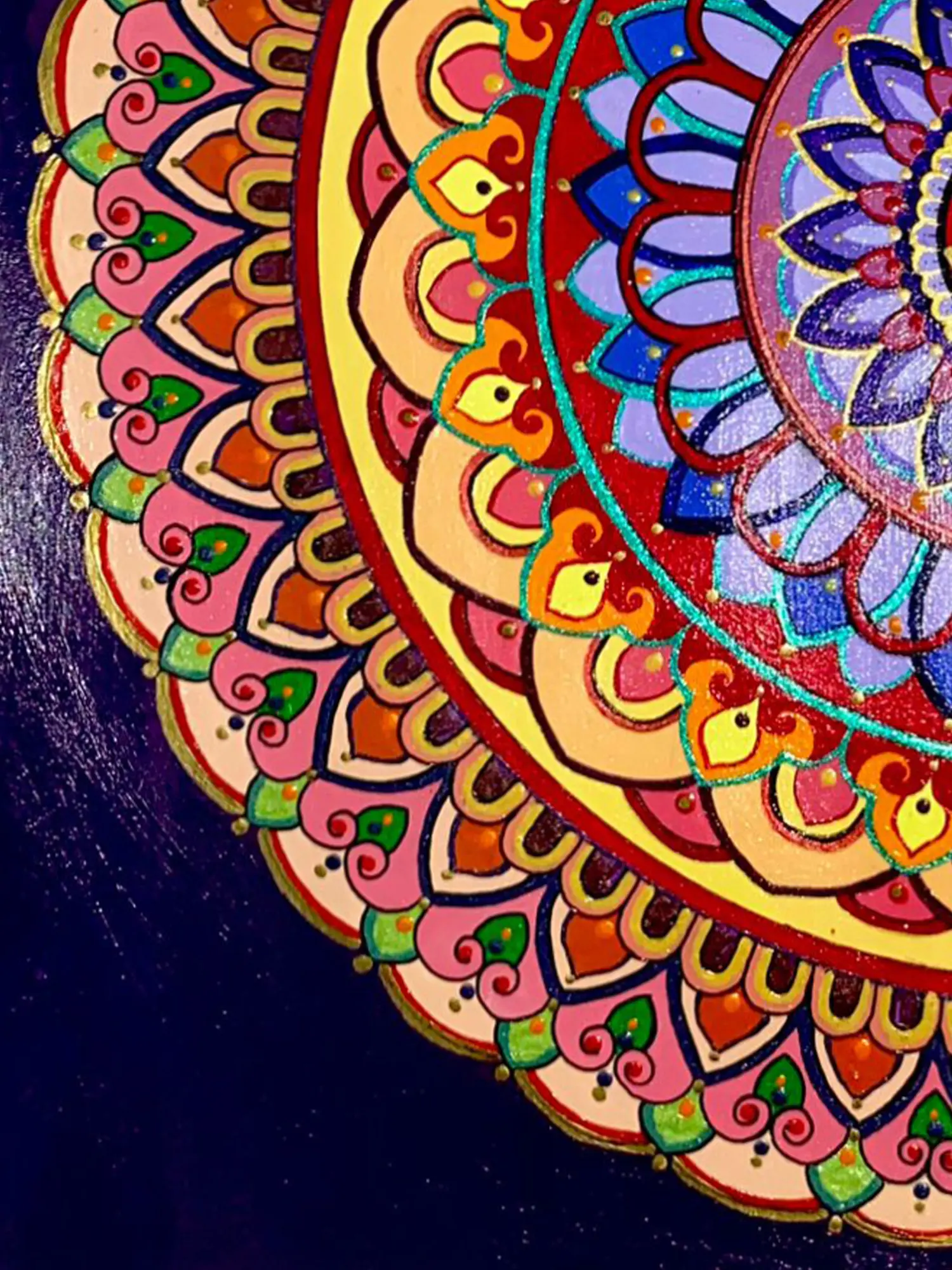 Immerse yourself in the sacred geometry of "Om Mandala," a mesmerising painting that celebrates the divine essence of the universe. Inspired by the ancient art of rangoli, this mandala radiates with spiritual energy and cosmic harmony. Each precise pattern and vibrant hue symbolises the eternal cycle of creation and renewal, inviting viewers to explore the depths of their own consciousness. Let the soothing vibrations of the sacred Om mantra resonate through your being, as you contemplate the interconnectedness of all existence within this mesmerising mandala.