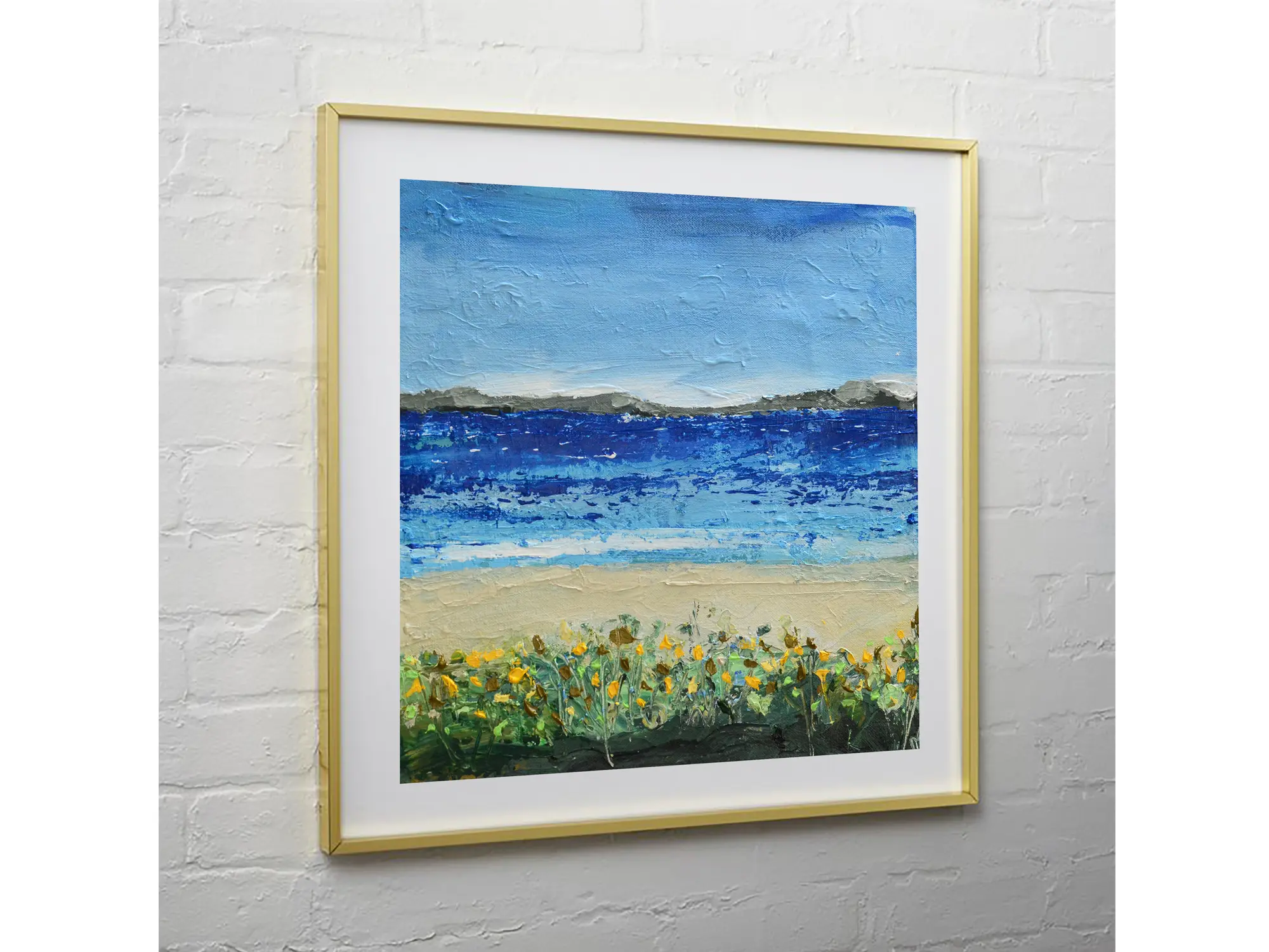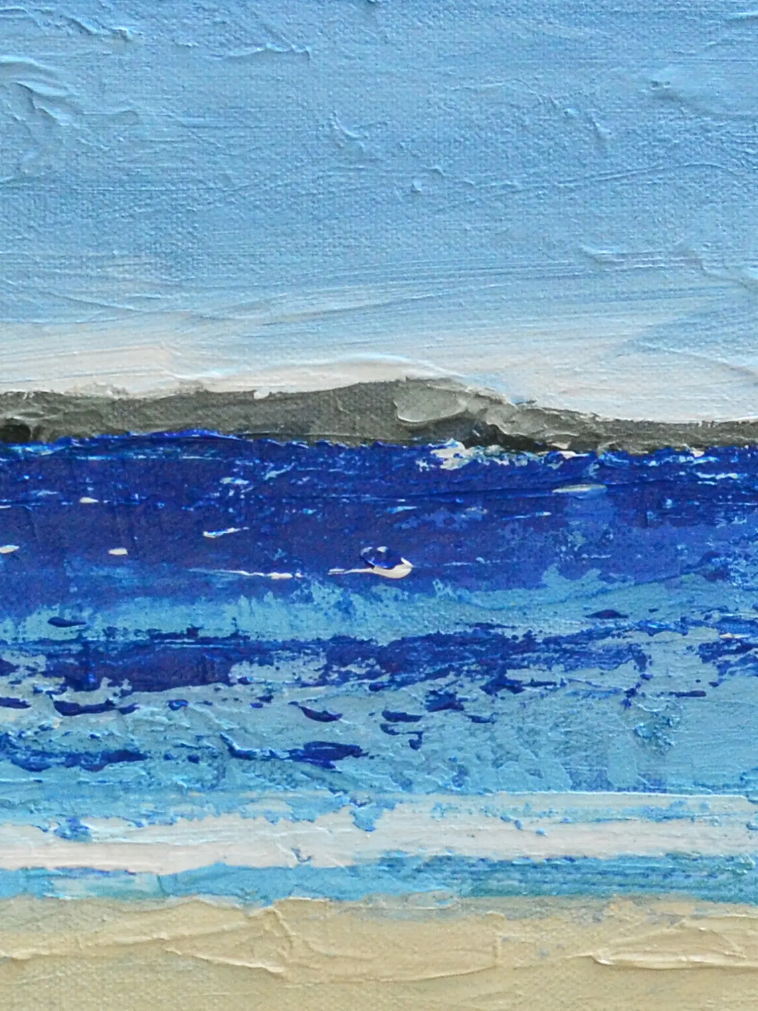 Towards The Shore, an Acrylic on Canvas masterpiece by Mitisha Vakil, beautifully captures the tranquil beauty of a coastal scene. The deep blue sea dominates the canvas, creating a serene backdrop. The shore is adorned with small vegetation, and the artist skillfully portrays the waves playing with the sand, evoking a sense of calm and movement.