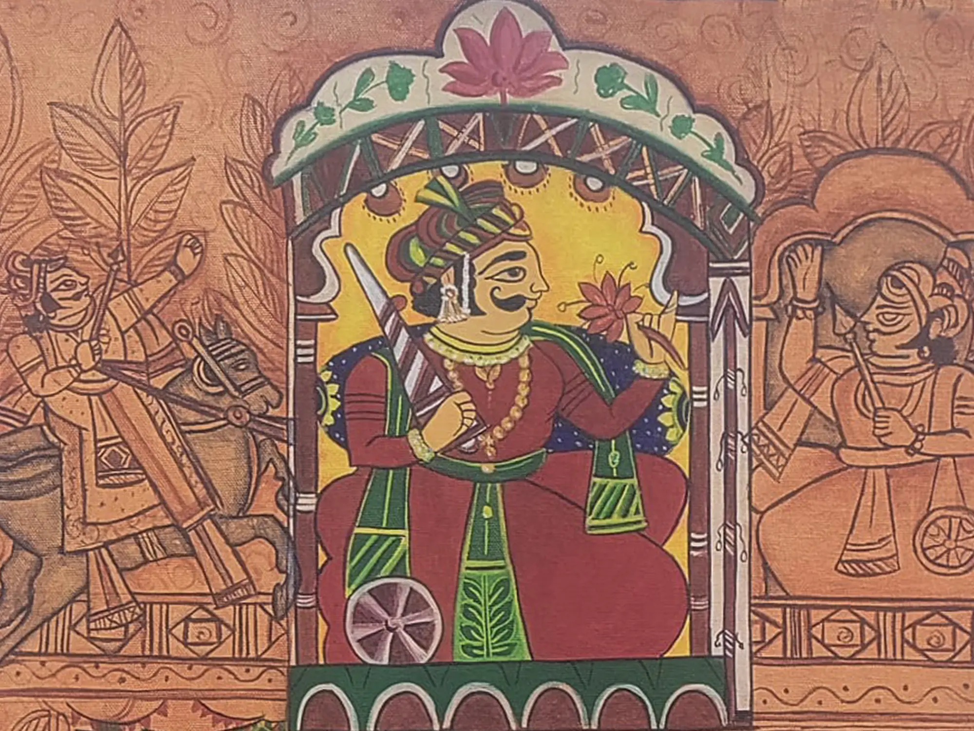 This artwork draws inspiration from the epic tales and heroic legends that form the bedrock of Rajasthani folklore. It captures a moment of intense bravery, likely echoing the sagas of chivalry and selflessness celebrated in the region's rich cultural tapestry. The very act of rendering such a story in natural pigments connects you to a lineage of artists who have preserved and shared these narratives for centuries.
