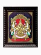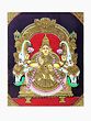 In this painting, Goddess Gajalakshmi is depicted seated on a Kirtimukha throne in Padmasana having four arms. Each of her two upper arms hold a full-blown lotus flower while the lower hands are in the boon granting Varada Mudra and Abhaya Mudra (the hand gesture of fearlessness). She is flanked by a white and nicely decorated elephant (gaja) on her either side. They stand on their hind legs and lift their trunks high as if honoring the Goddess with all their energy. The Goddess’s molten gold complexioned body is attired in a beautiful golden and green silk saree and bedecked with several ornaments including a huge crown on her head. As she sits in the padmasana posture, the multitude of pleats in her saree gracefully open up as a fan between her folded legs. Her soft and gentle smile describes her extremely merciful nature towards her devotees. Finally, the embellishment of the painting with 24 Karat gold makes it stand out from other ordinary paintings. Also, the outlines have been decorated with a sequence of red and green stones which makes it more special and aesthetic.