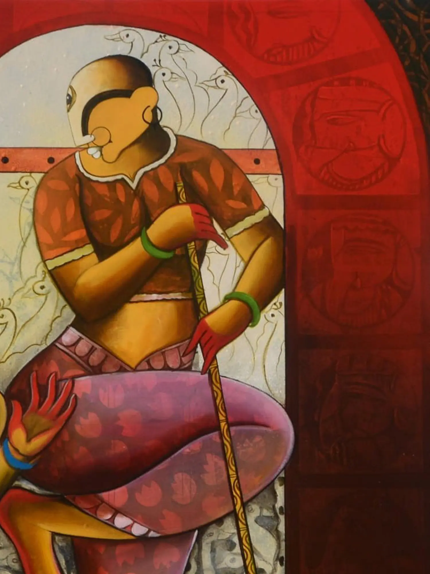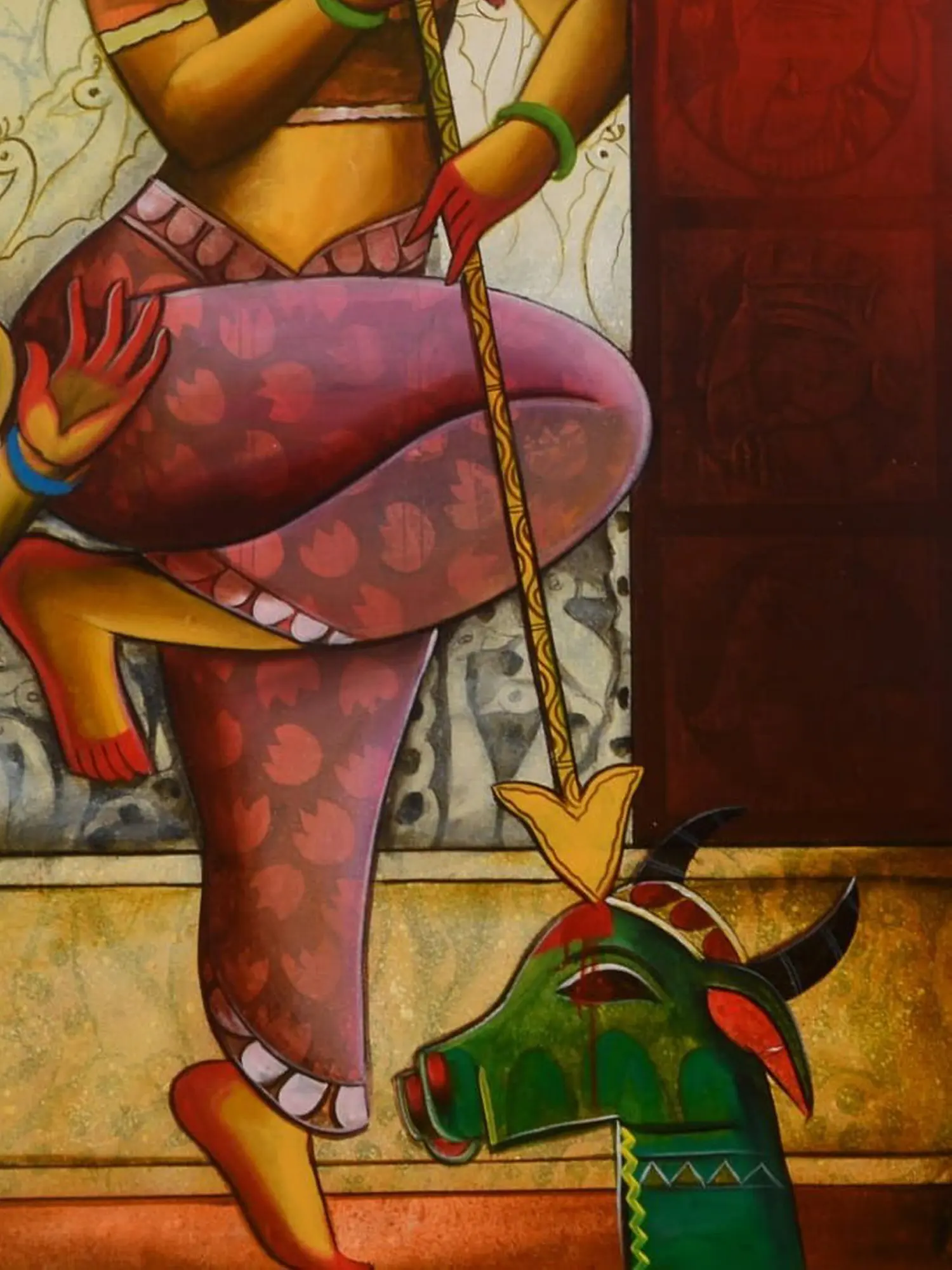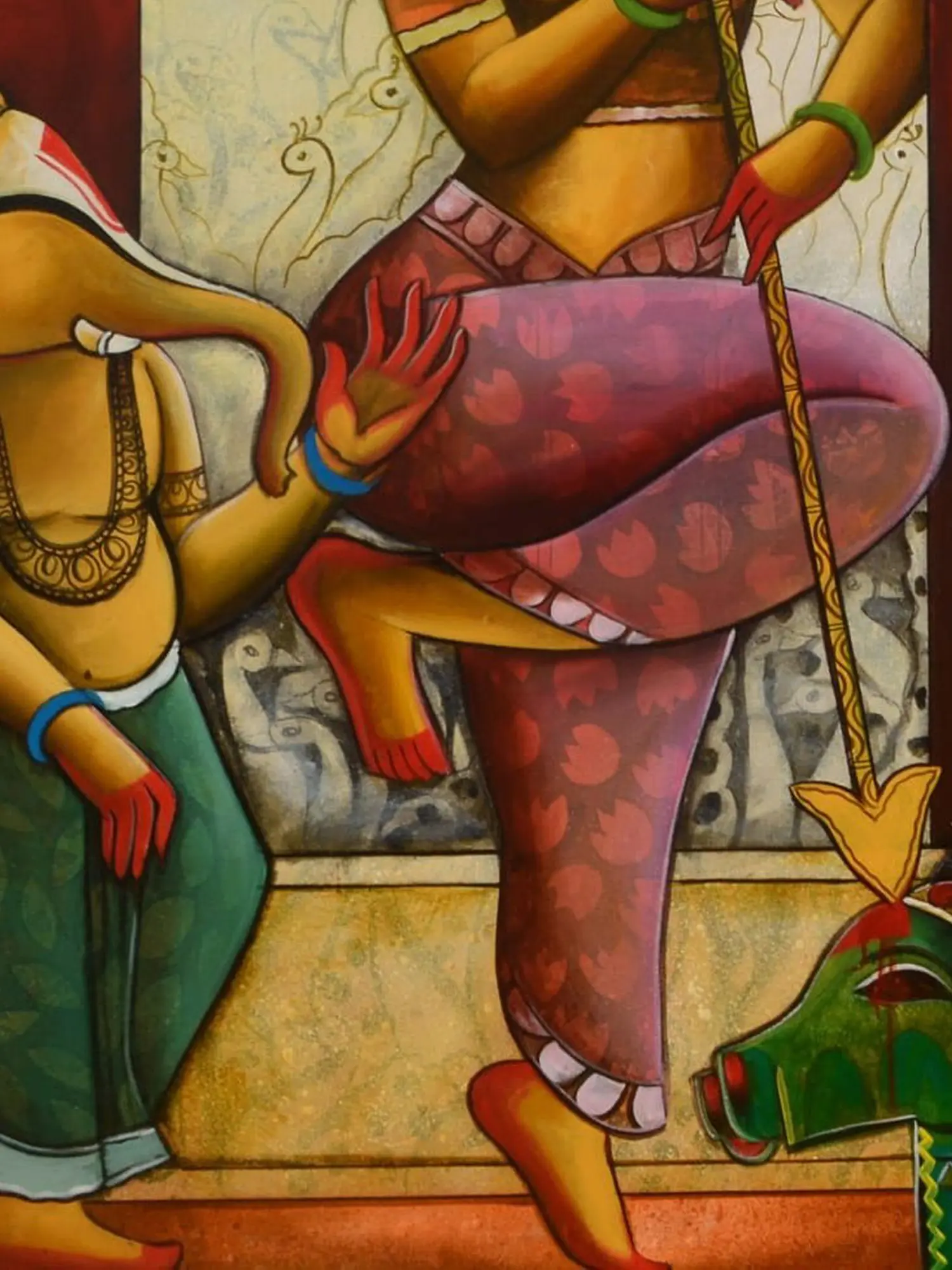 The universal mother Parvati or Durga and Ganesha present on this canvas the divine connection between a mother and a child- sacred, powerful and beyond all else. The Mother-goddess Durga with her weapon strikes a splendid posture, piercing the buffalo demon’s head while blissfully looking at Ganesha who stands in an interactive pose, in the protective proximity of his mighty mother.
