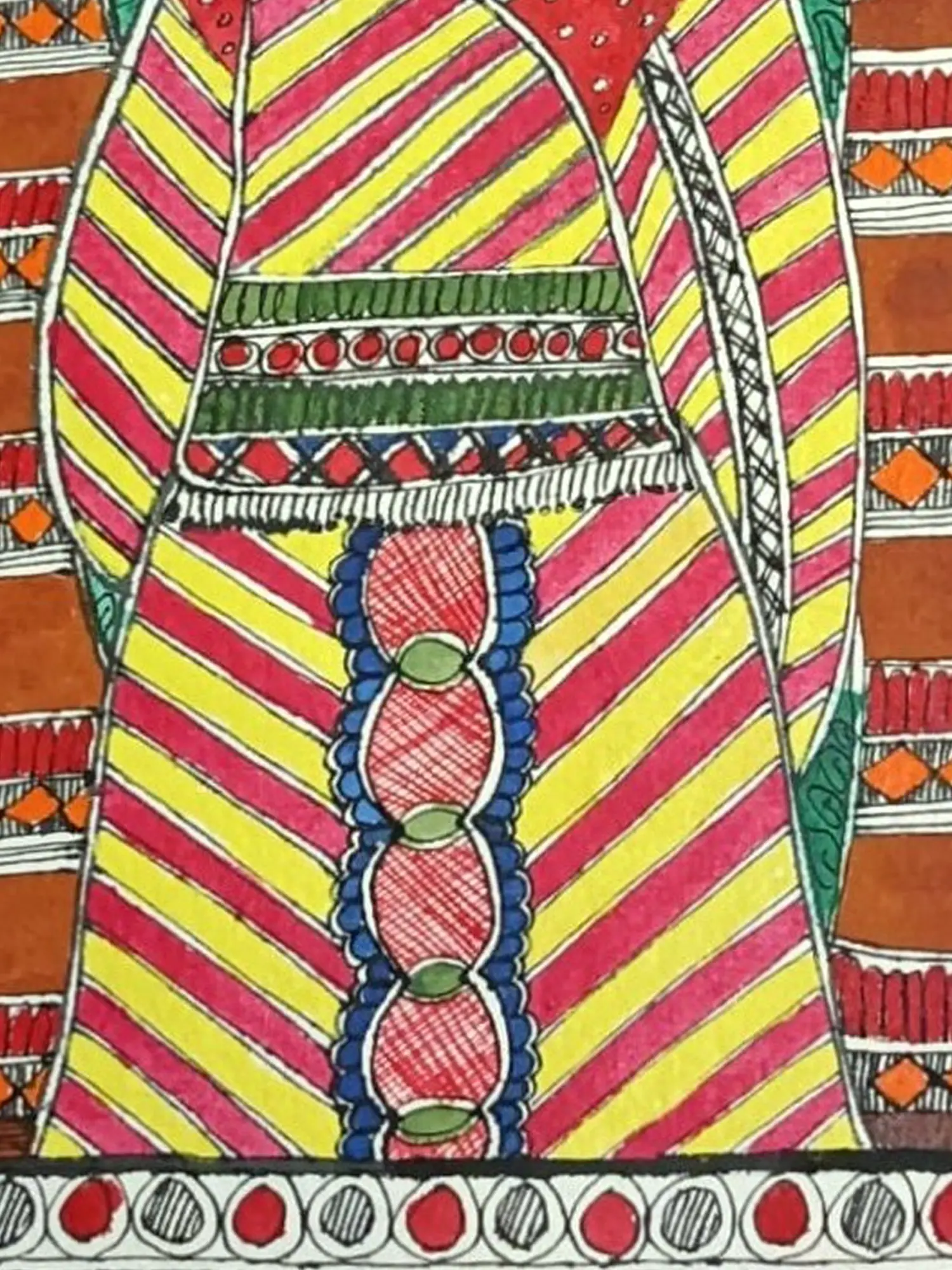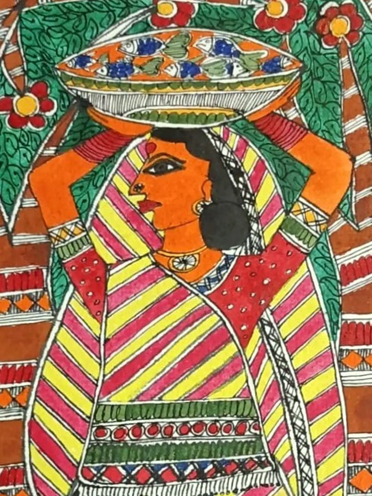 Step into the bustling world of a marketplace with this captivating Madhubani painting. Acrylics dance across the handmade paper, depicting a woman selling vibrantly coloured fish. This artwork celebrates the resilience and resourcefulness of women, while also acknowledging the importance of fish as a source of life and sustenance in many cultures.