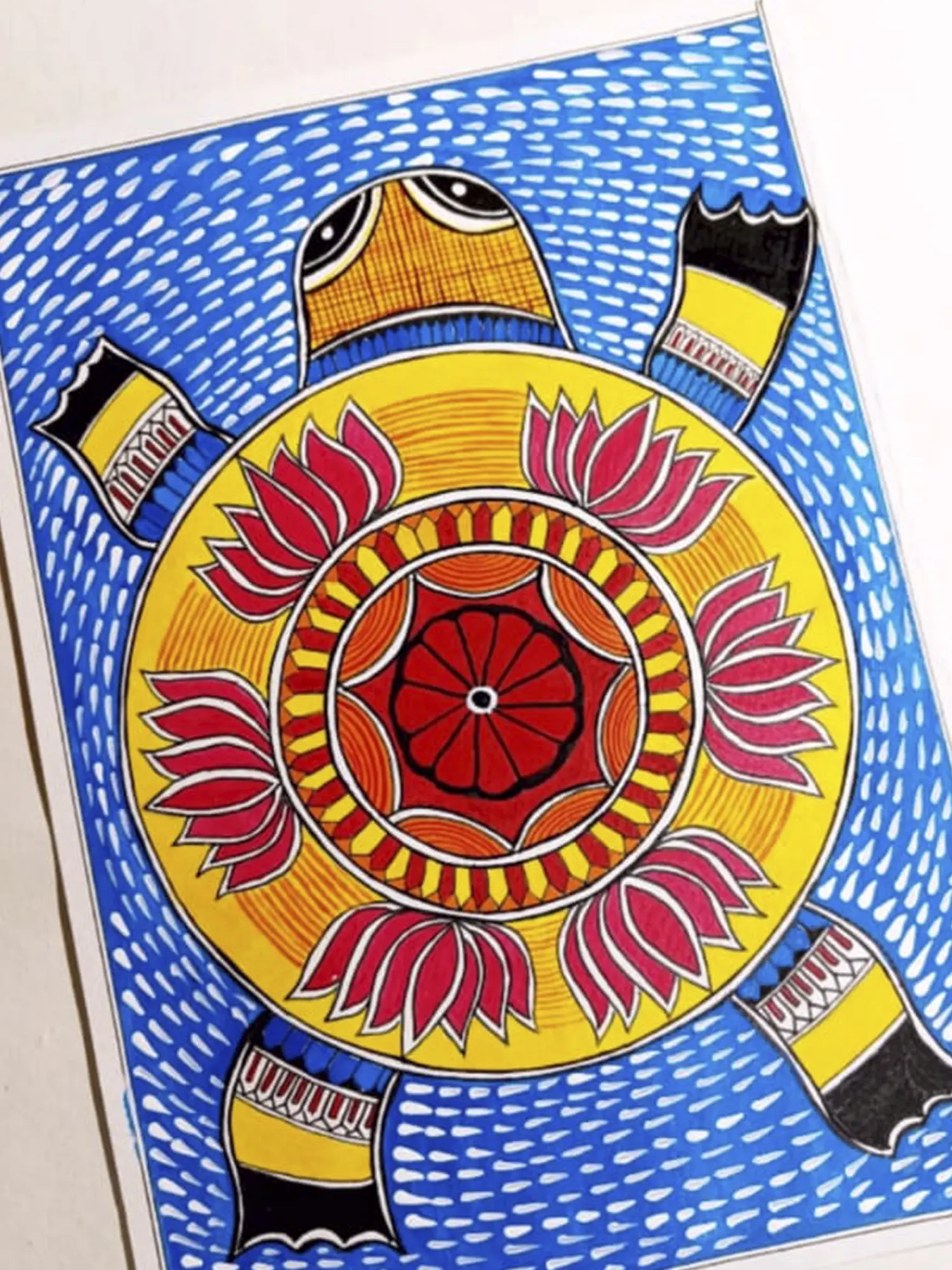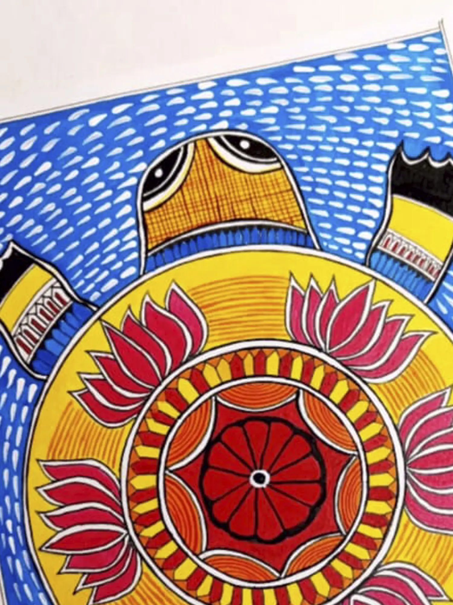 Tortoise a symbol of balance and hard work has a special place in Madhubani art. This Madhubani art of Tortoise with Lotus is made by artist Muskan and pays homage to the sacred animal in a colorful way. The image of a lotus on the back of the tortoise symbolizes wisdom. The artwork intricately portrays a tortoise, a revered symbol in Madhubani art, adorned with resplendent lotus blooms. Muskan's skillful use of acrylic paints captures the tortoise's distinctive form and the delicate beauty of lotus petals.