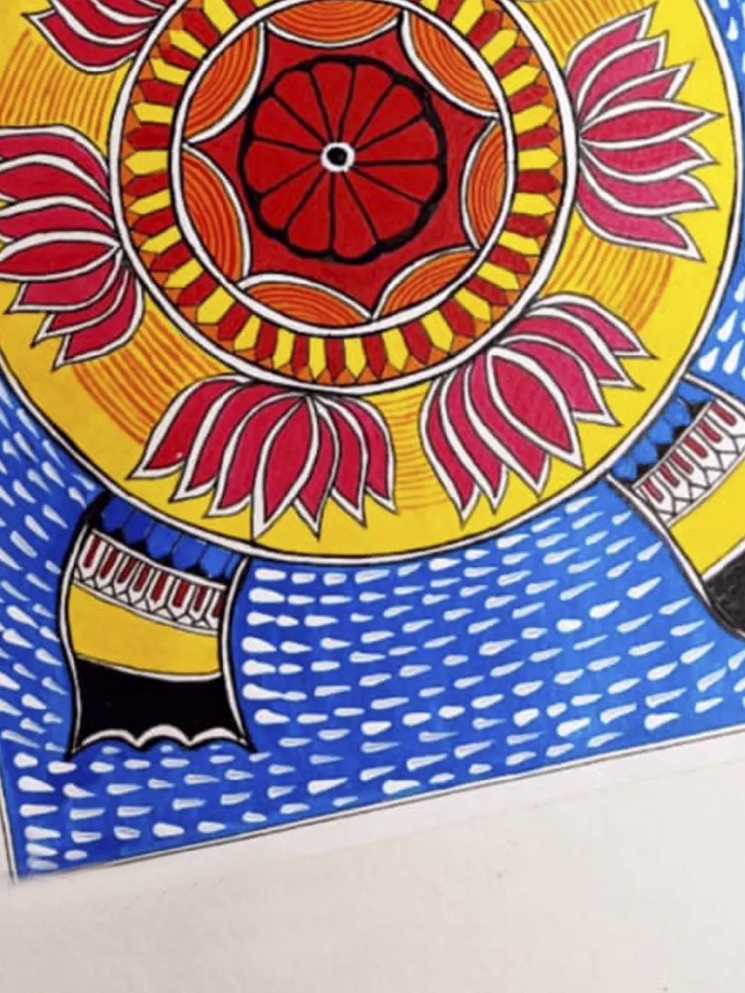 The vibrant colors and meticulous detailing reflect the artist's deep connection to traditional Madhubani techniques. This creation not only celebrates the cultural richness of the art form but also invites viewers to appreciate the profound symbolism embedded in the harmonious depiction of the tortoise and the lotus.