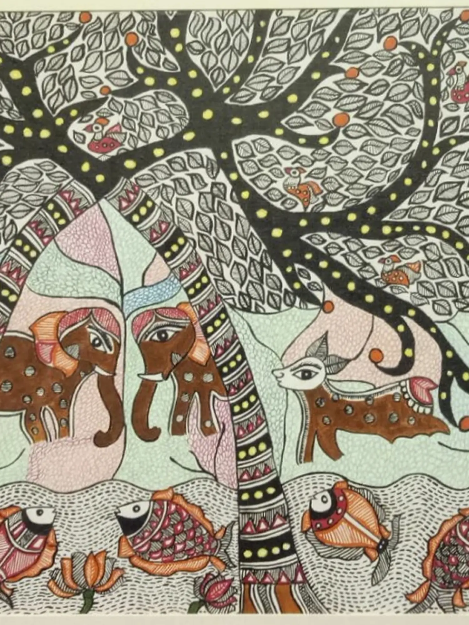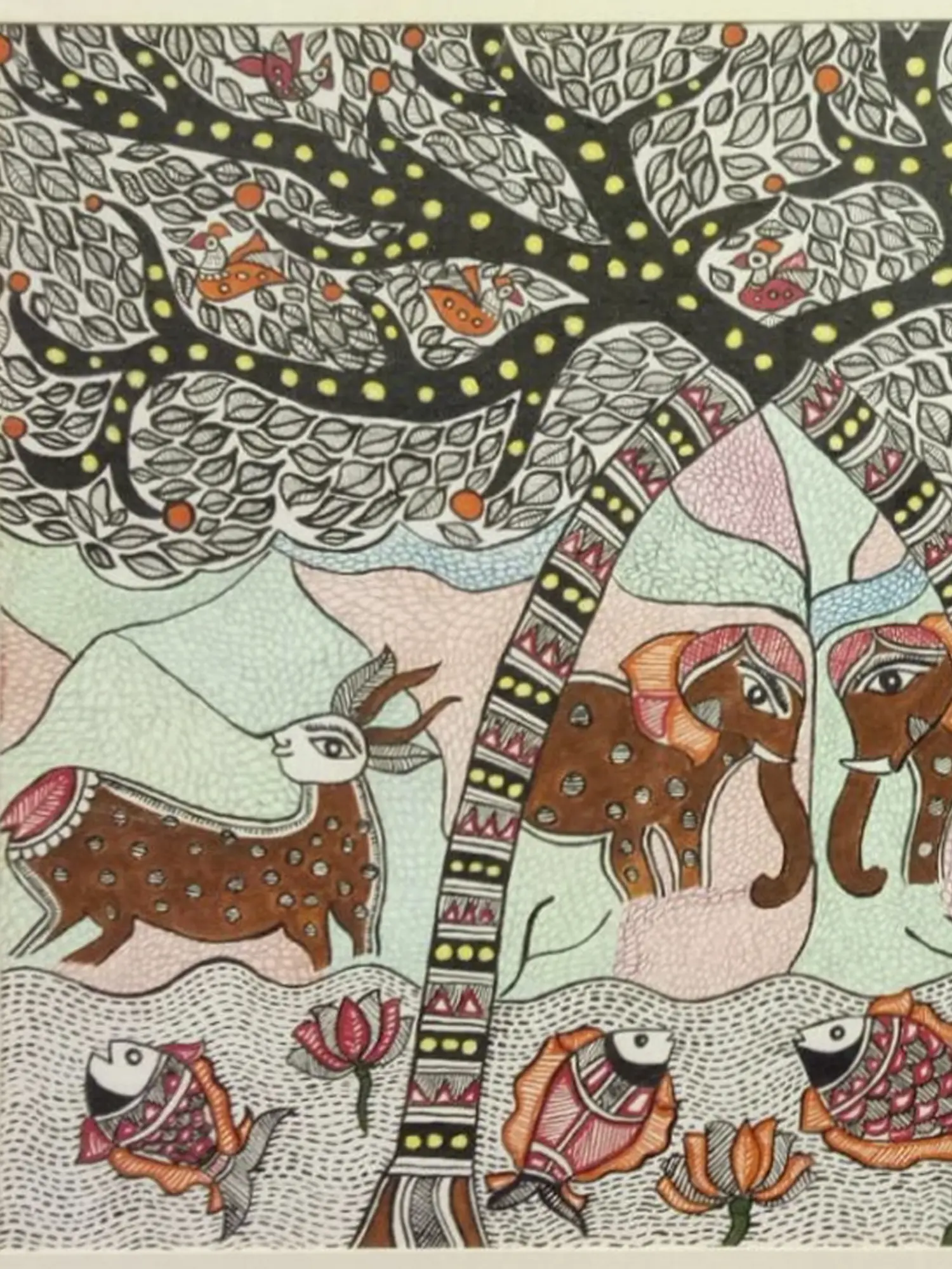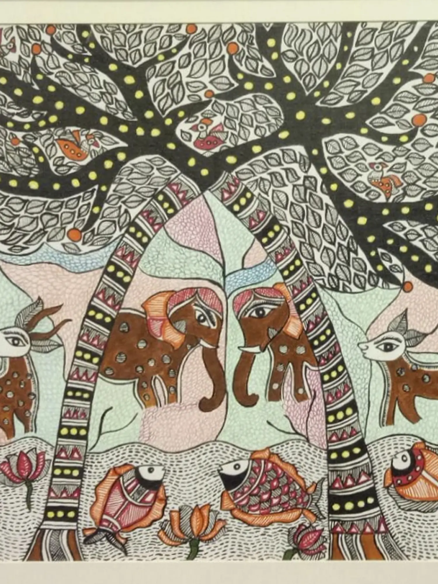 A tribute to the harmony of nature, this rendition unveils a symphony of life with each stroke of colour, weaving a tapestry of wilderness that beckons the soul. Trees stand tall, their verdant canopies whispering ancient tales, while majestic elephants roam with regal grace amidst the tranquil stillness. Deer’s dance, their movements a ballet of freedom. Beneath the surface, fishes glide, while lotus flowers bloom in serene surrender.