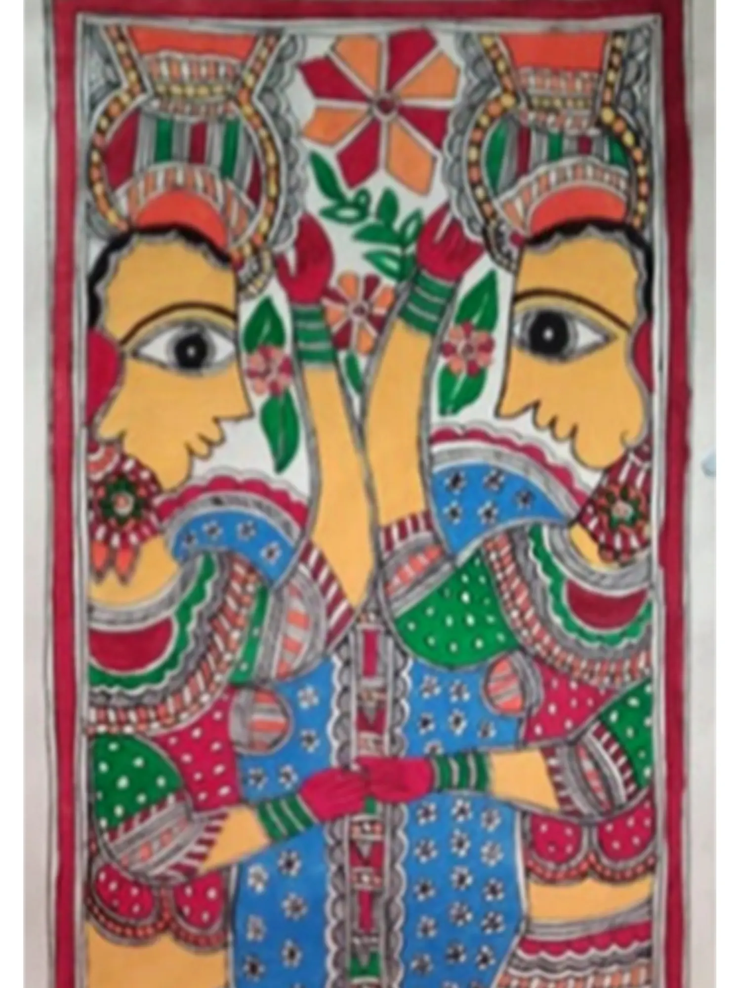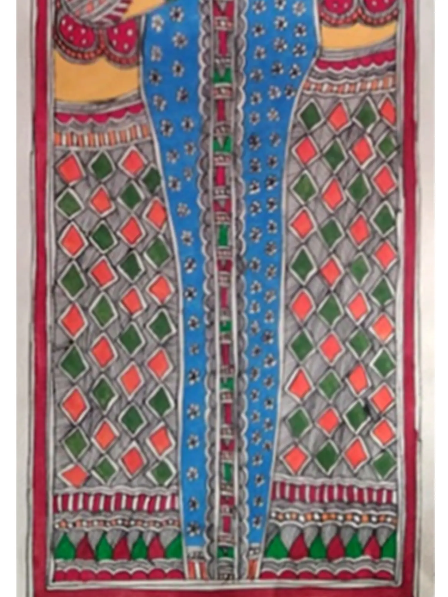 This Madhubani Painting by Archana Jha depicting the Paniharin ritual is a tribute to the culture of the Mithila region. The Paniharin ritual depicted in Madhubani art holds cultural significance. Illustrating the bride fetching water symbolizes a woman's essential role in sustaining family and community life. This ritual, rooted in traditional Indian customs, is a celebration of femininity, depicting the bride's responsibilities and the importance of water as a life-giving element. In Madhubani art, the Paniharin ritual serves as a visual testament to cultural values, societal roles, and the intricate interplay between art and life in the region.