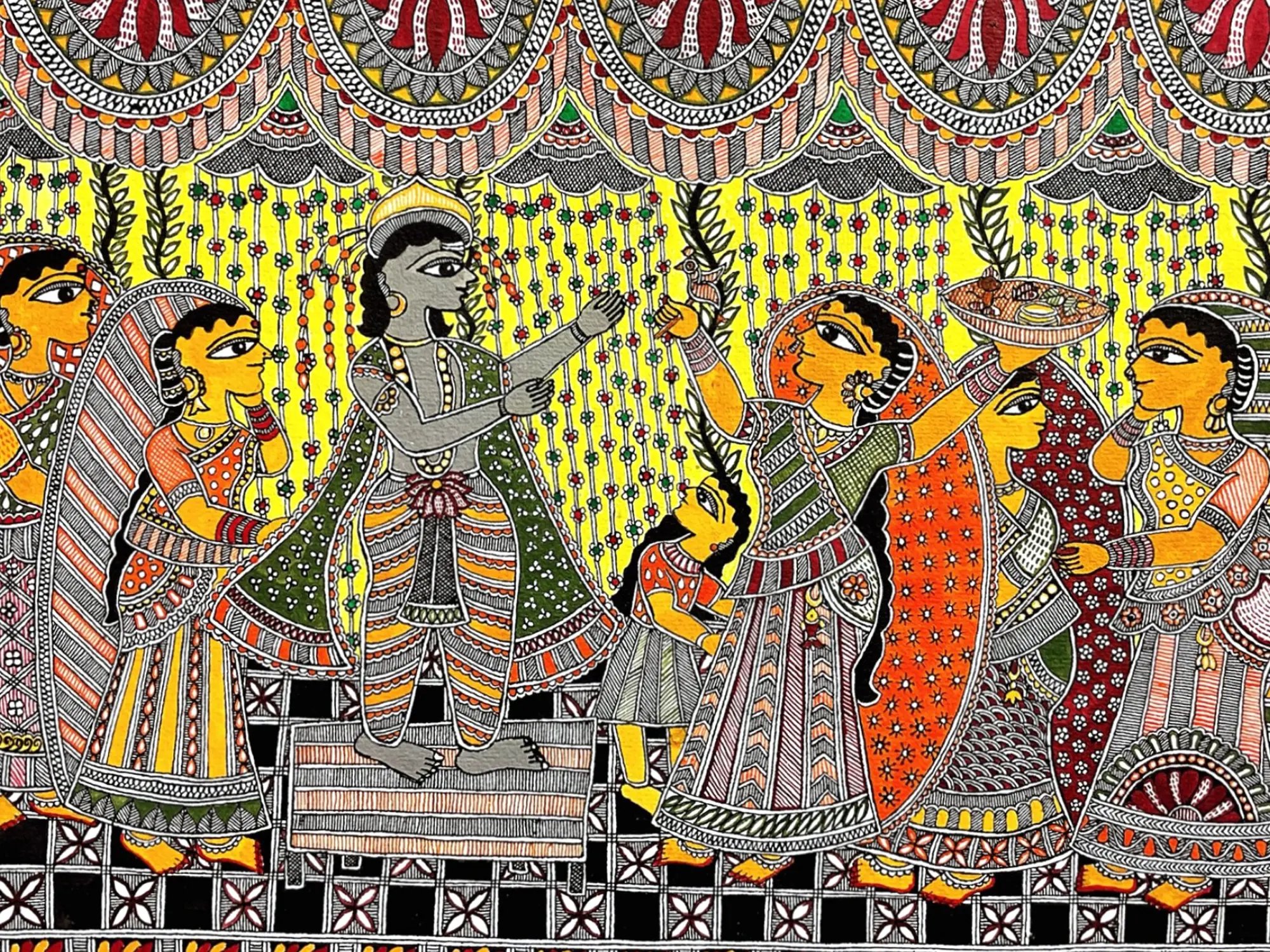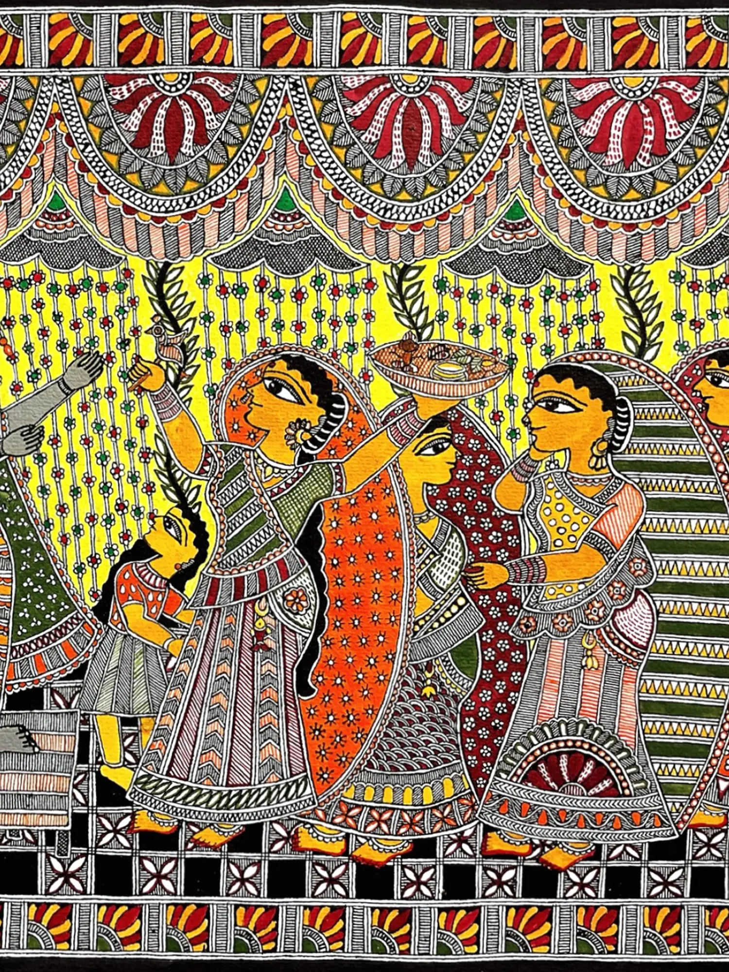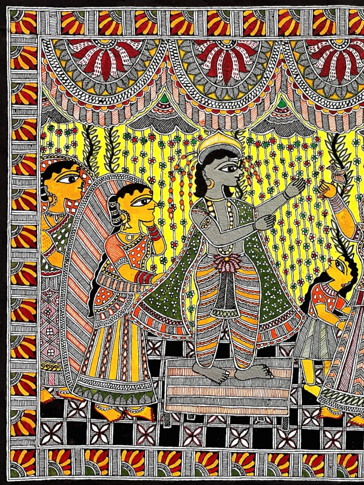 Explore the rich tapestry of wedding rituals with "Parikshan," an evocative portrayal in acrylic on handmade sheets. This artwork immerses viewers in the sacred traditions of marriage, where the Parikshan ceremony symbolises purity and devotion. With delicate brushstrokes and vibrant hues, the artist captures the essence of this ancient rite, inviting observers to witness the union of hearts and souls in a celebration of love and commitment.