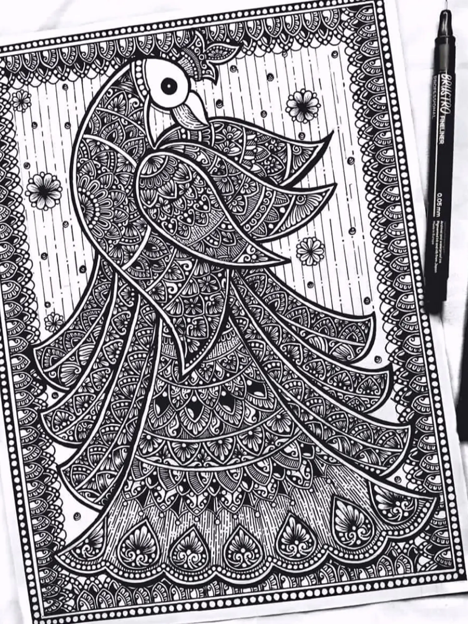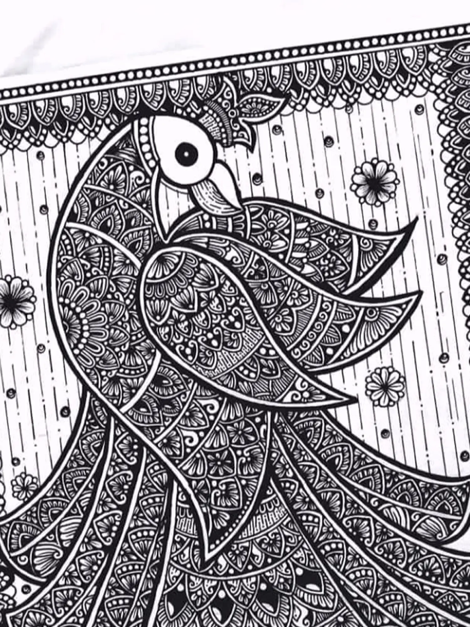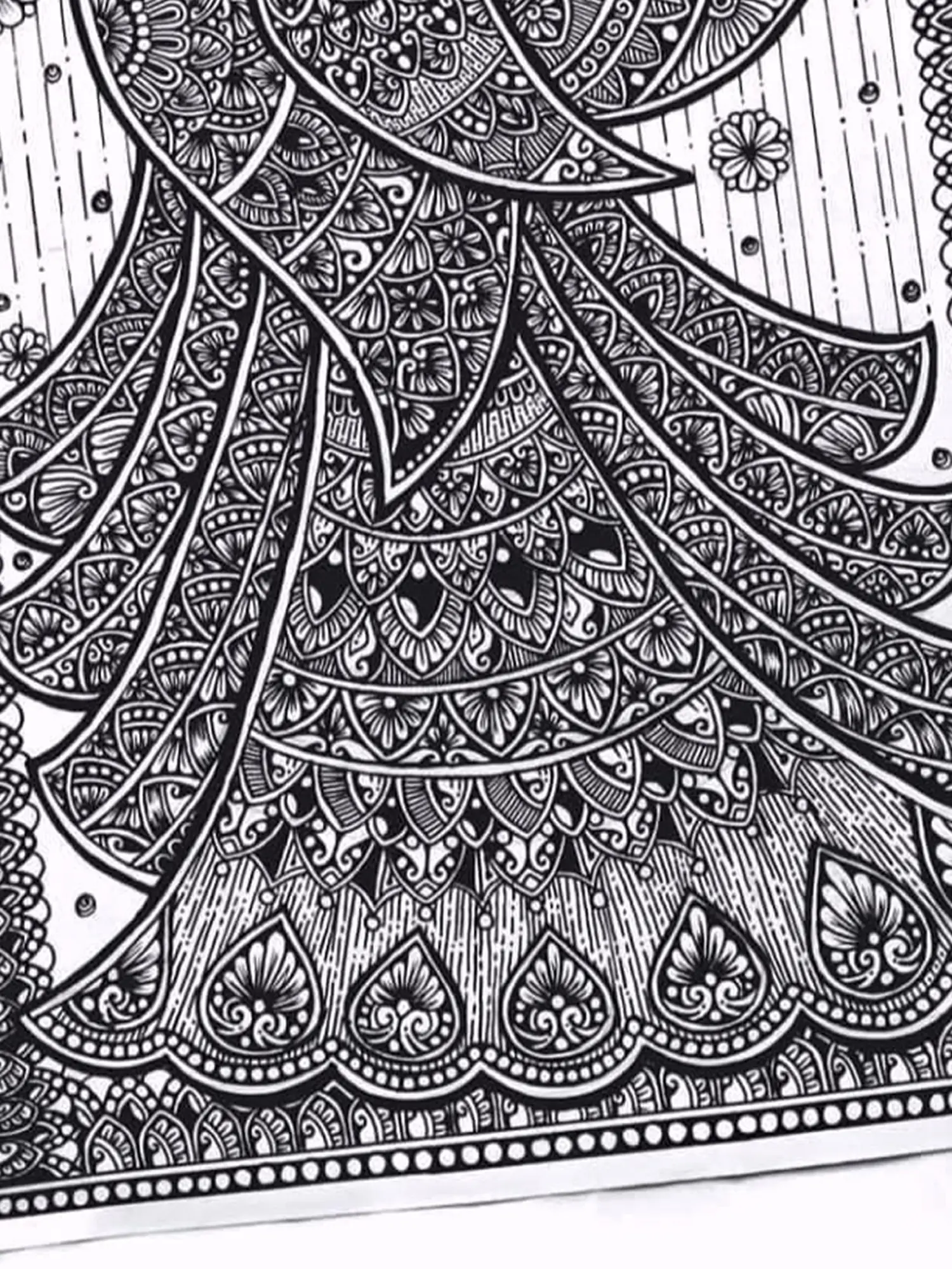 In this striking Black and White Mandala Art, the majestic peacock unfurls its resplendent tail, a symbol of grace, beauty, and regality. Intricate patterns and swirling motifs capture the peacock's iridescent plumage, infusing the artwork with a sense of awe and admiration. Against the contrasting backdrop, the peacock stands as a timeless emblem of elegance and magnificence, inviting viewers to marvel at its splendour. This mandala celebrates the allure of nature's creations, weaving together elements of mystique and majesty in a captivating display of artistry.