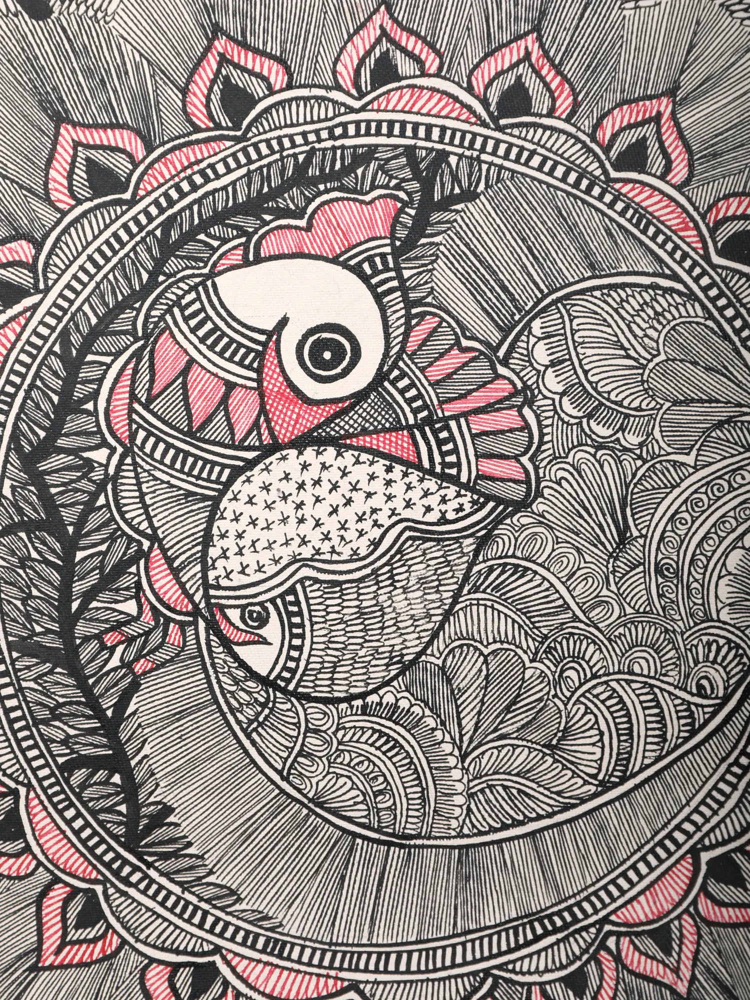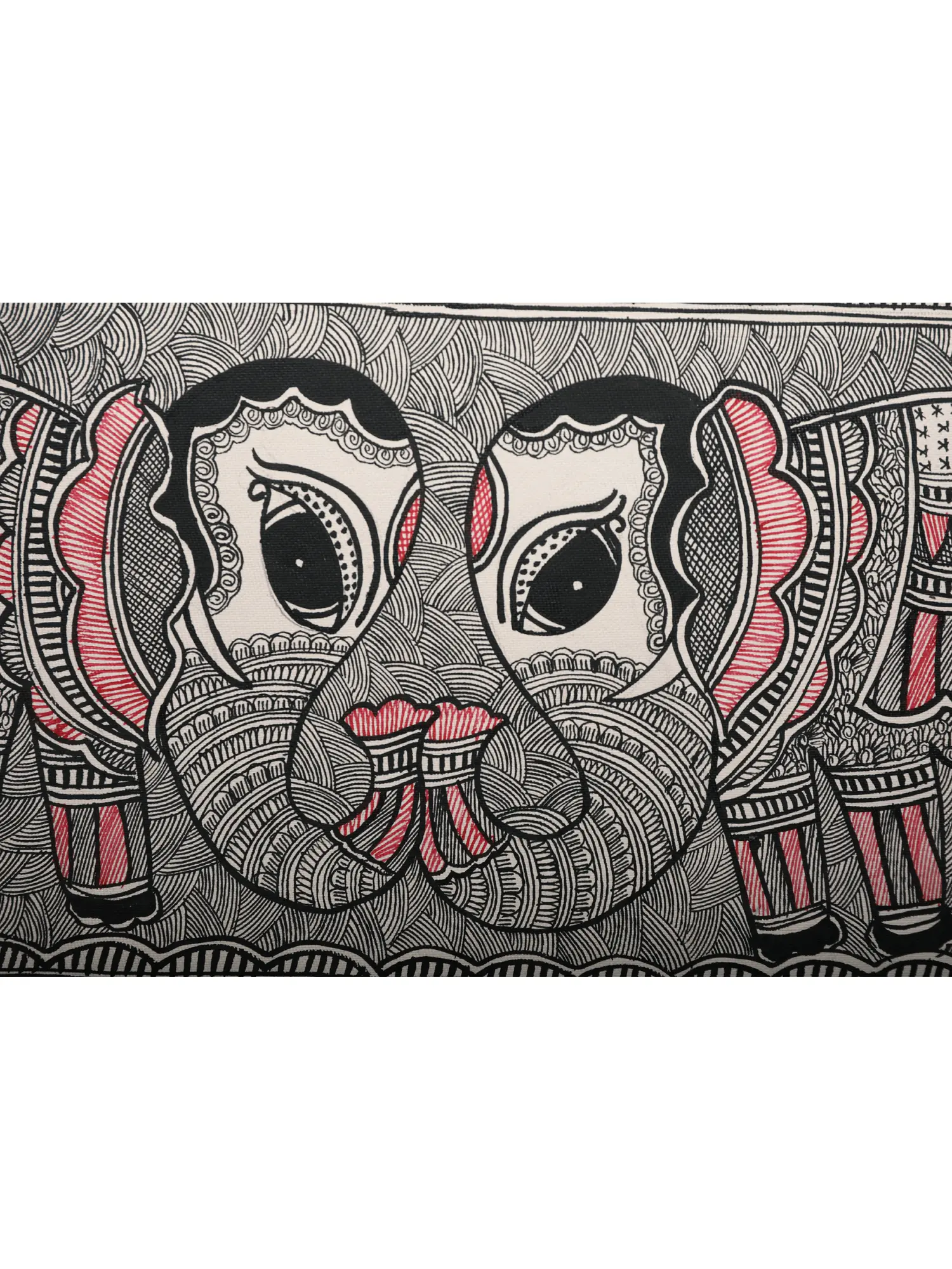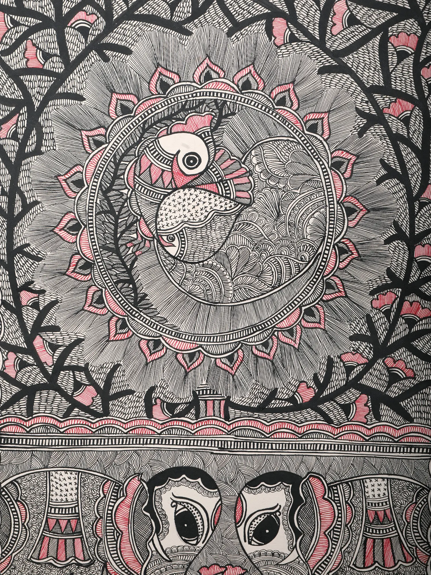 A Majestic Madhubani Masterpiece: Peacock and Elephants