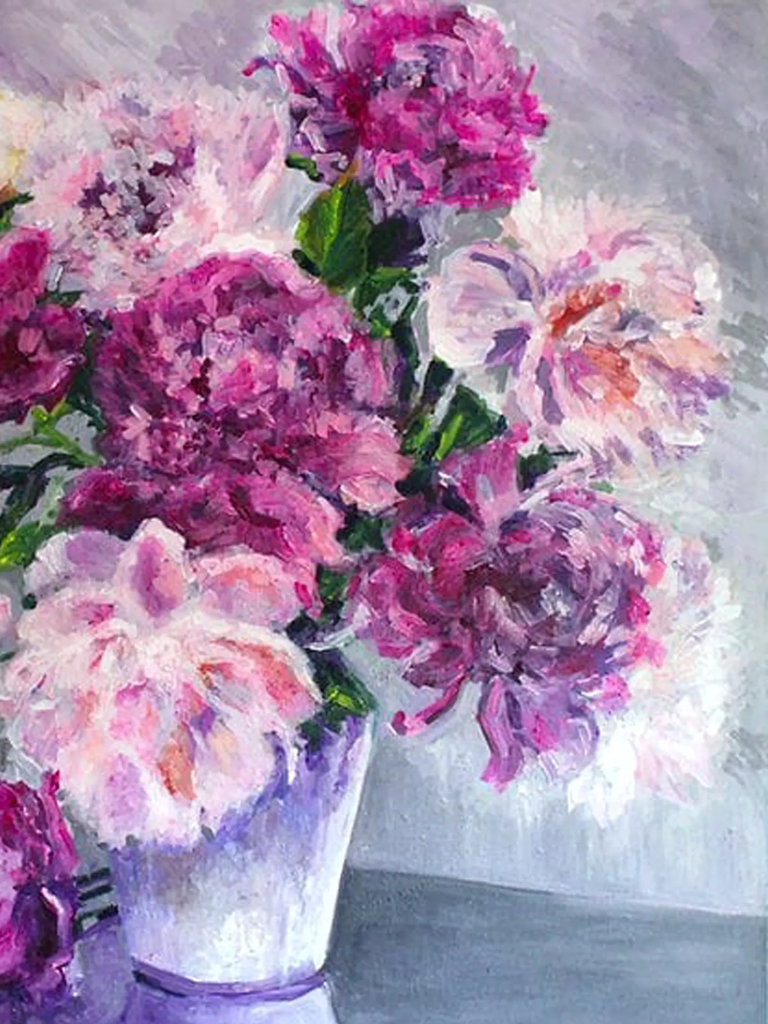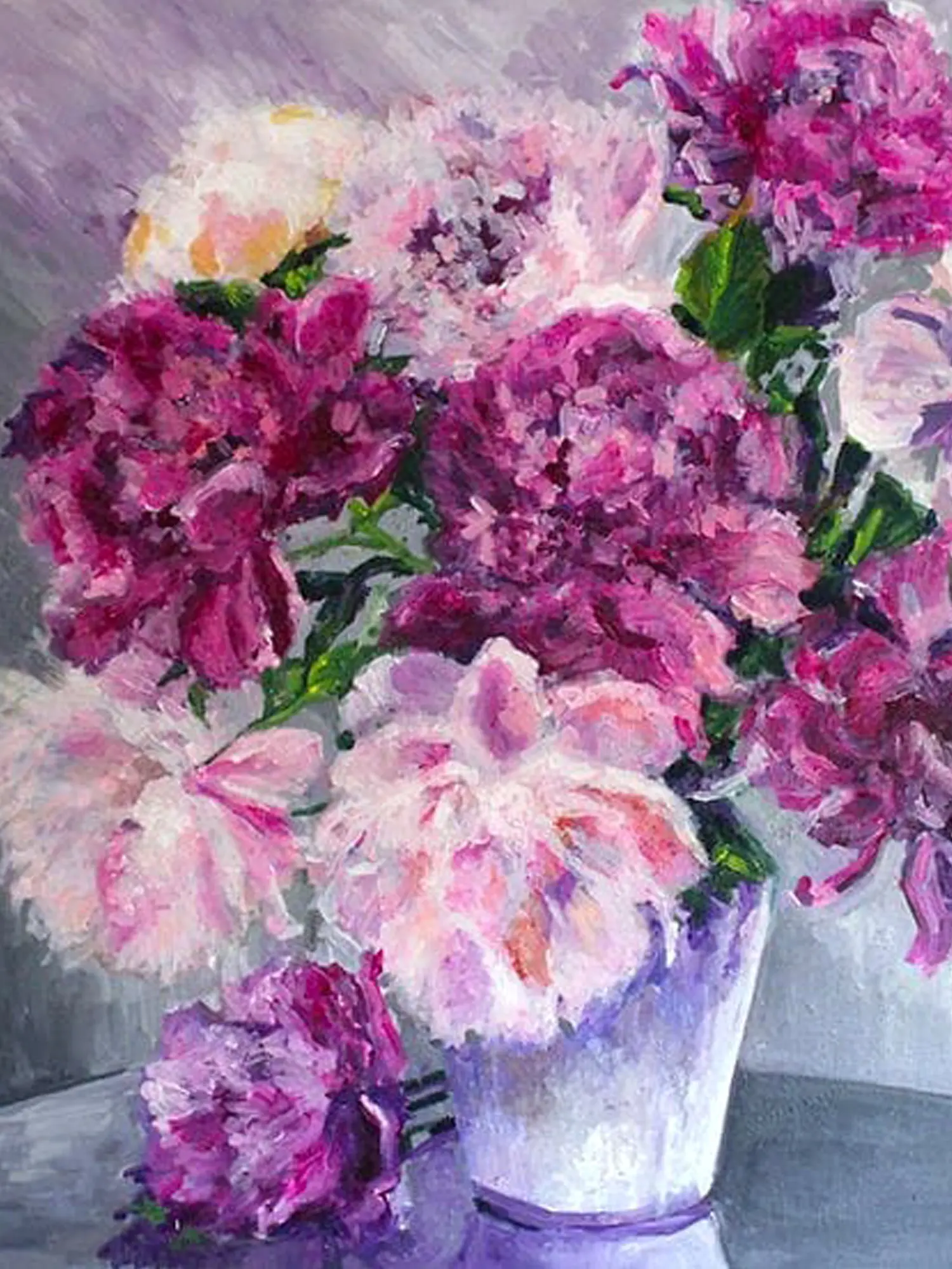 Delight in the breathtaking elegance of "Peonies - Bunch of Flowers," rendered in luscious acrylics on canvas with exquisite detail and depth. Each bloom bursts forth with vibrant colour and delicate petals, exuding a sense of vitality and beauty that captivates the senses. In rich foliage, the peonies dance in celebration of nature's bounty and the ephemeral joys of life. Let their radiant presence infuse your space with warmth and vitality, filling every corner with the glow of natural splendour.