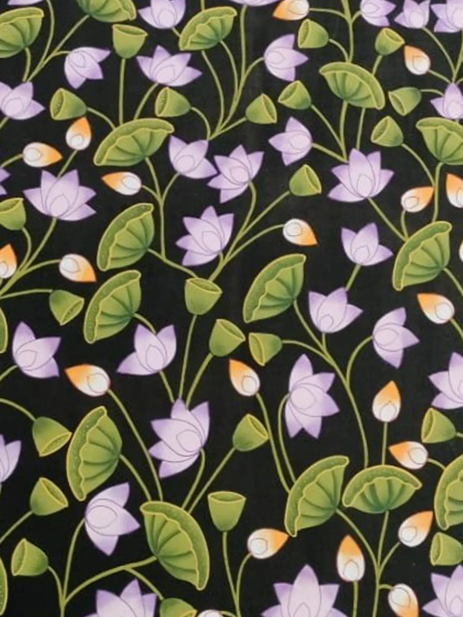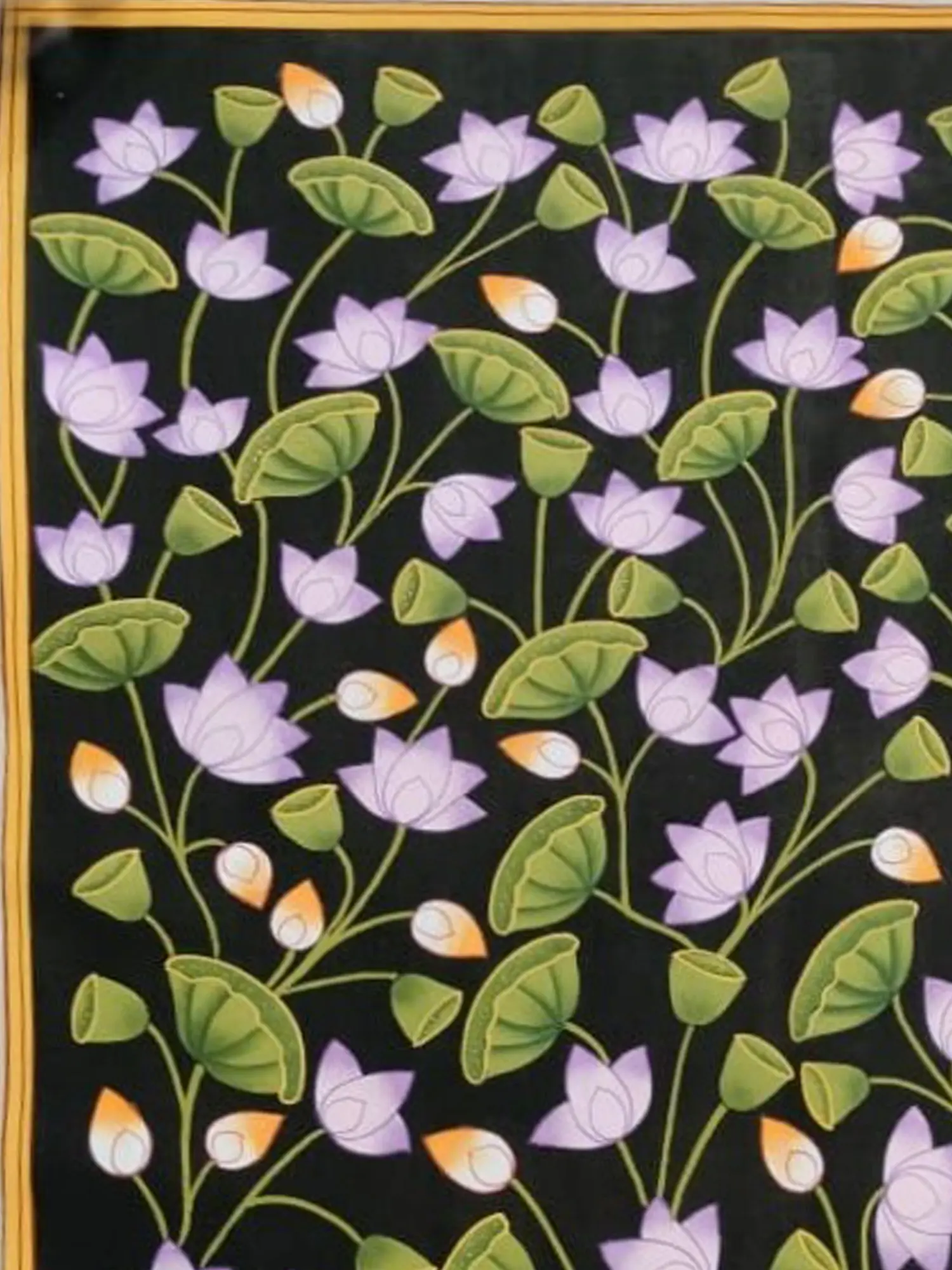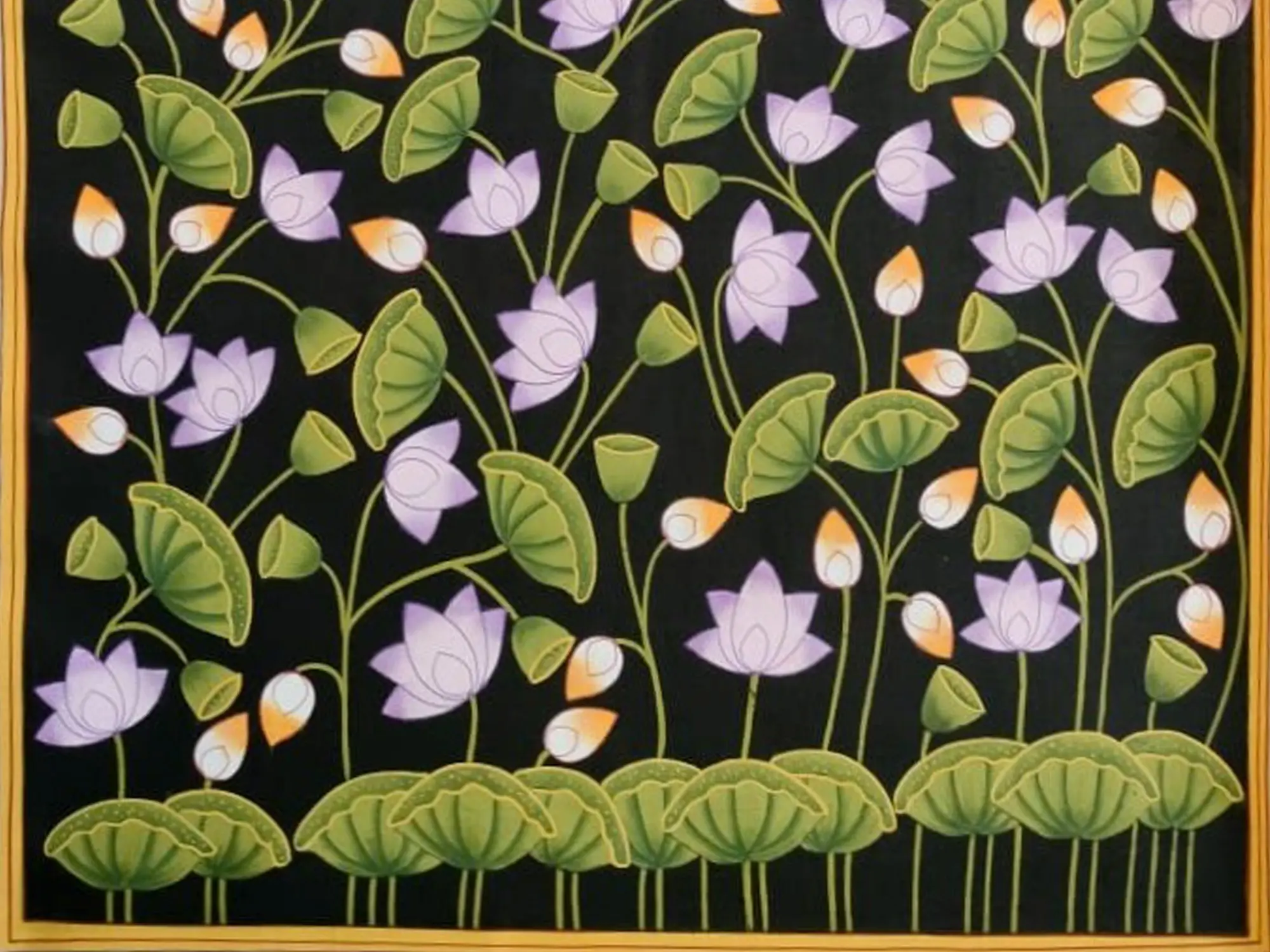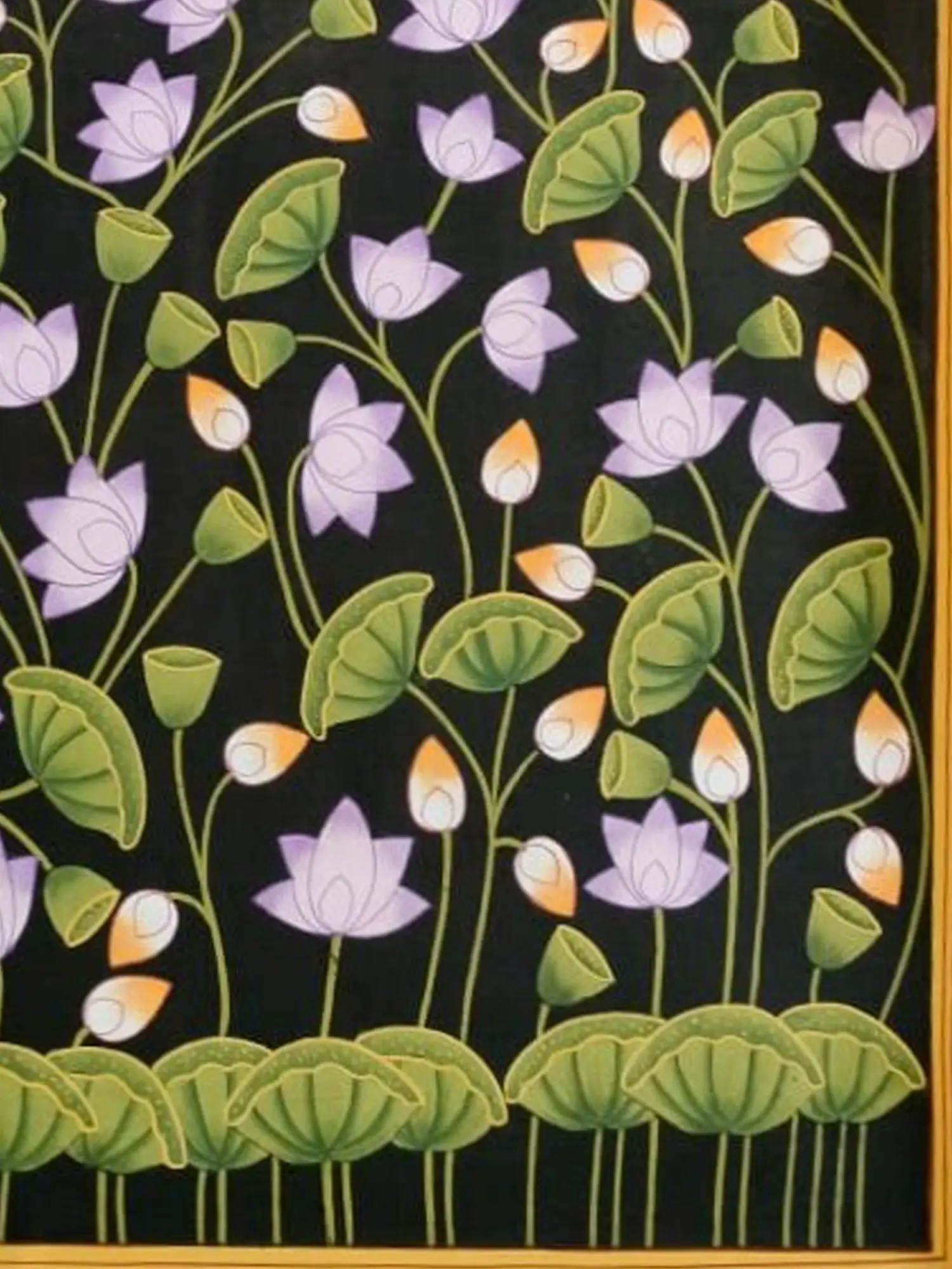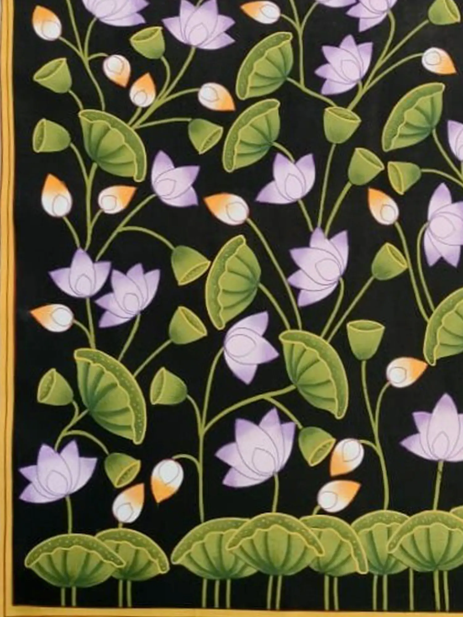 In this enchanting portrayal, the Pink Padma Talai of Pichwai emerges as a sanctuary of divine beauty and spiritual grace. Crafted with natural colours on cotton cloth, the artwork exudes a sense of timeless elegance and celestial allure. The Pink Lotus blooms with radiant purity and spiritual enlightenment. The lotus becomes a symbol of transcendence and inner peace. It's a portrayal that celebrates the eternal beauty of the Lotus flower, inviting viewers into a world of spiritual contemplation and divine communion.