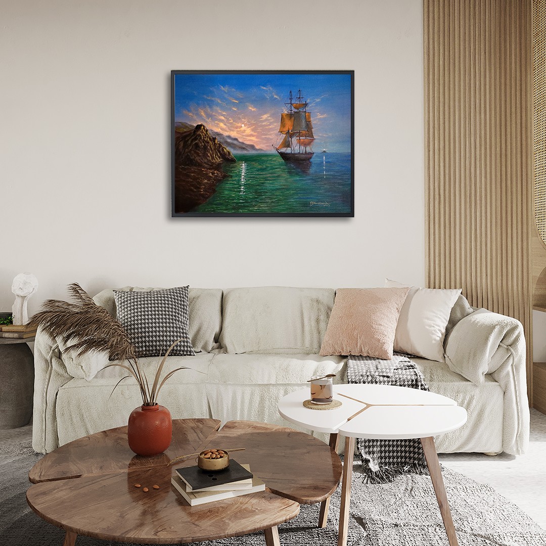 Floating Ship In The Moonlight | Oil On Paper | By Farukh S Nadaf