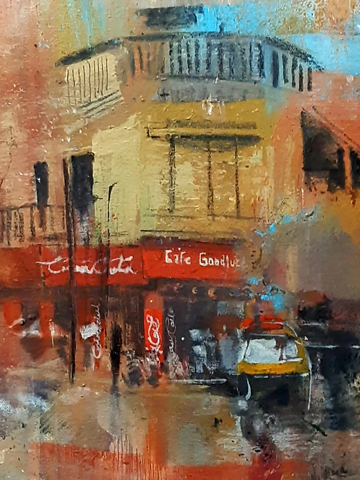 This piece resonates with the spirit of Indian city life, specifically evoking a sense of place reminiscent of Pune. The artist skillfully translates the feeling of a lively street scene, capturing the essence of local commerce and transit. You'll recognize the familiar charm of Indian urban architecture and the ubiquitous presence of auto-rickshaws, rendered with an artist's discerning eye. It's an homage to the spirit and character of a cherished locale.