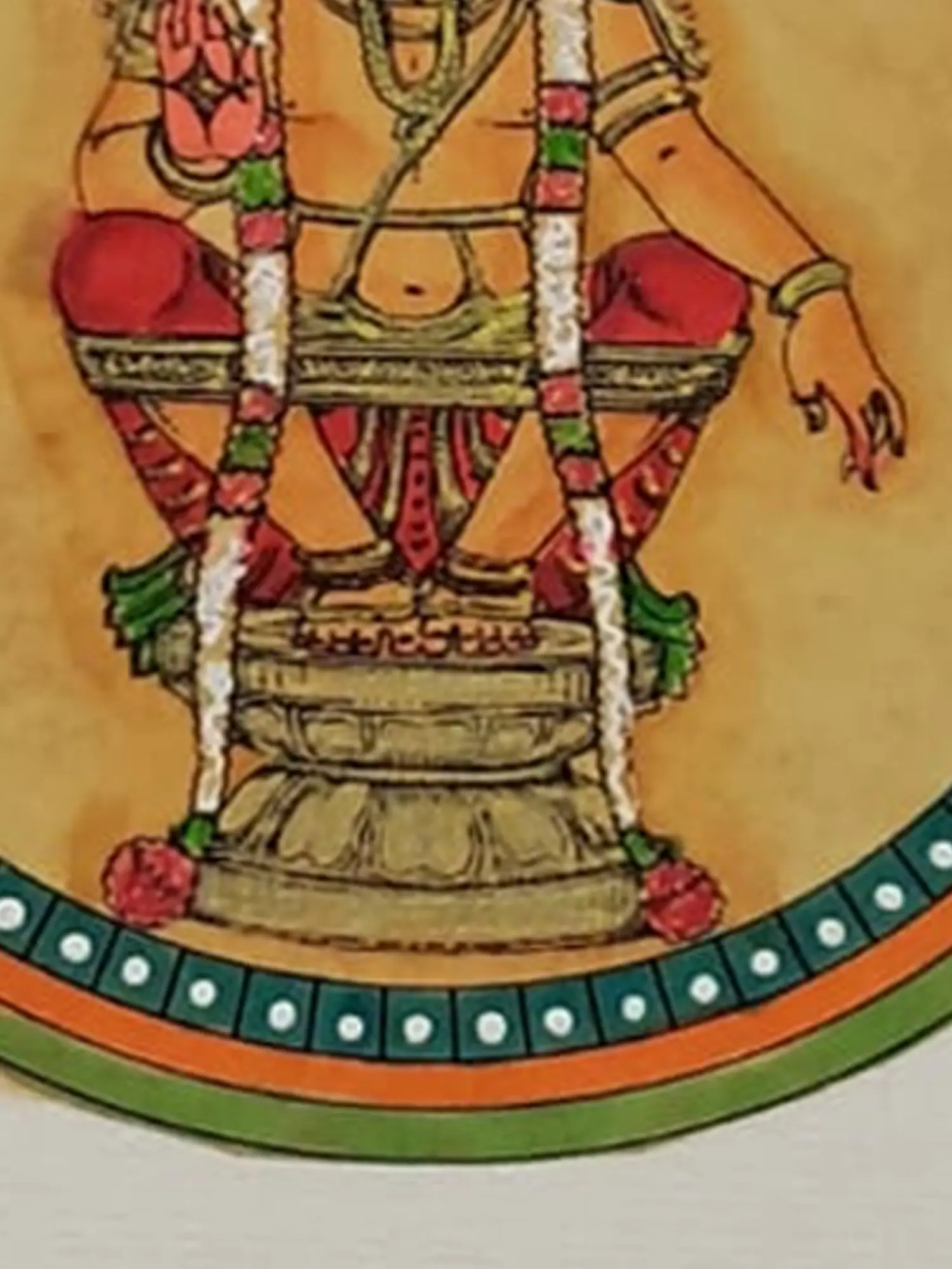 In Babita's portrayal of Lord Ayyappa Swamy, crafted with natural colors on paper, the deity is seated in a serene Yoga posture, adorned with the sacred Yoga Patta. Lord Ayyappa sits majestically on a lotus pedestal, symbolizing purity and spiritual transcendence. The intricate detailing includes a garland that gracefully touches the bottom of the pedestal, enhancing the divine ambiance.