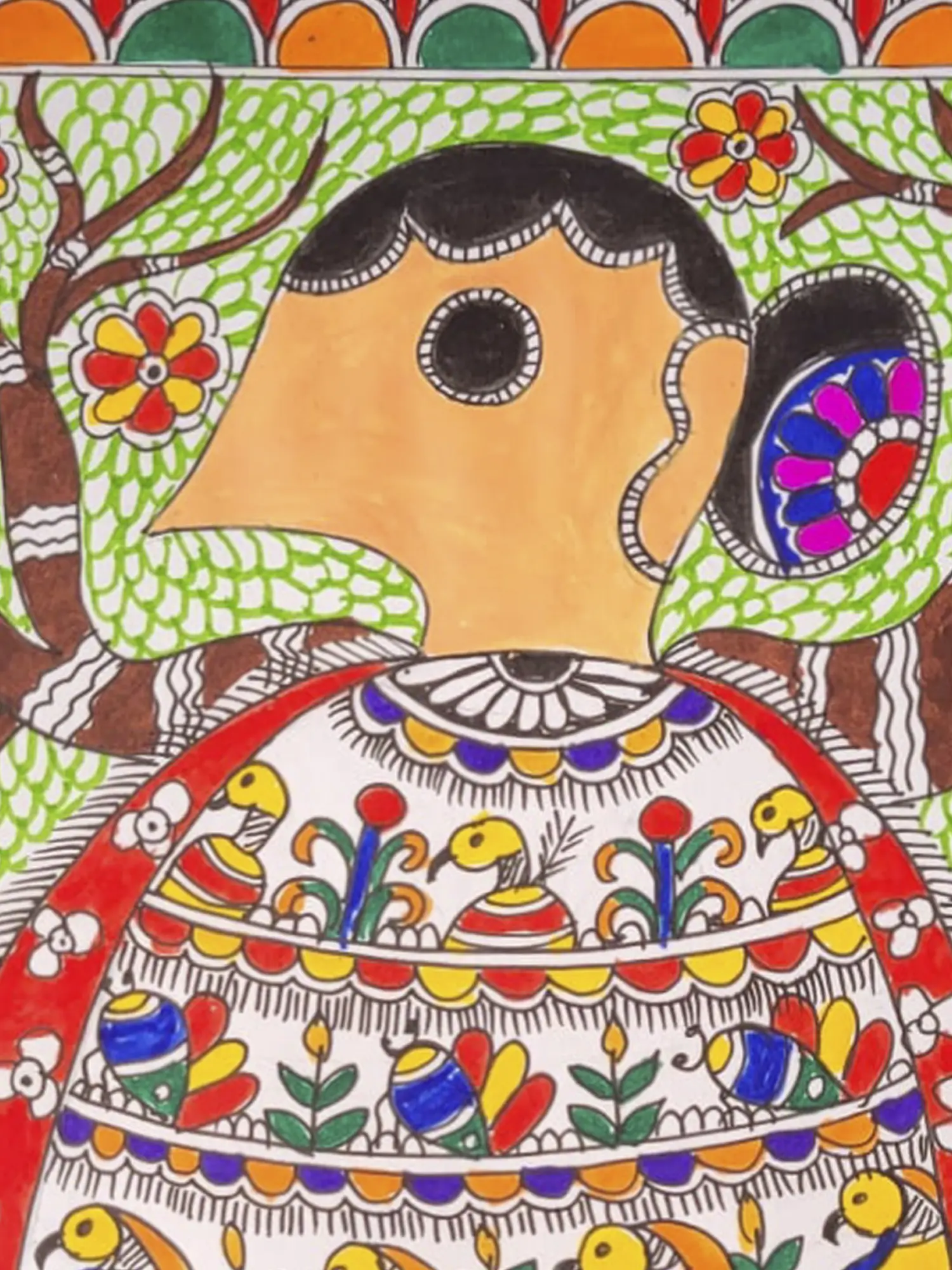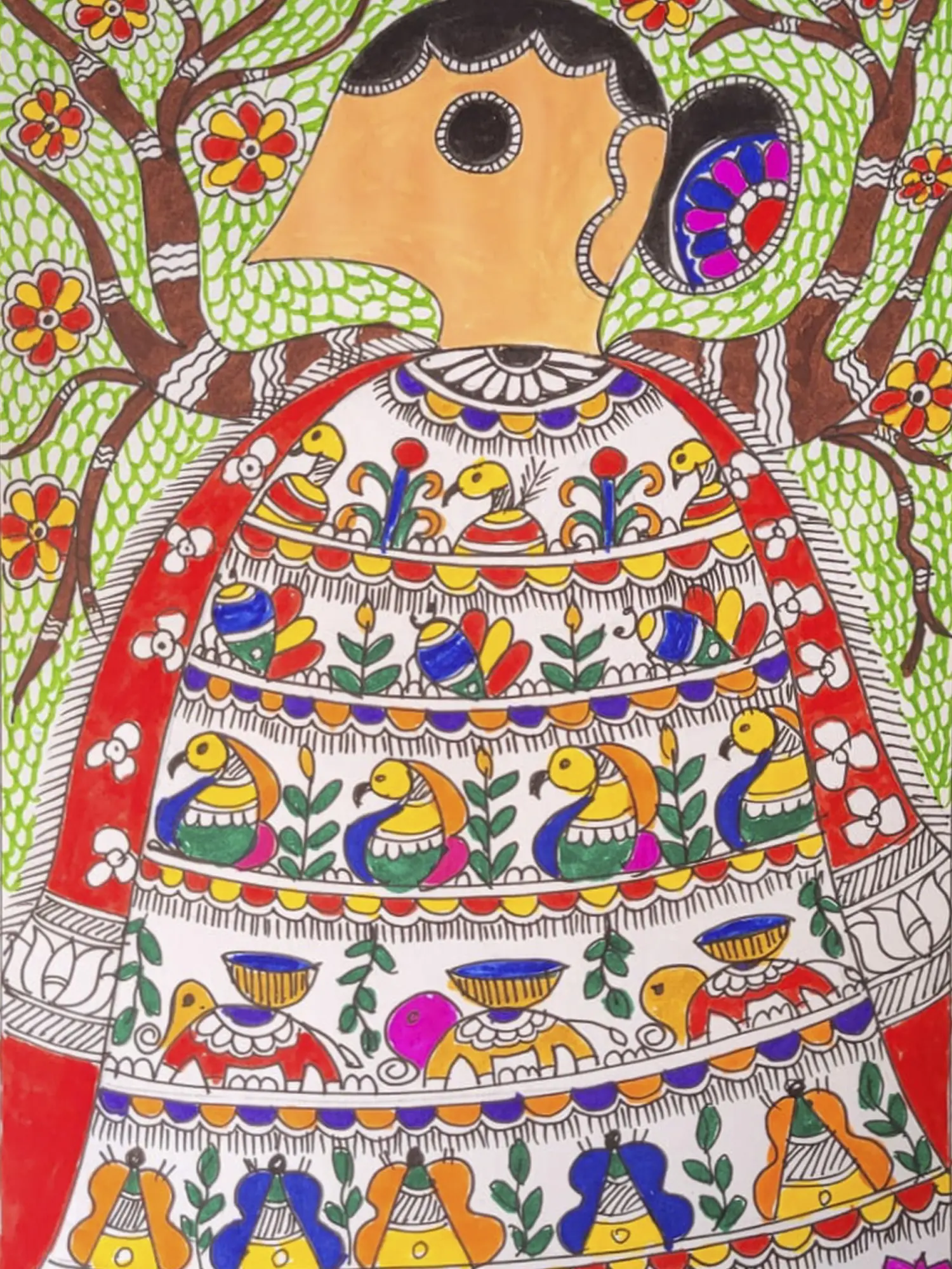 This artwork draws inspiration from folk art traditions, particularly those that celebrate the divine feminine and the cyclical nature of life. The bold outlines and vibrant color palette are characteristic of indigenous art forms, offering a glimpse into rich cultural heritage and the enduring power of storytelling through visual narratives.