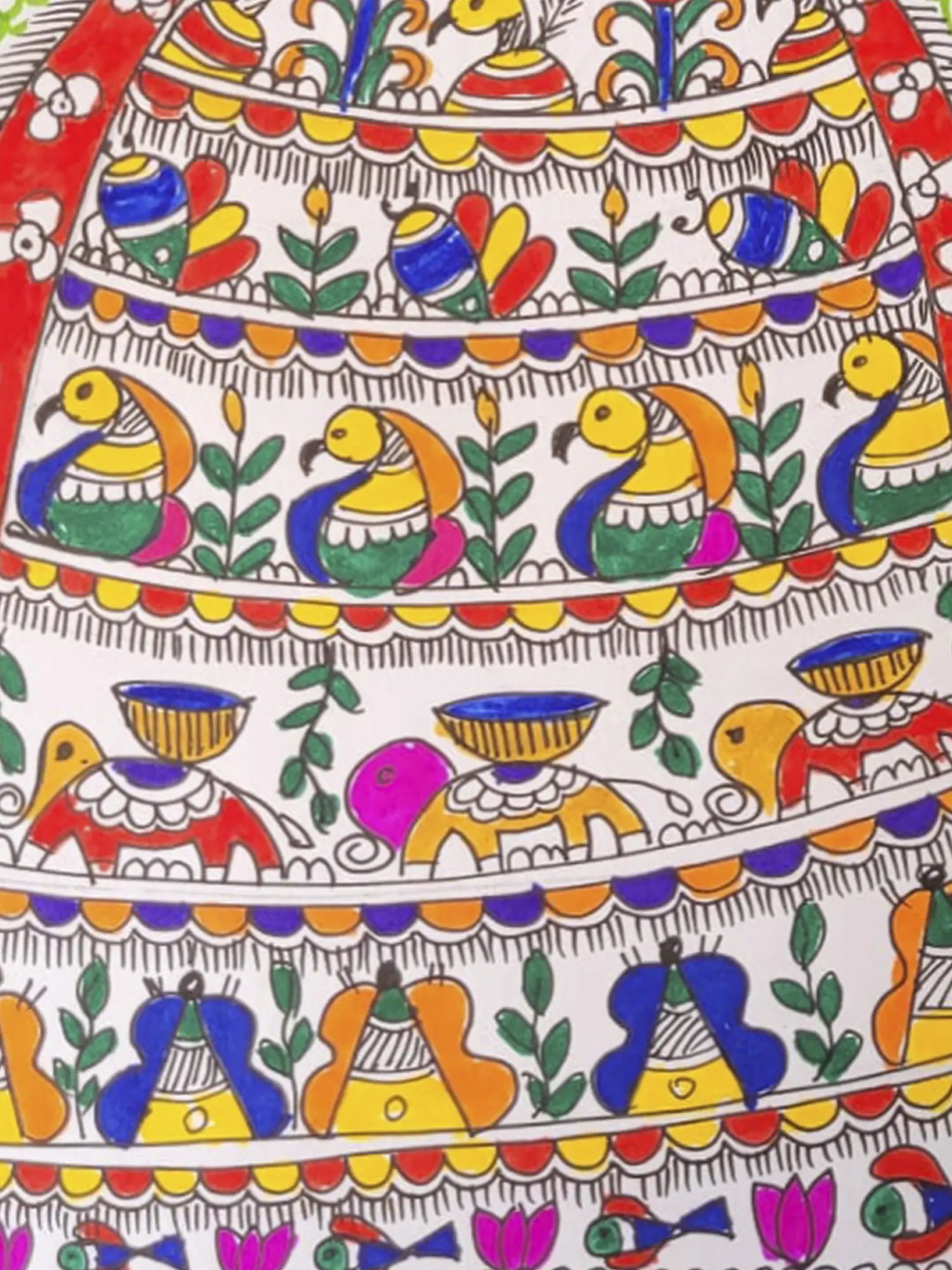 Observe the captivating depiction of a woman adorned with patterns that echo the natural world. The flora and fauna woven into the design—birds, flowers, and even elephants—symbolize fertility, abundance, and auspicious beginnings, reflecting traditional motifs. The dimensions, approximately 11.7 inches in height and 8.3 inches in width, provide an intimate yet impactful presence, perfect for close contemplation.