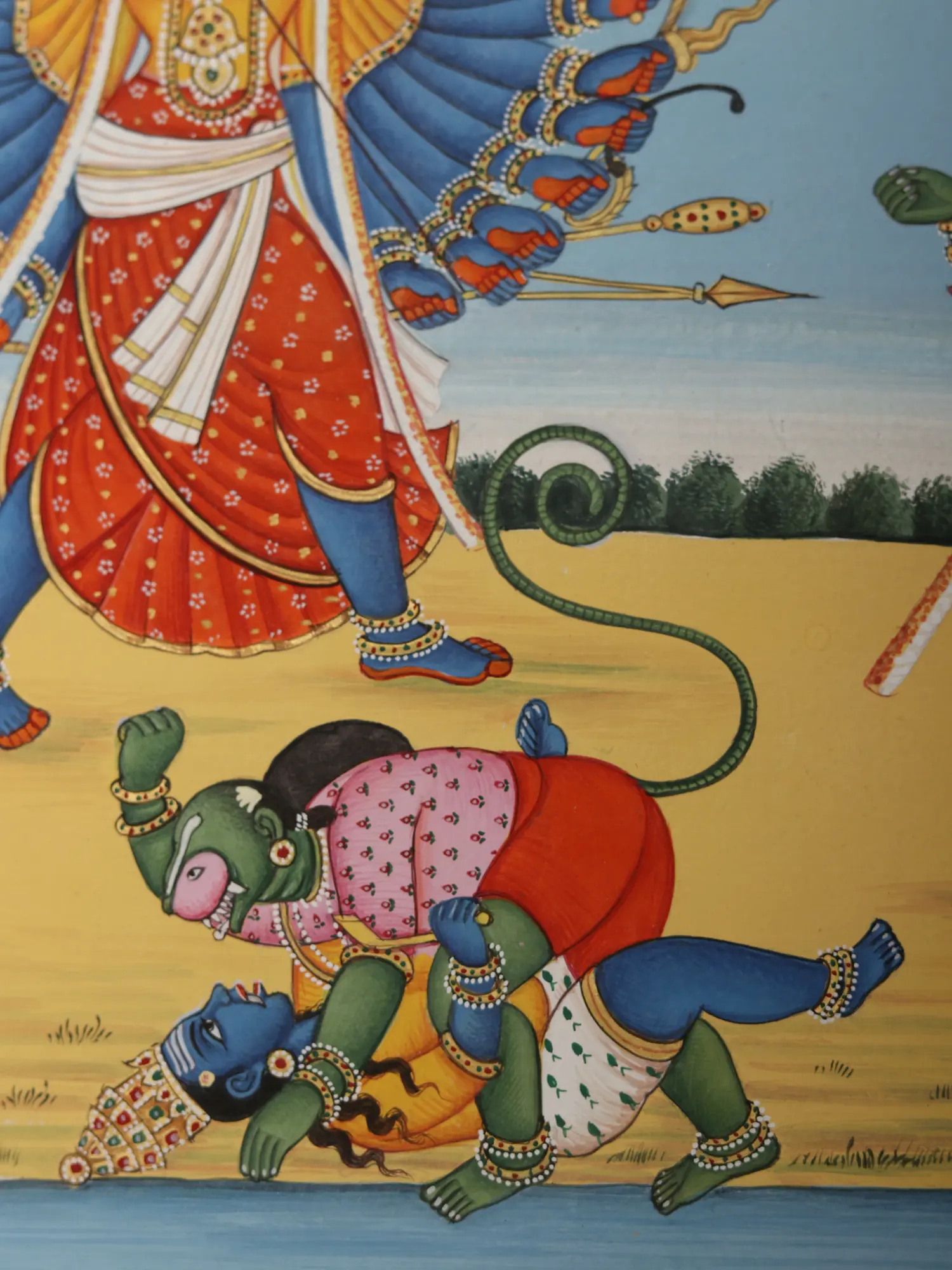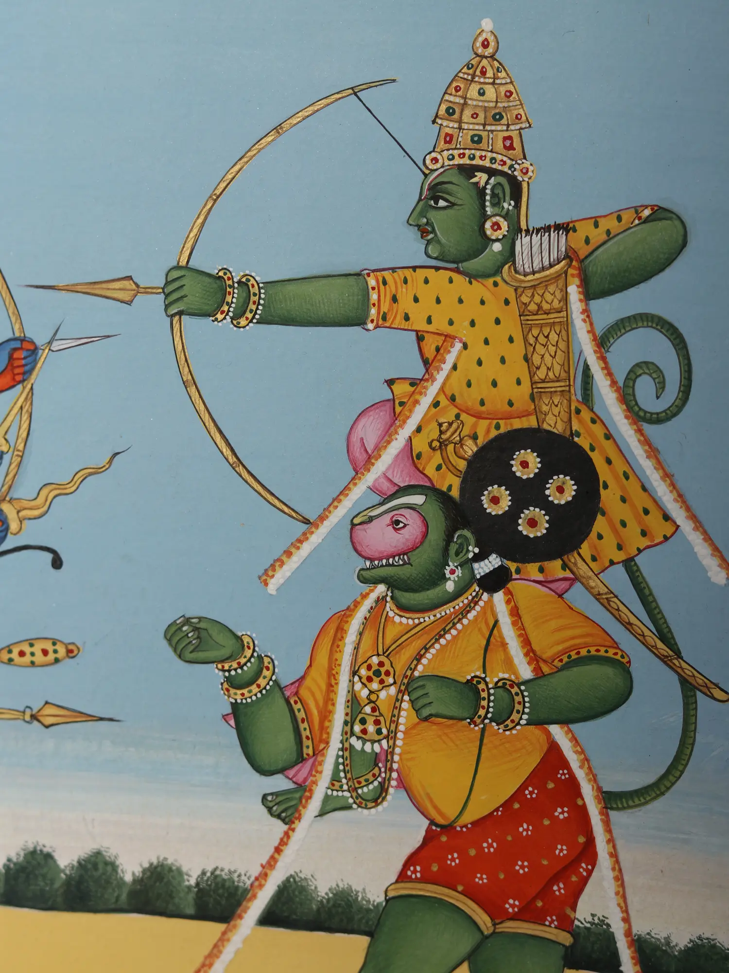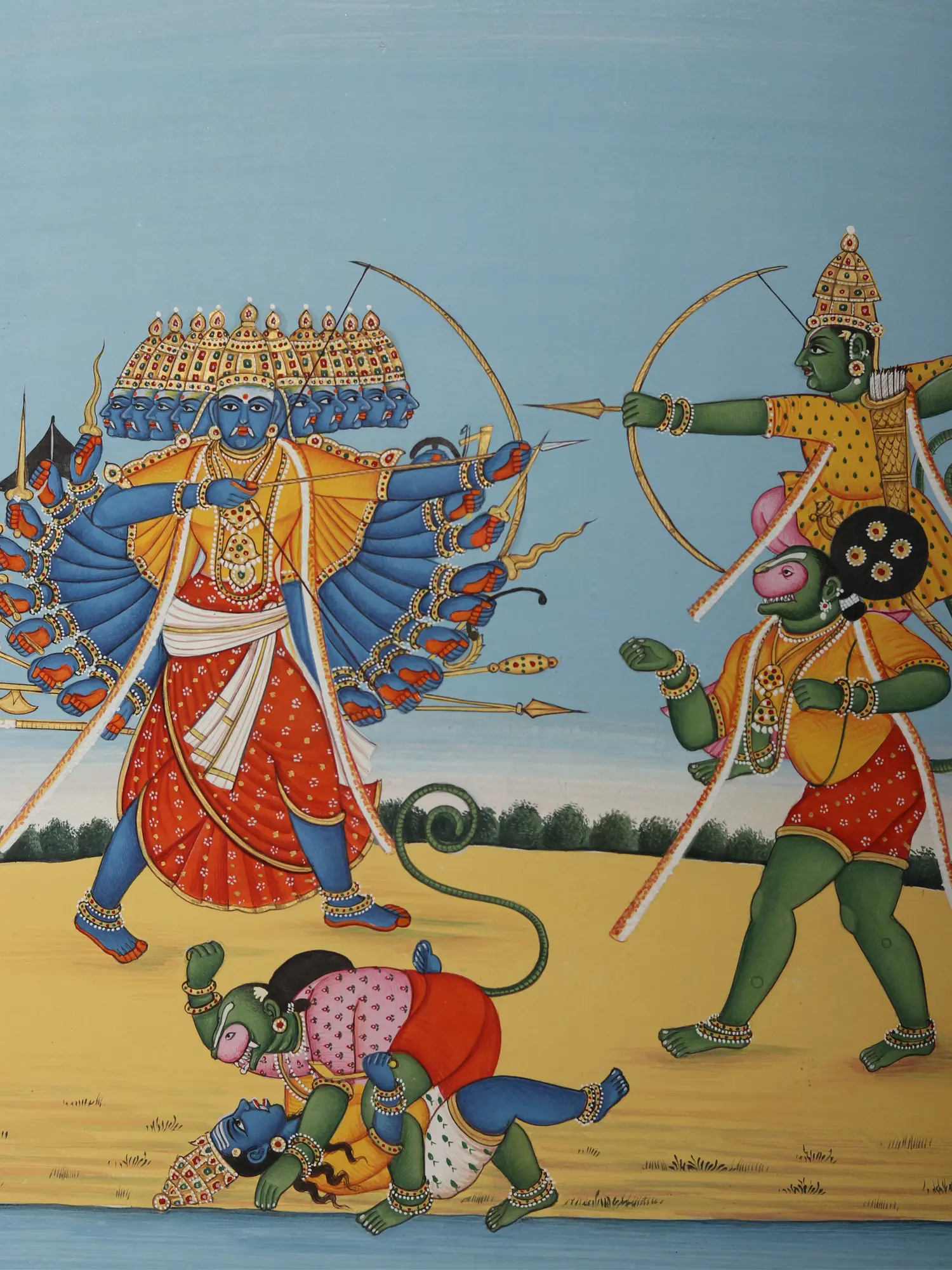 The striking visual of the multi-headed Ravana, rendered in deep blues and adorned in regal attire, immediately commands attention. Opposite him stands the serene yet formidable Lord Rama, poised to unleash his arrow, accompanied by the loyal Hanuman. The composition, measuring 9.5 inches in height and 7.5 inches in width, masterfully balances the intensity of the duel with a serene background of a tranquil sky and earth, inviting contemplation.