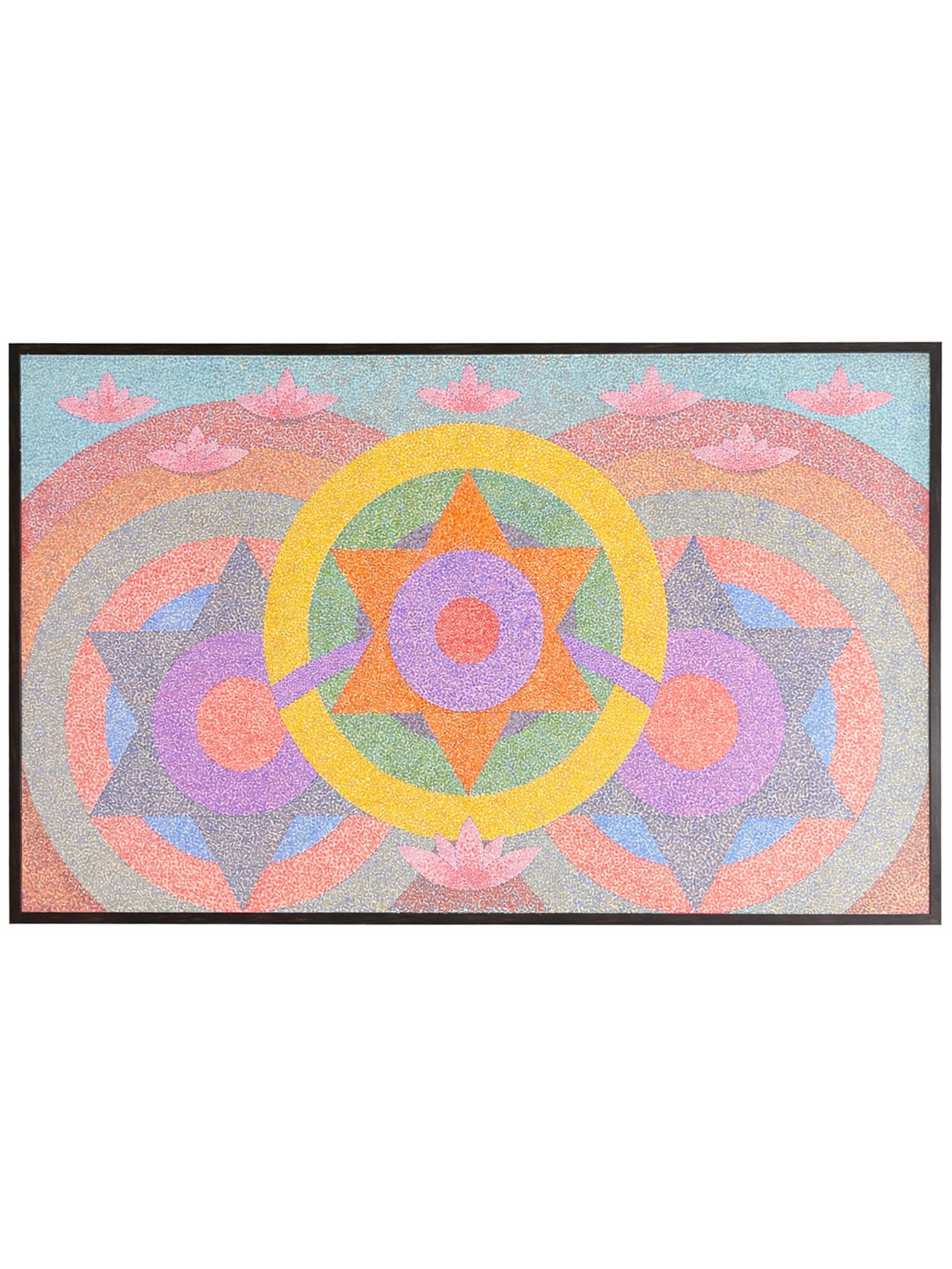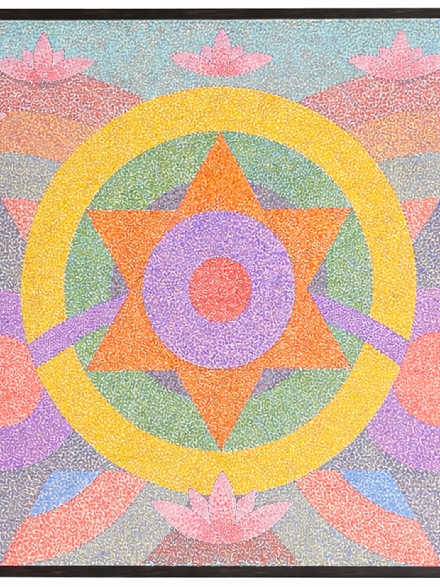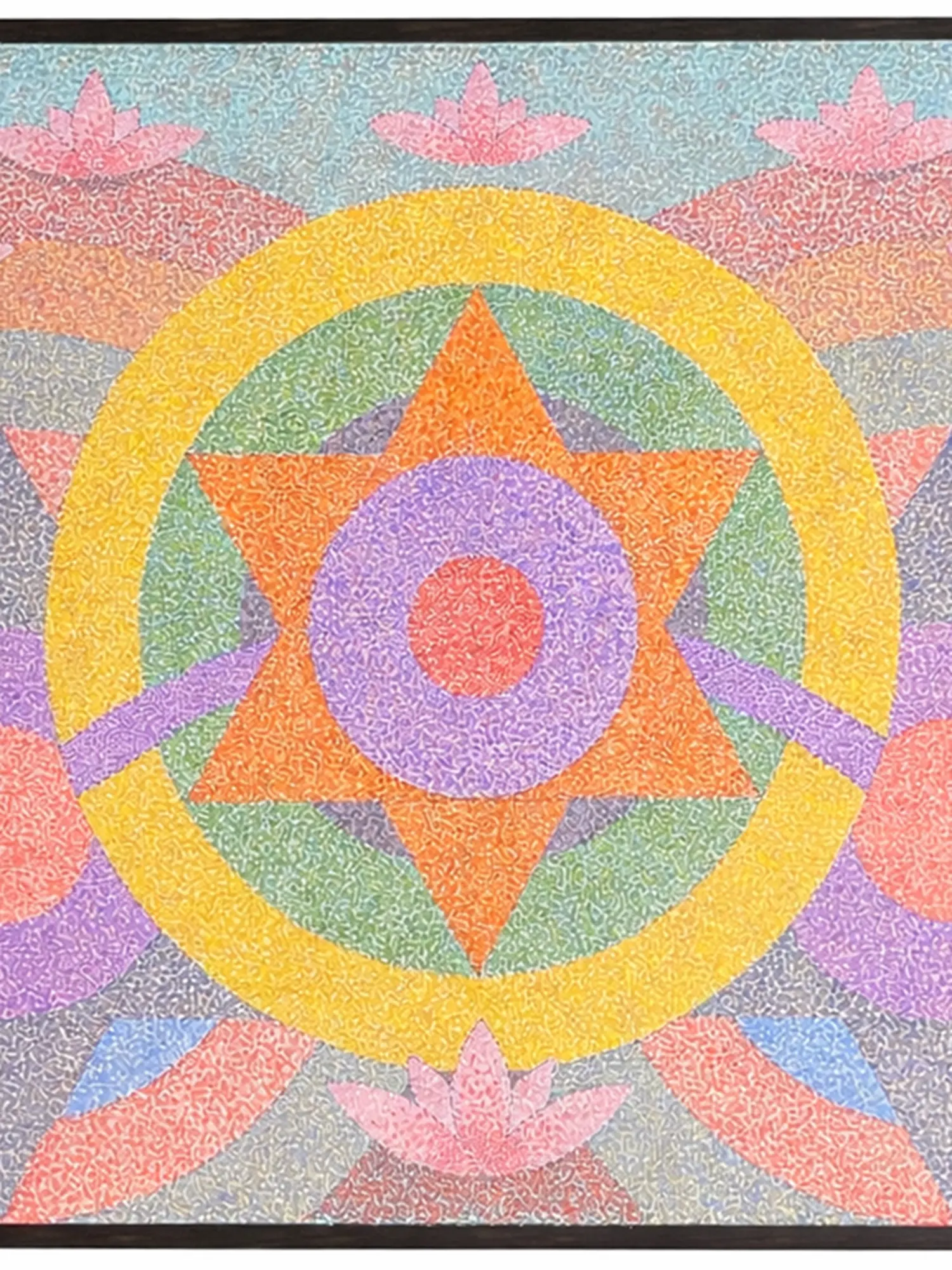 The composition unfolds with a breathtaking symmetry, featuring concentric circles and starbursts that evoke a sense of cosmic order. A luminous yellow halo embraces a central, multi-pointed star, radiating energy outwards through a spectrum of calming hues. Delicate lotus blossoms emerge from the gentle curves of the background, symbolizing purity and spiritual growth.