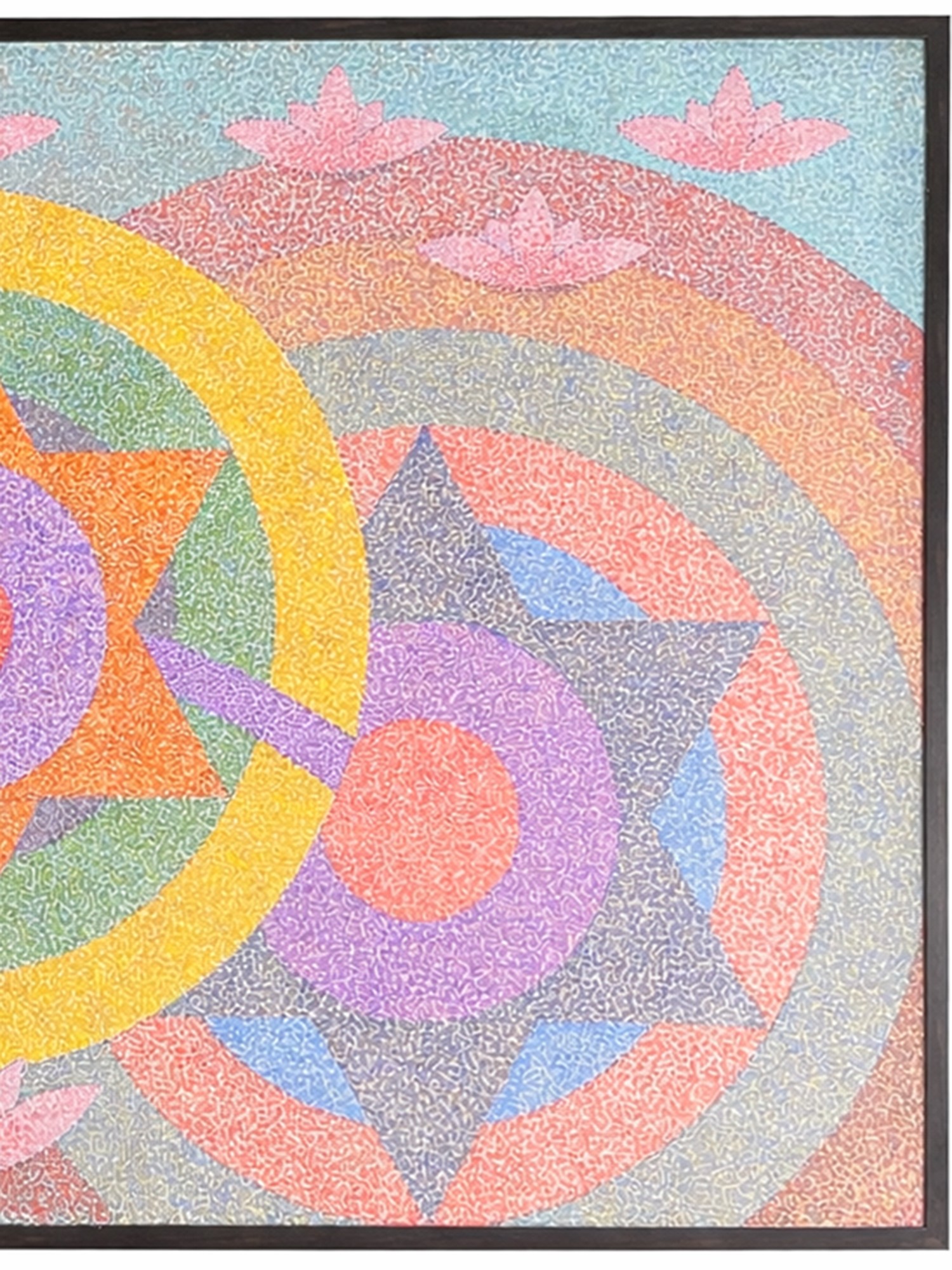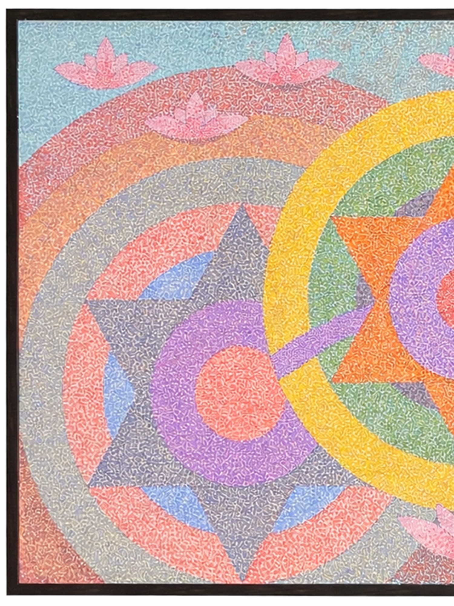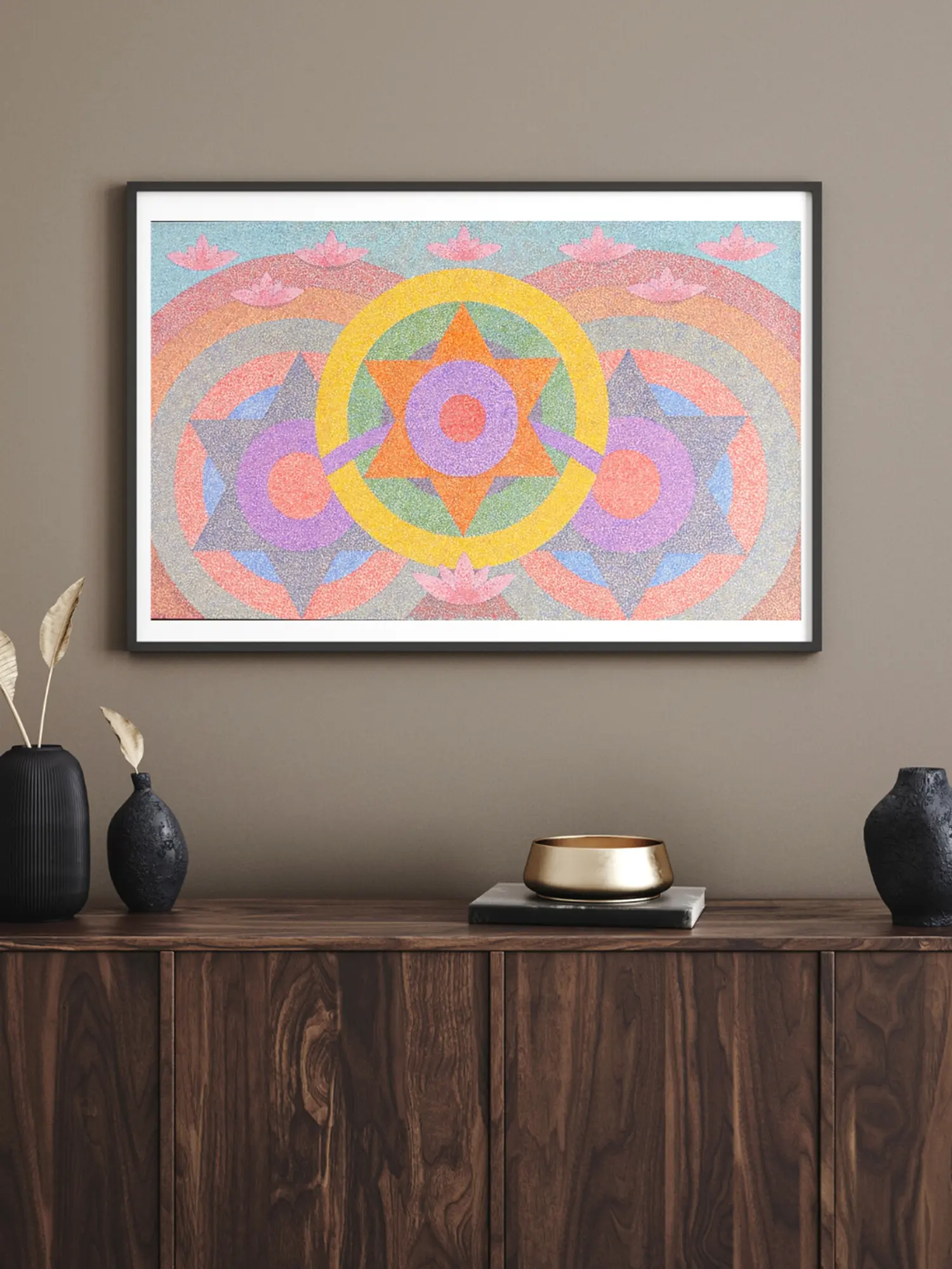 The composition unfolds with a breathtaking symmetry, featuring concentric circles and starbursts that evoke a sense of cosmic order. A luminous yellow halo embraces a central, multi-pointed star, radiating energy outwards through a spectrum of calming hues. Delicate lotus blossoms emerge from the gentle curves of the background, symbolizing purity and spiritual growth.