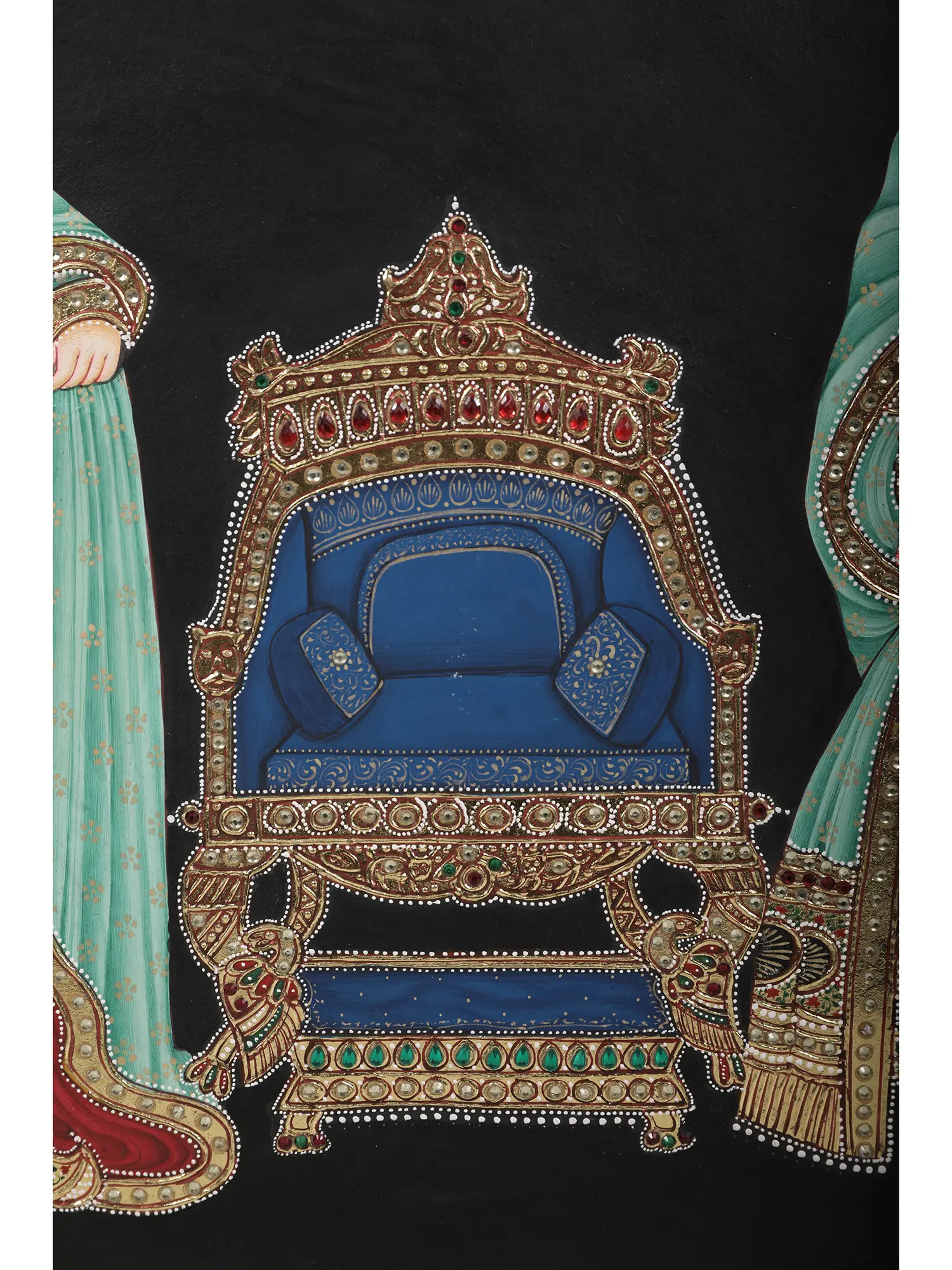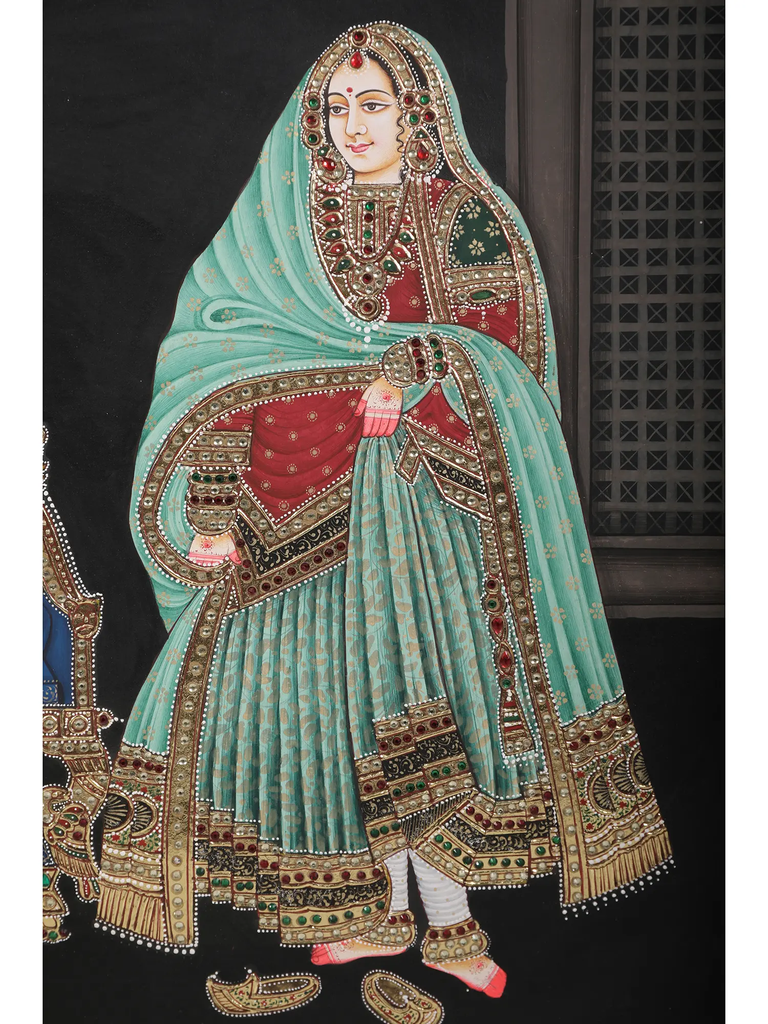 This exquisite painting by Kailash Chandra transports you to a realm of royal splendor, capturing the timeless elegance of a prince and princess in their resplendent attire. The meticulous detail and vibrant natural colors bring to life a scene reminiscent of ancient Indian courts, where love stories unfolded against a backdrop of opulent palaces and rich traditions. The prince, adorned in a flowing teal jama and elaborate headgear, stands proudly beside his princess, whose graceful posture and shimmering gown exude refined beauty. The artist's mastery is evident in the intricate inlay work, each gemstone meticulously placed to enhance the regal ambiance. The dark background subtly highlights the figures, drawing the viewer's eye to the captivating details of their attire and the majestic throne that serves as a silent witness to their love. This piece is not merely a painting; it is a window into a bygone era, a narrative etched in color and texture.
