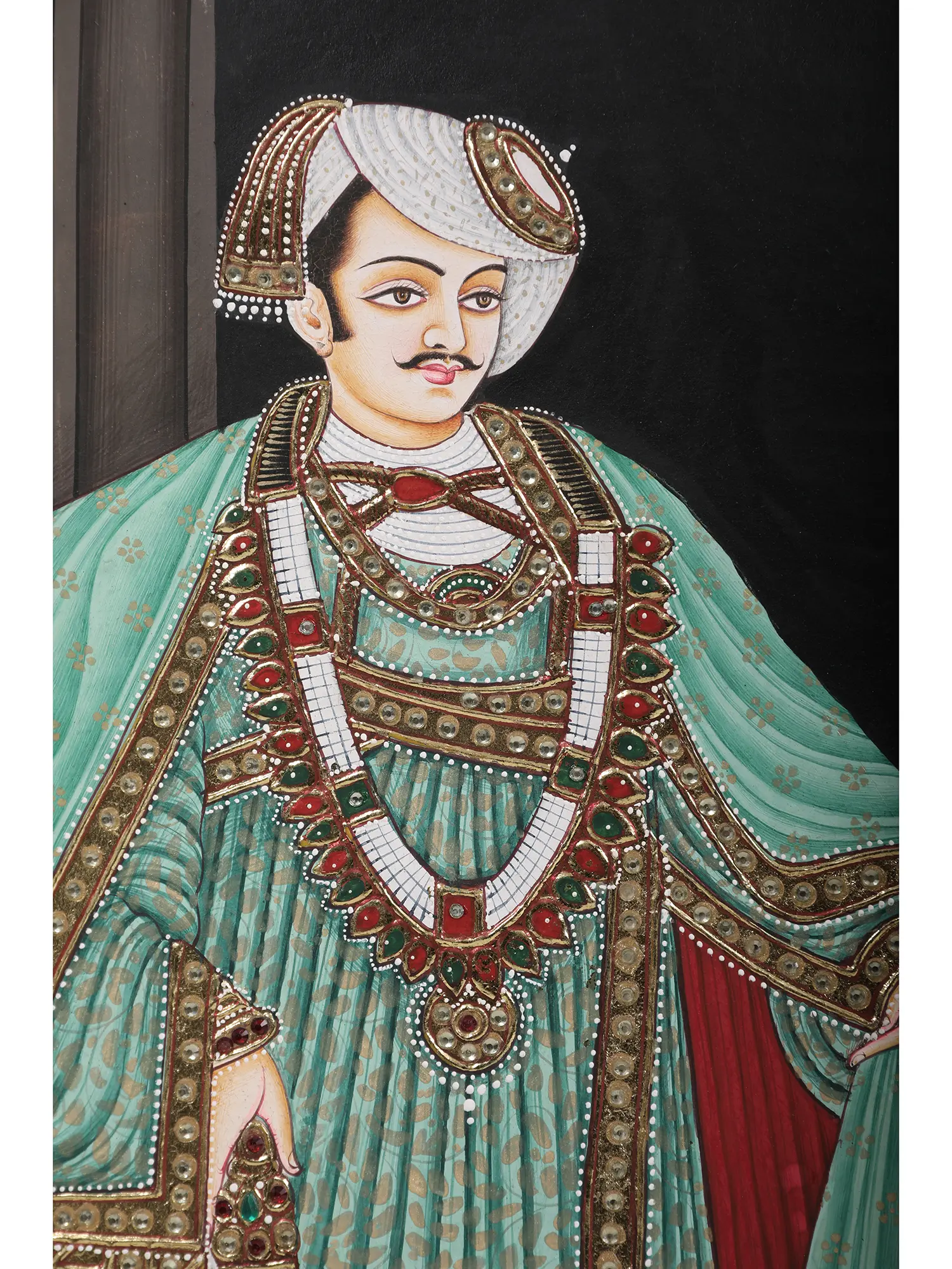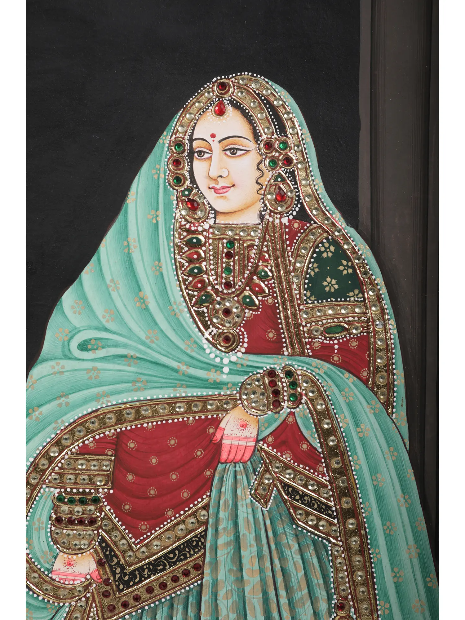 This stunning 22" x 28" artwork is a perfect addition to any discerning art collector's portfolio. The size is ideal for making a statement without overwhelming a space. Its vibrant colors and rich detailing make it a conversation starter, sure to captivate your guests. The intricate inlay work elevates this painting from simple depiction to a luxurious masterpiece. Whether displayed in a formal living room, a study, or an art gallery setting, this painting will bring an aura of refined elegance and timeless beauty to its surroundings. The combination of artistry, cultural significance, and high-quality craftsmanship makes this piece a truly special find, a timeless treasure for generations to come. Embrace the artistry and elegance of this remarkable work, a piece that seamlessly blends the splendor of history with the beauty of contemporary craftsmanship.