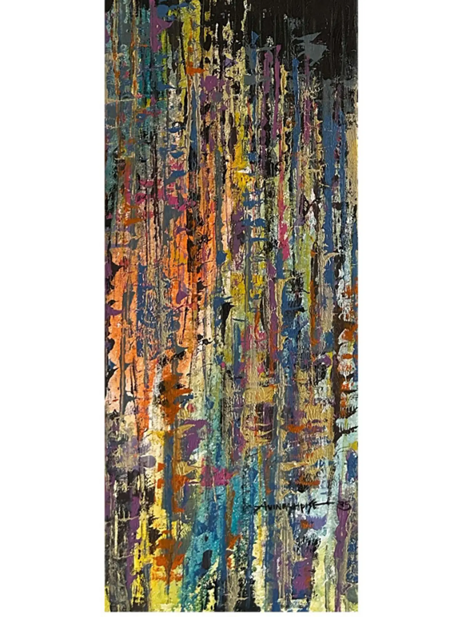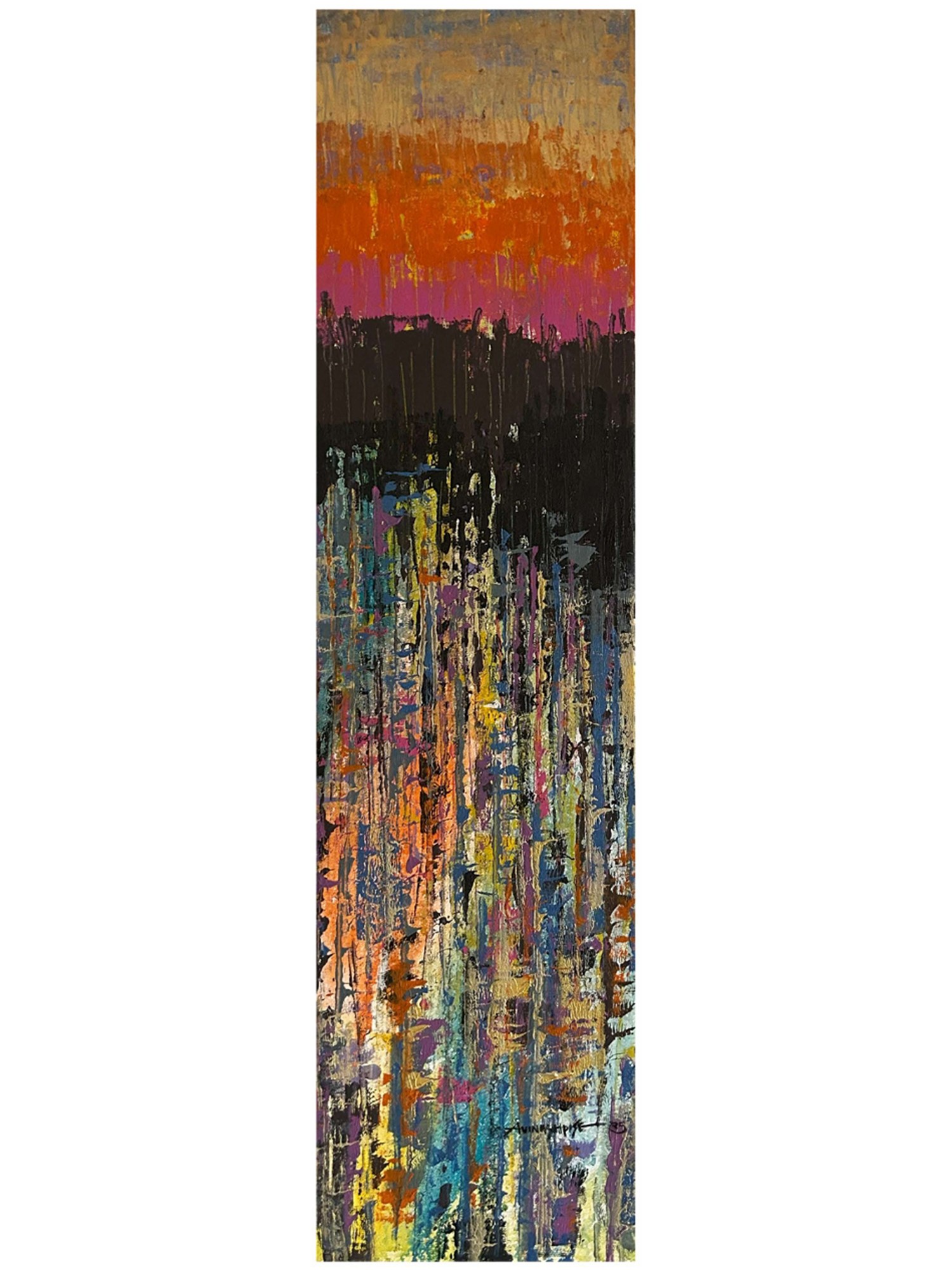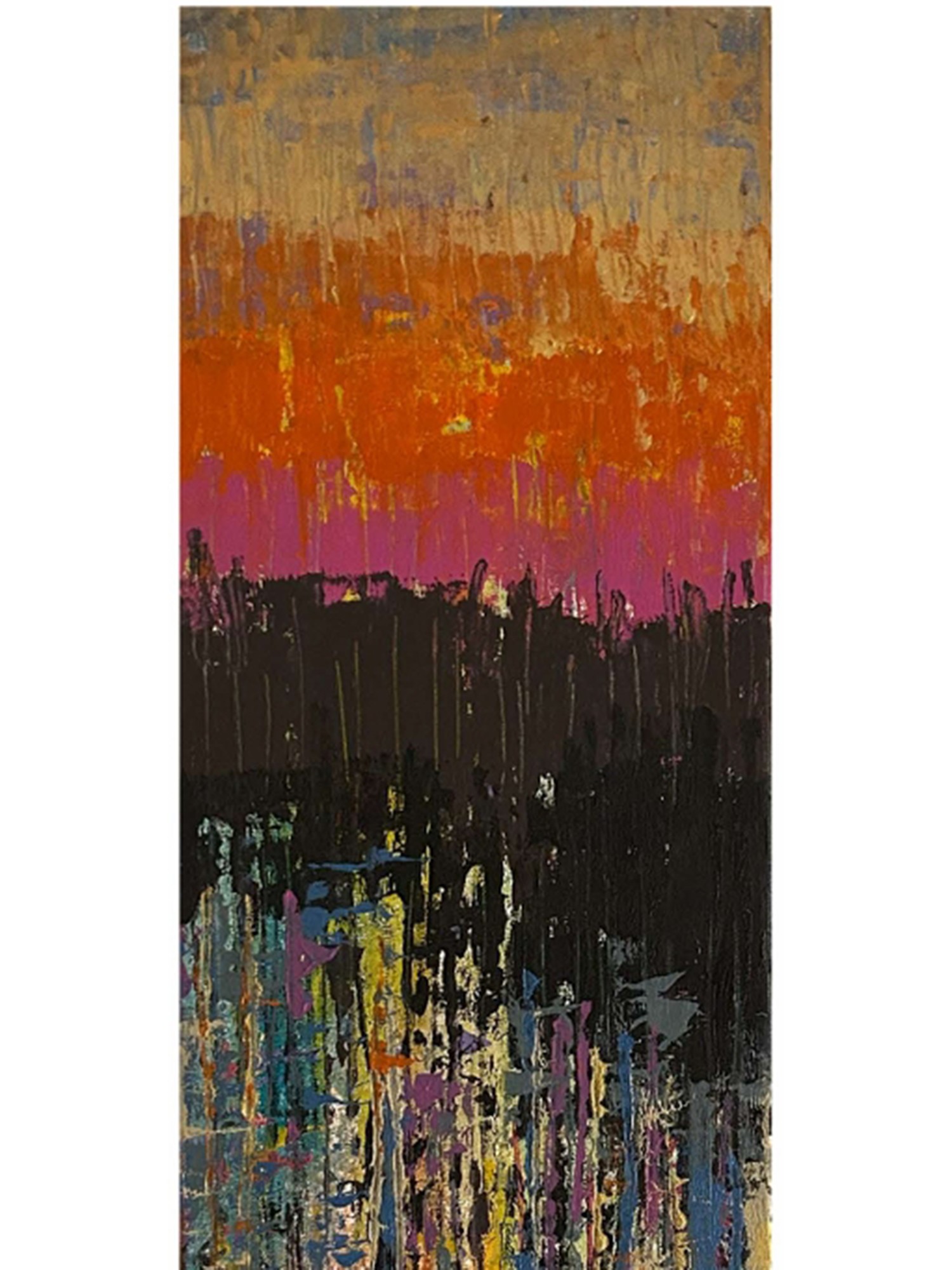 Standing at 48 inches in height and 12 inches in width, this artwork commands attention without overwhelming your space. The composition unfolds in distinct yet harmonious bands of color, moving from the soft, earthy tones at the top to an intense fiery orange, a deep, mysterious black, and finally a cascade of vibrant, jewel-toned strokes below. Each section offers a new discovery, drawing you into a complex interplay of light, shadow, and form that invites repeated viewing.