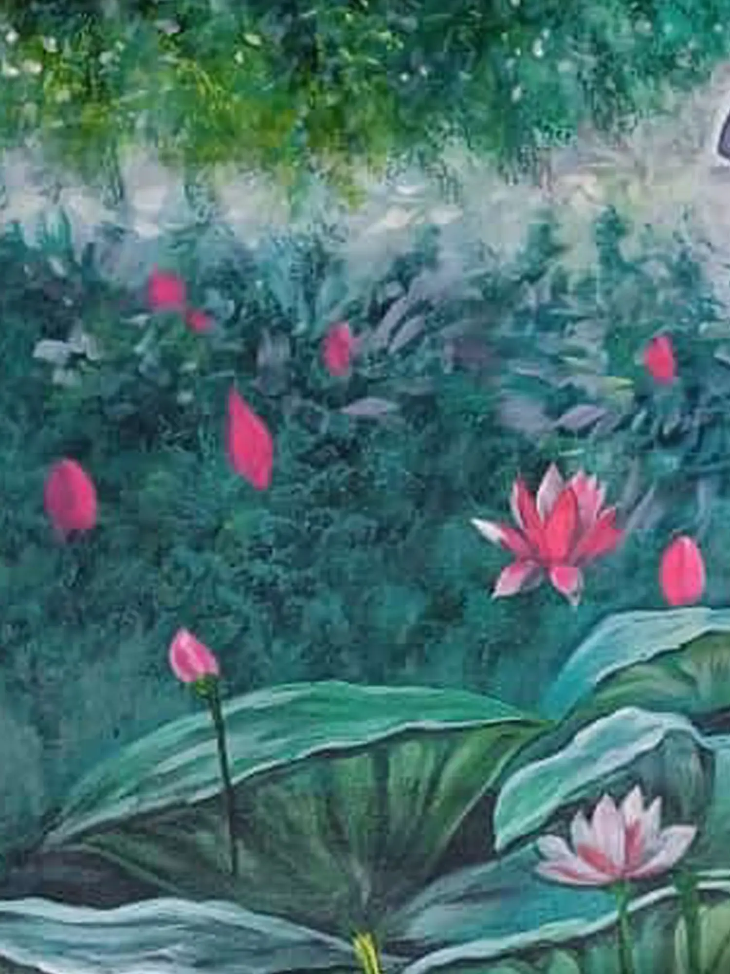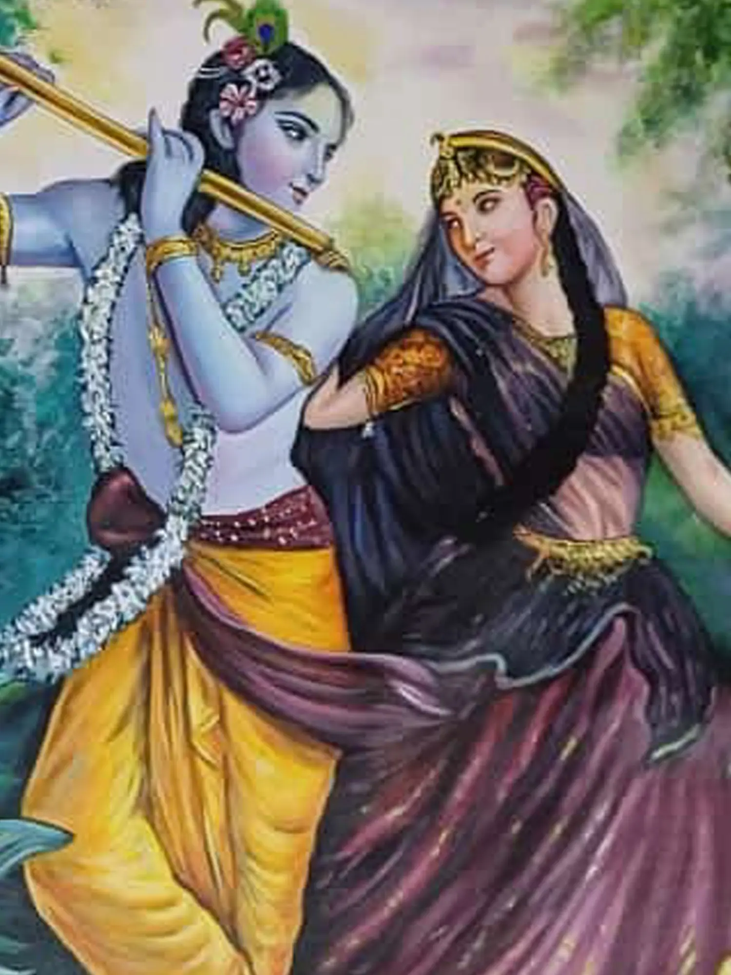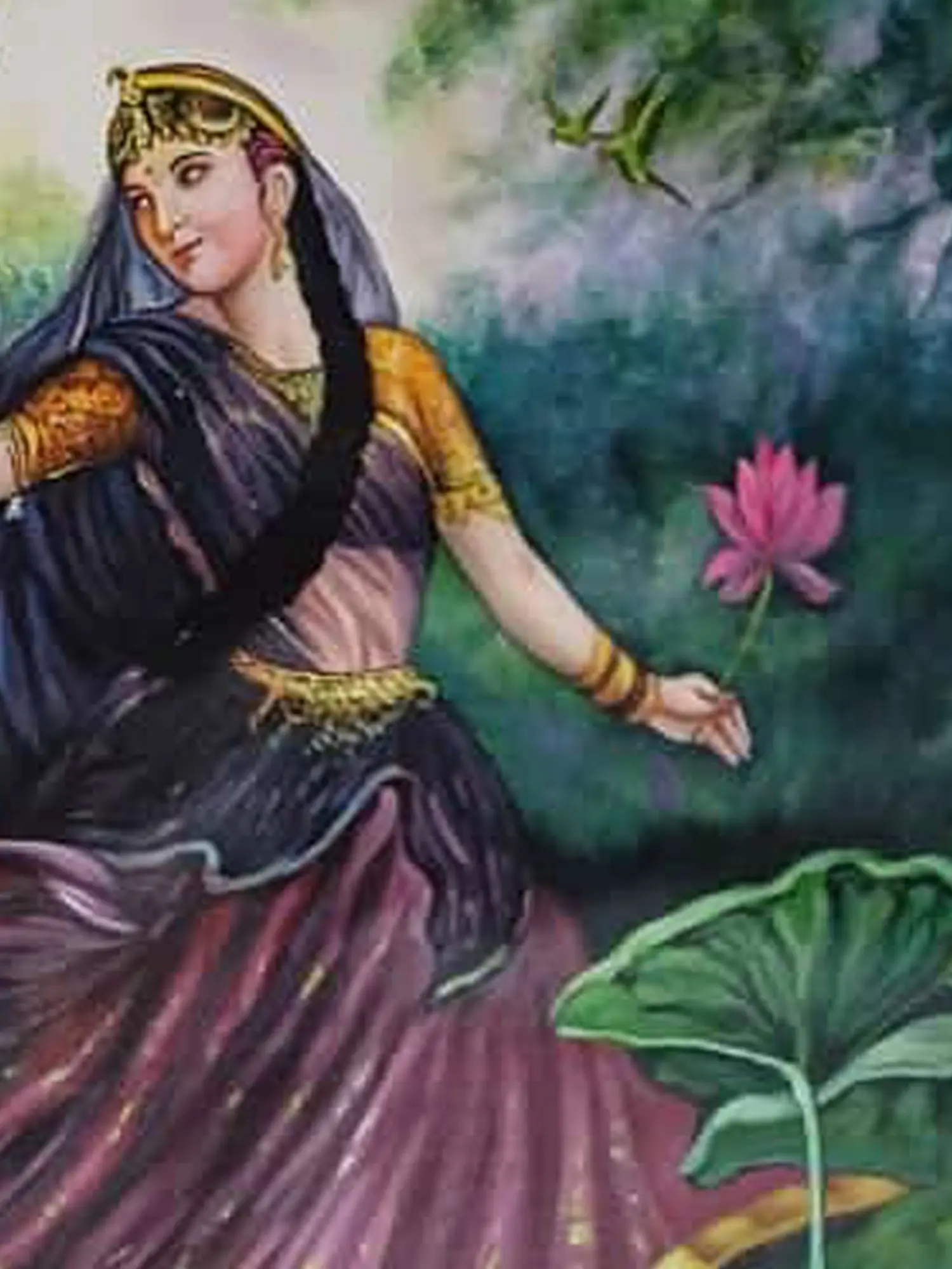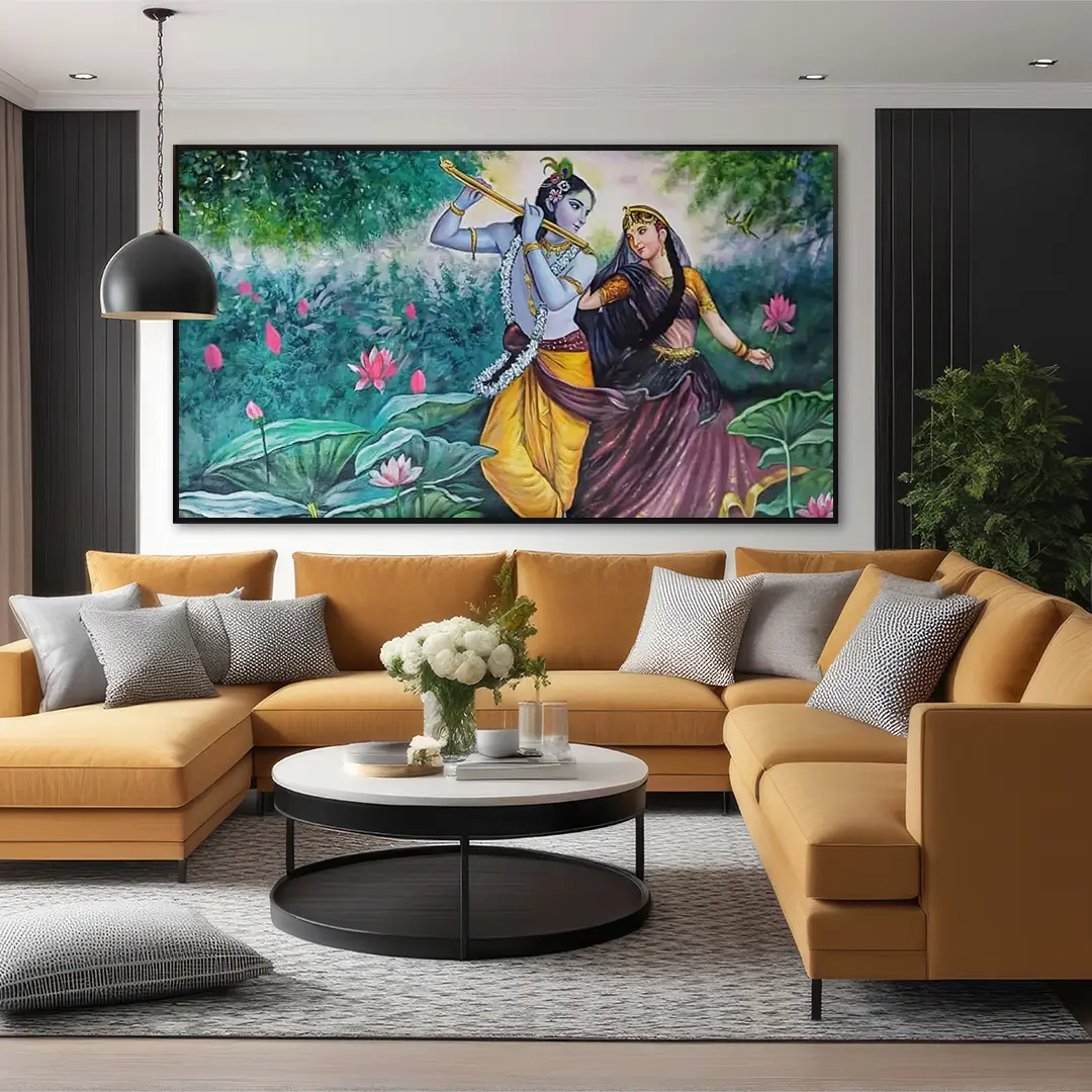 Nature blooms mirroring the beauty of Indra’s heaven, when Radha-Krishna nourishes Vrindavan with their Prema-Lila (divine plays of love). In this oil painting, Radha and Krishna are beautifully presented, in the heart of the forests of Vrindavan, with their surroundings populated by blossoming lotus flowers, symbols of purity, love, and youthfulness. The blue-skinned Krishna, in his Pitambara (yellow garment) and Vaijayanti mala (garland of flowers), blows his flute as he gazes affectionately at Radha. Radharani is attired in a lovely lehenga-choli and holds a lotus as delicate as herself while striking an animated posture. Parrot pair, a symbol of romance and passion flutter in the background of the painting, which brims with the beauty of Radha-Krishna.