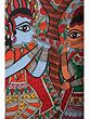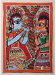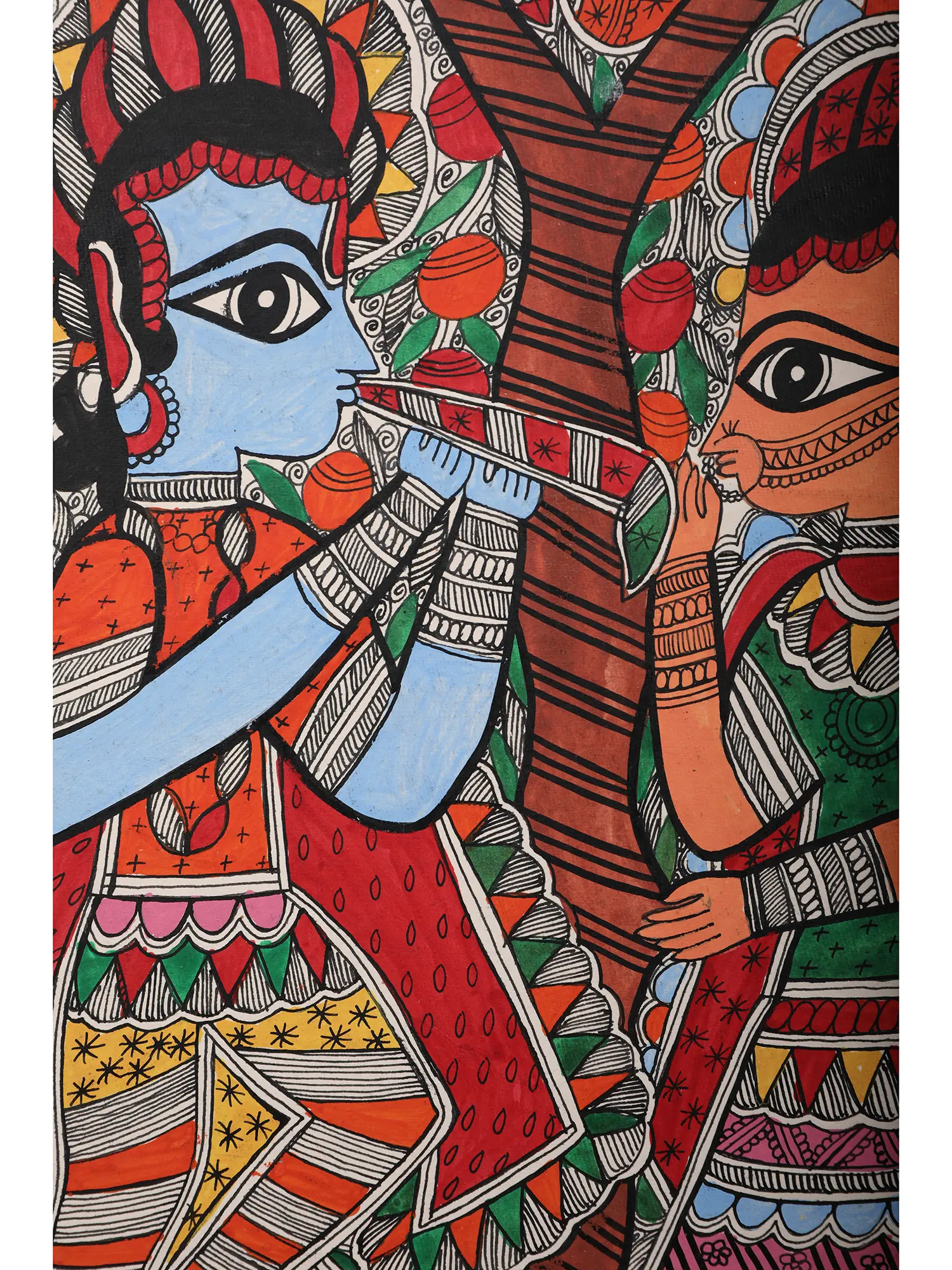 This enchanting artwork, crafted on handmade paper, portrays Krishna playing his flute for Radha, his beloved. Their love story is a cherished allegory in Hinduism, symbolising the yearning of the soul for the divine. The artist's use of soft colours and flowing lines creates a sense of intimacy and devotion.
