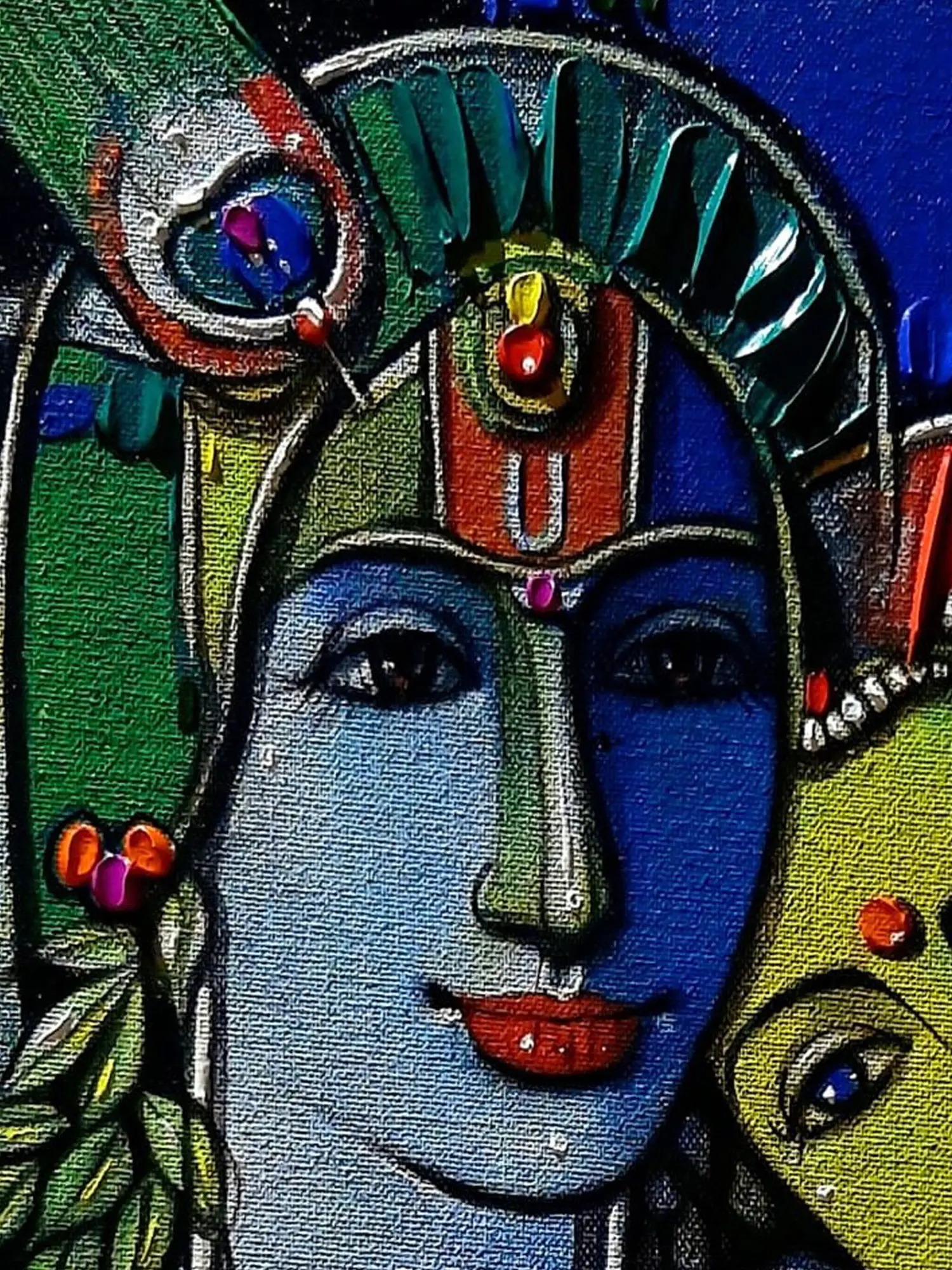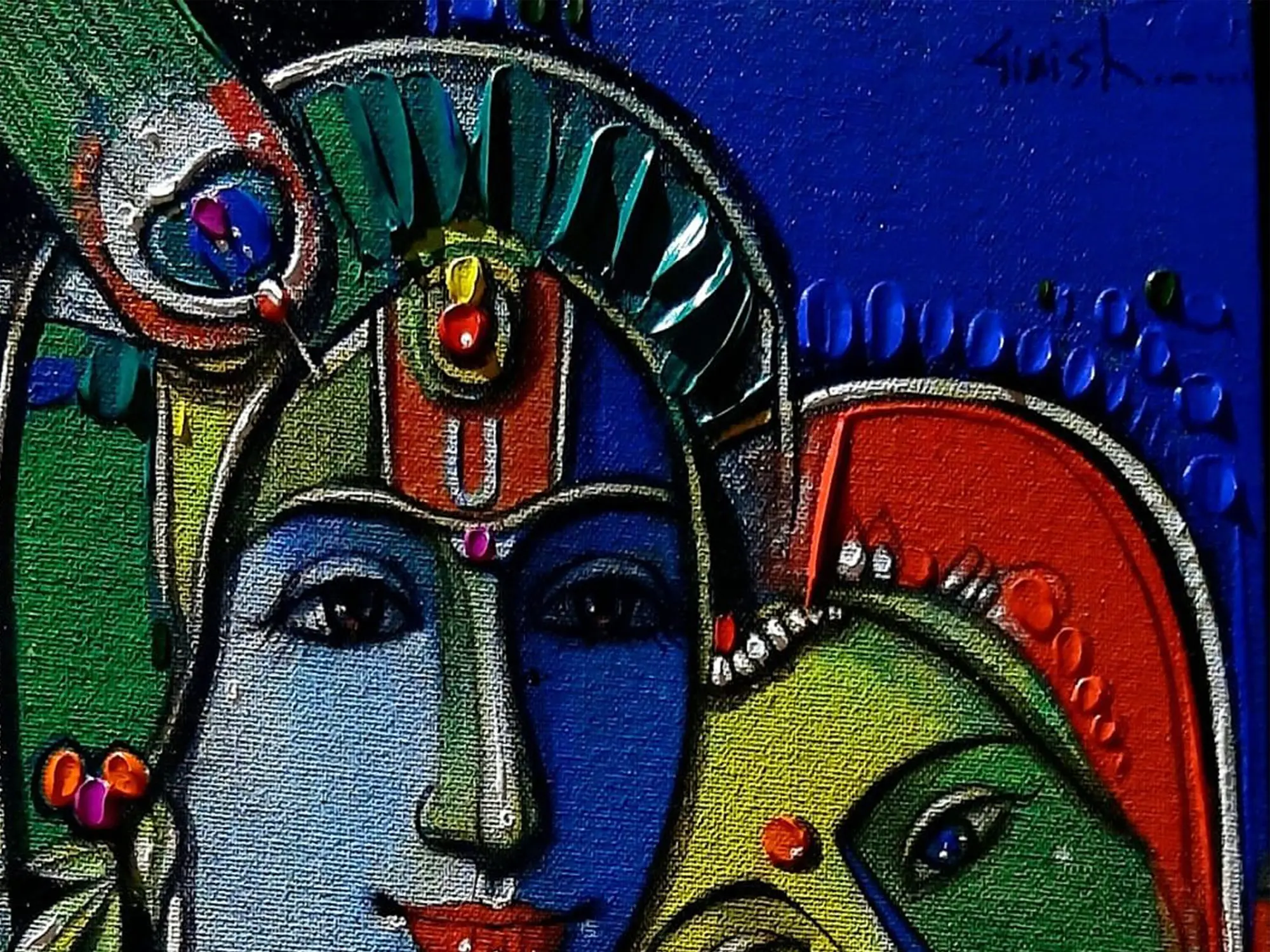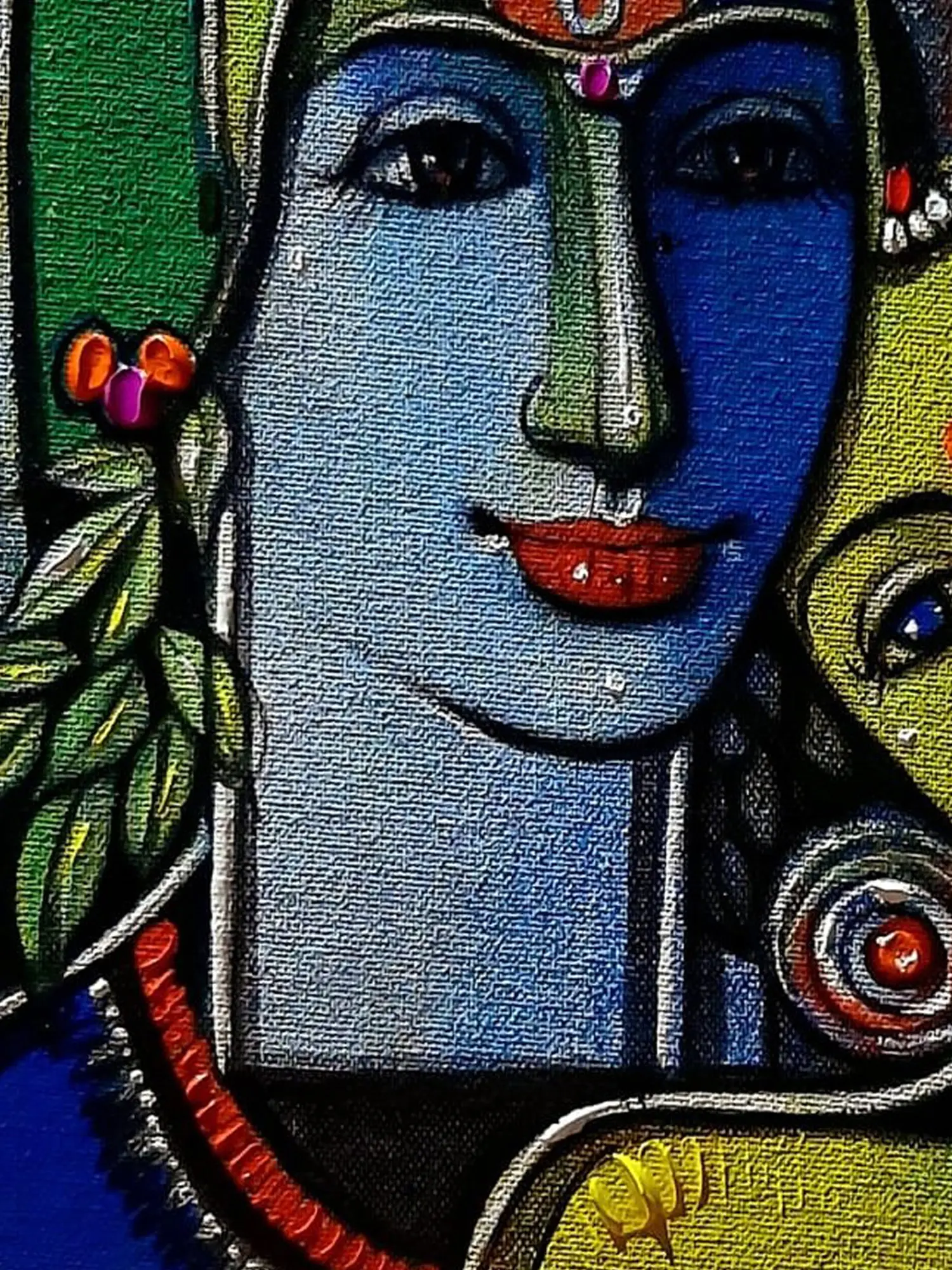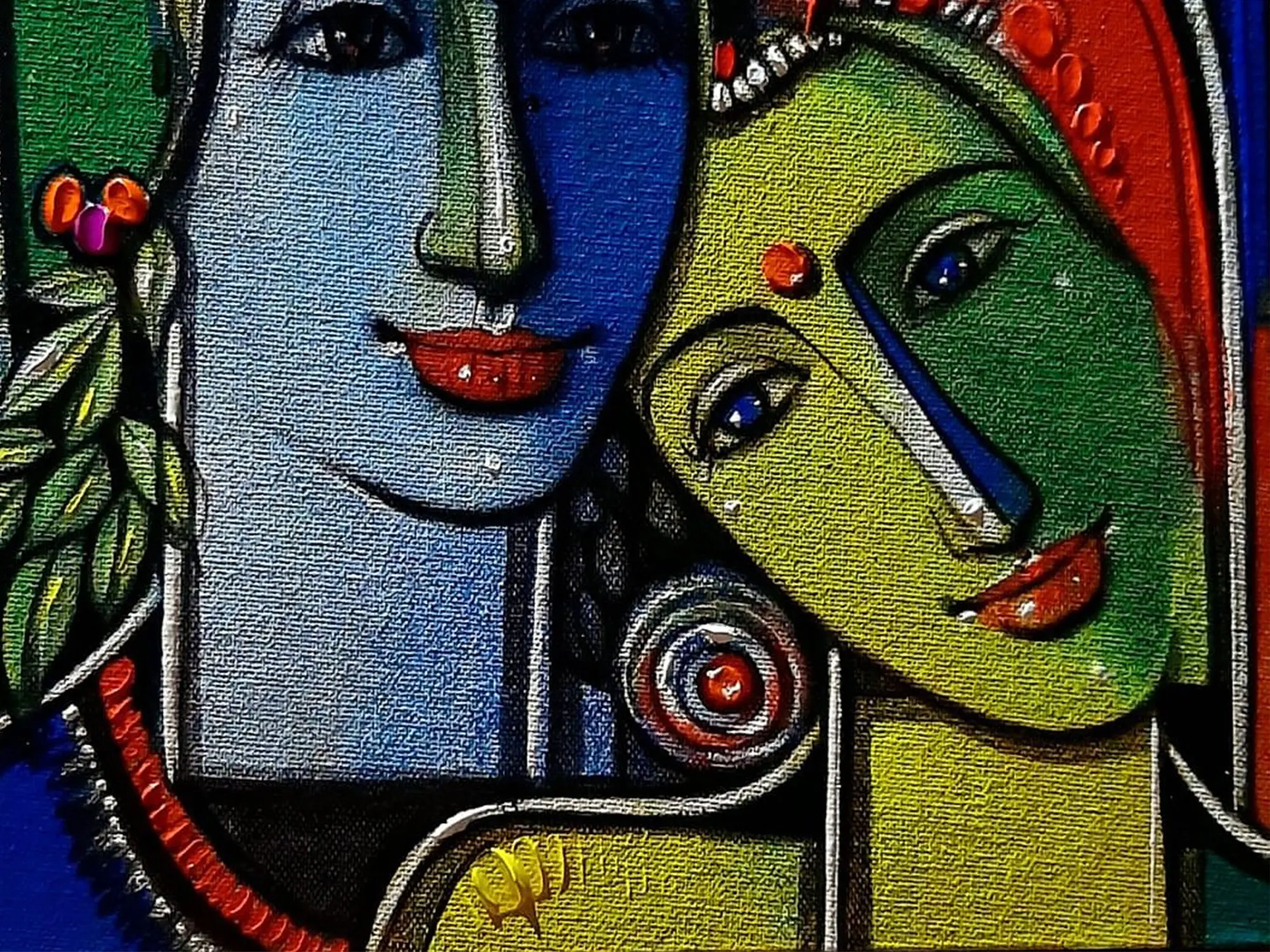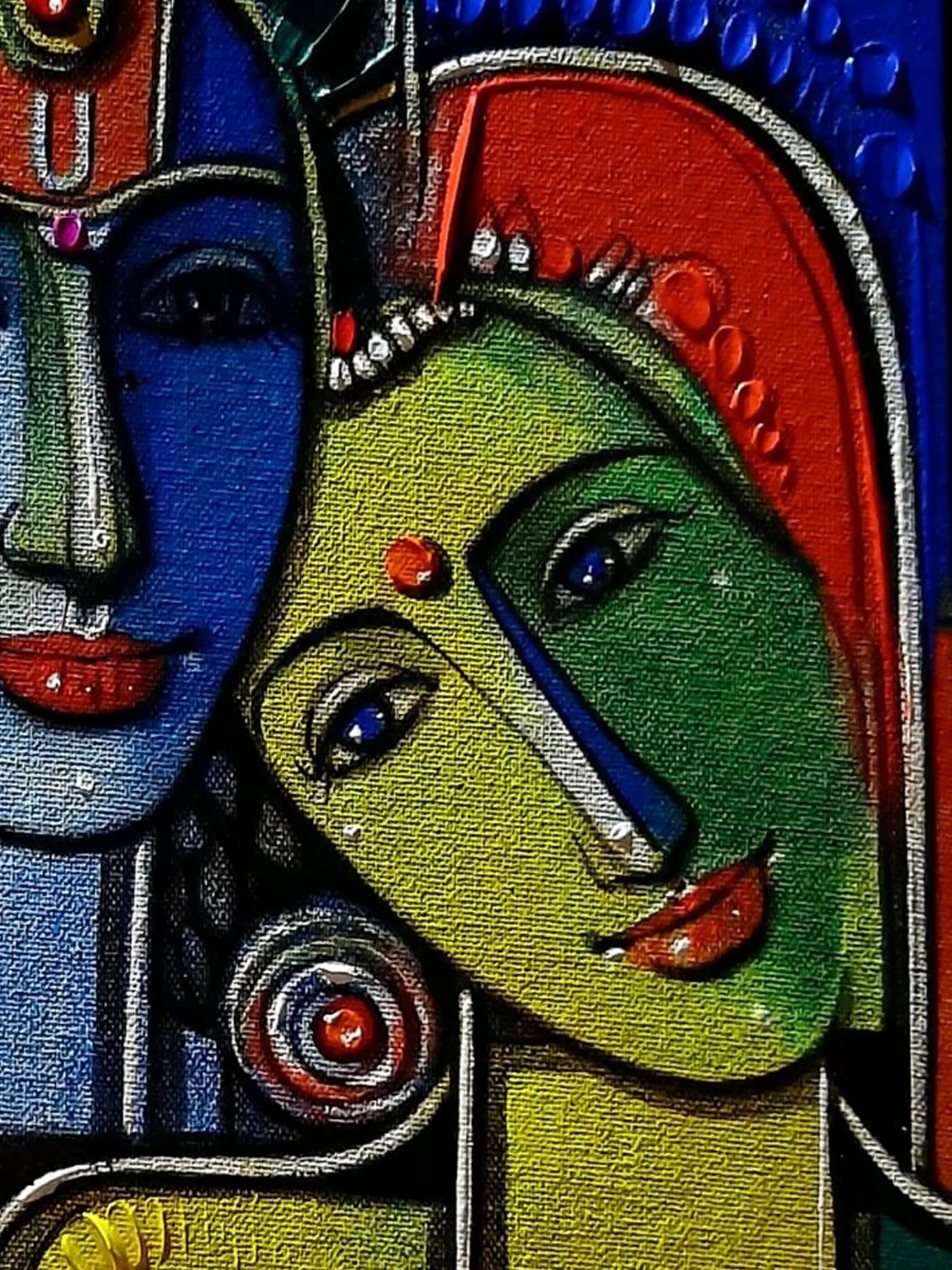 The divine love of Radha and Krishna is immortalised in this captivating painting, where eternal devotion flows. With ethereal hues and graceful forms, the artwork captures the essence of divine romance and spiritual union. Radha's adoring gaze meets Krishna's divine presence, evoking the timeless saga of love and transcendence. Through its emotive imagery and poetic resonance, the painting invites viewers to behold the timeless majesty of Radha-Krishna's divine love.