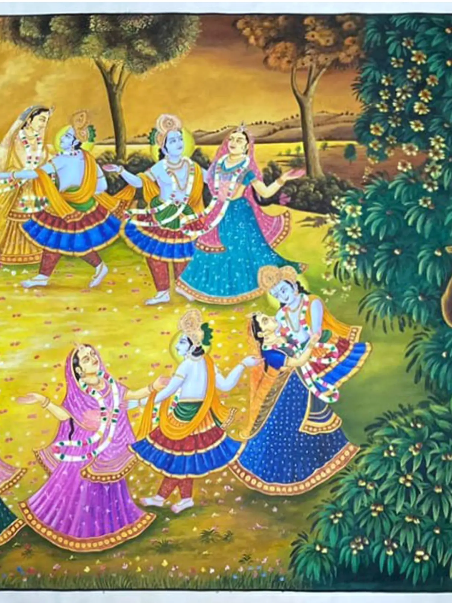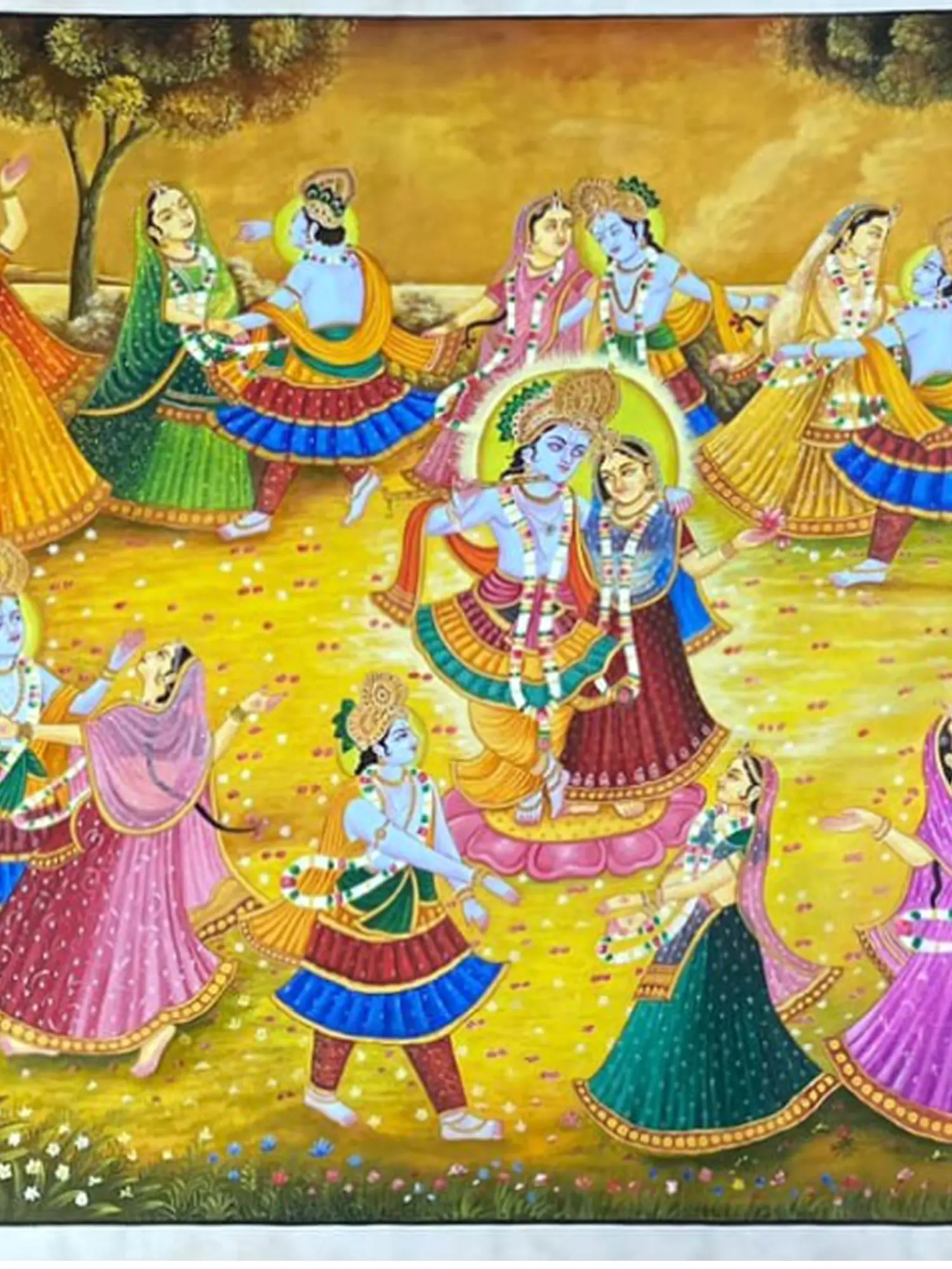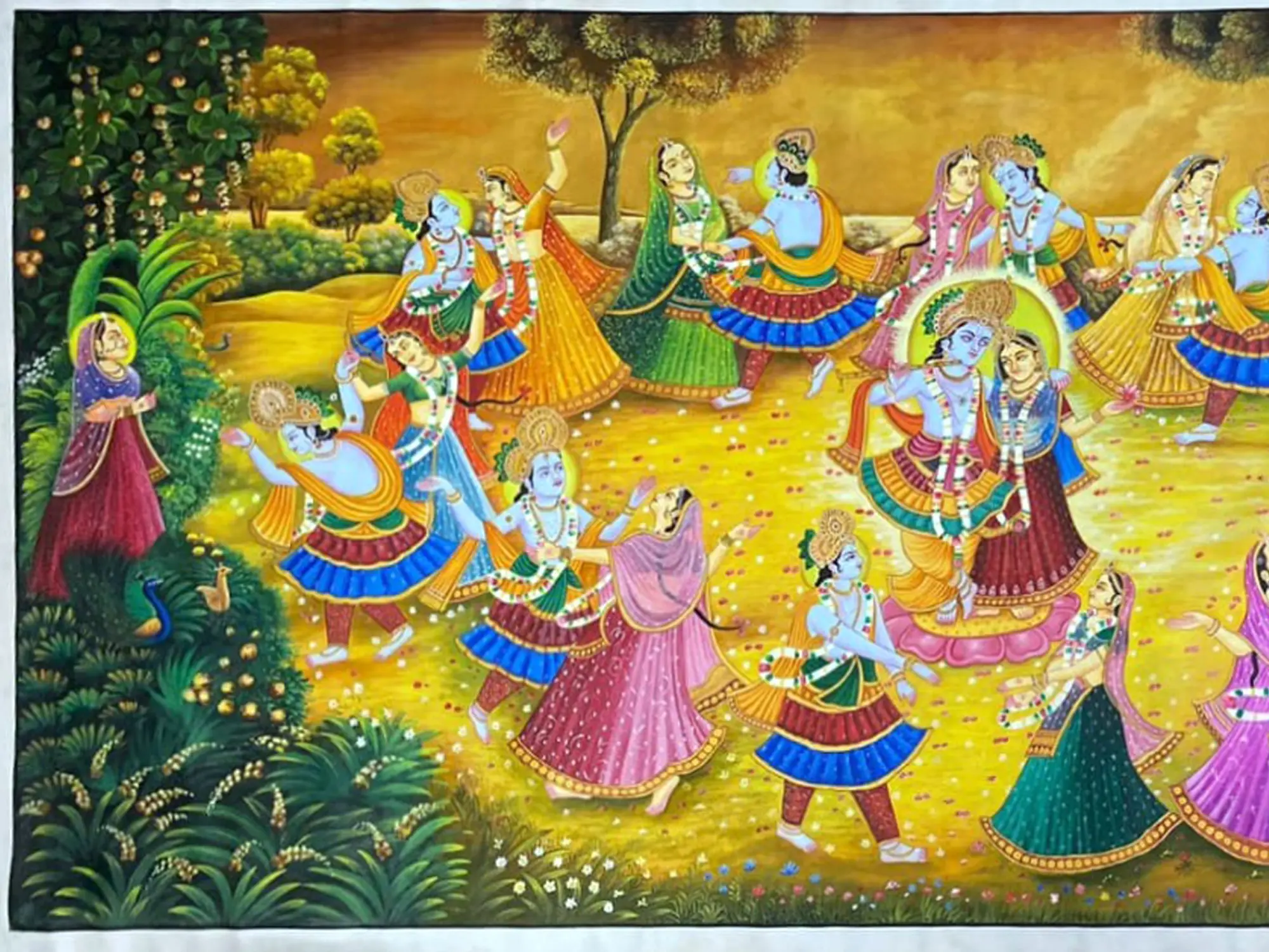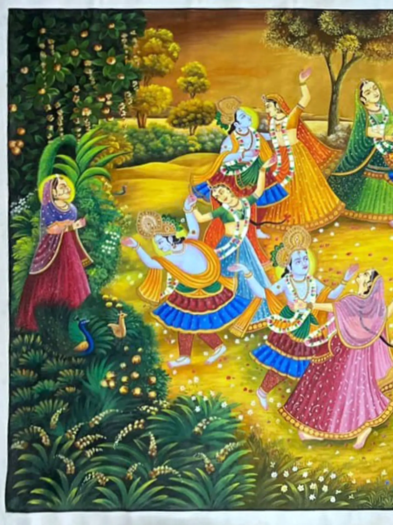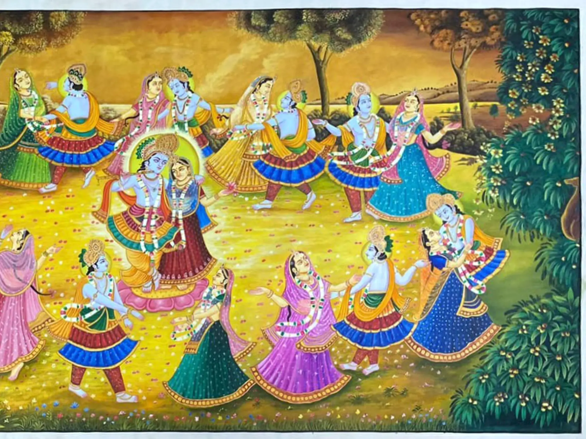 The expansive canvas, measuring an impressive 48 inches in height and 96 inches in width, is alive with the depiction of the divine dance. Figures are rendered with an exquisite delicacy, their garments flowing in harmonious movement. Observe the intricate patterns adorning the attire, the expressive gestures of the dancers, and the ethereal glow that emanates from the central figures. The lush, verdant surroundings, dotted with trees and delicate flora, frame the sacred scene, enhancing its otherworldly charm.