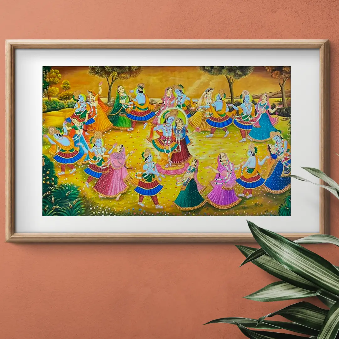 This scene draws inspiration from the revered Raasleela, the transcendental dance of Lord Krishna with the cowherd maidens (Gopis) in Vrindavan, as chronicled in ancient Hindu scriptures. It is a visual representation of supreme love, spiritual ecstasy, and the soul's longing for the divine. The very act of its creation connects you to a rich cultural heritage, celebrating narratives that have inspired devotion and contemplation for millennia.