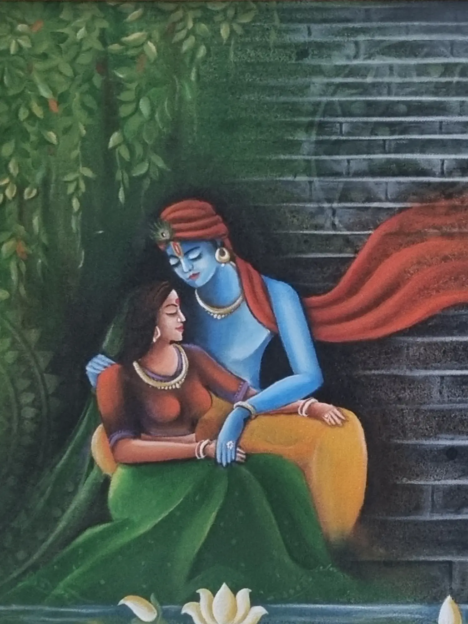 Against the backdrop of vegetation that blooms nourished by their presence, Radha and Krishna appear immersed in the sweetness of each other. The cloth of Krishna’s beautiful red pagdi (headgear) sways over the stairs, bringing a dramatic splash of color to the canvas. Mandalas that represent the cosmos and time are painted with faint brush and deep colors on the left side, the upper section on the stair, and in the foreground, surrounding Radha Krishna in their profound symbolism, and reiterating their love that is beyond cosmic rules and time.