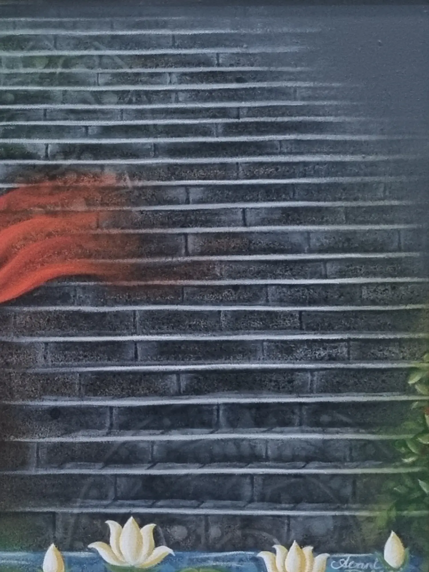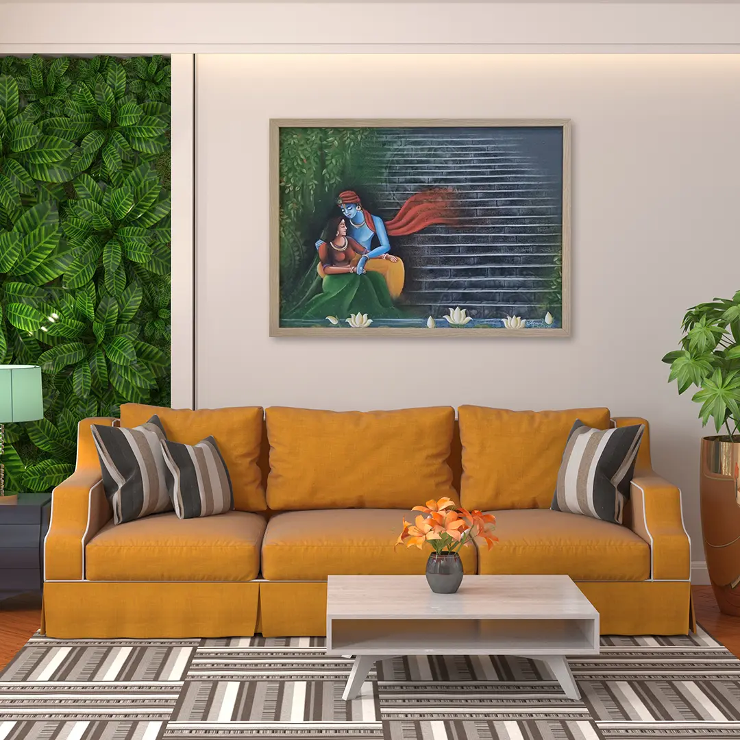 When asked what inspired her to draw this mesmerizing acrylic on canvas, Avani Mayank Desai shared a tale of Krishna, who was asked why He and Sri Radha are not married. Sri Krishna replied smilingly that marriage happens between two people. He and Radha are not two, but one, a single being and soul, who do not require to be tied in worldly bonds. A delicate and aesthetically charming celebration of the Prema of Radha Krishna which is beyond this world, the painting “Radha-Madhav” depicts the duo embracing each other, on the banks of Yamuna, surrounded by a celestial tranquility. White lotuses, the symbols of purity bloom in the foreground of the painting.